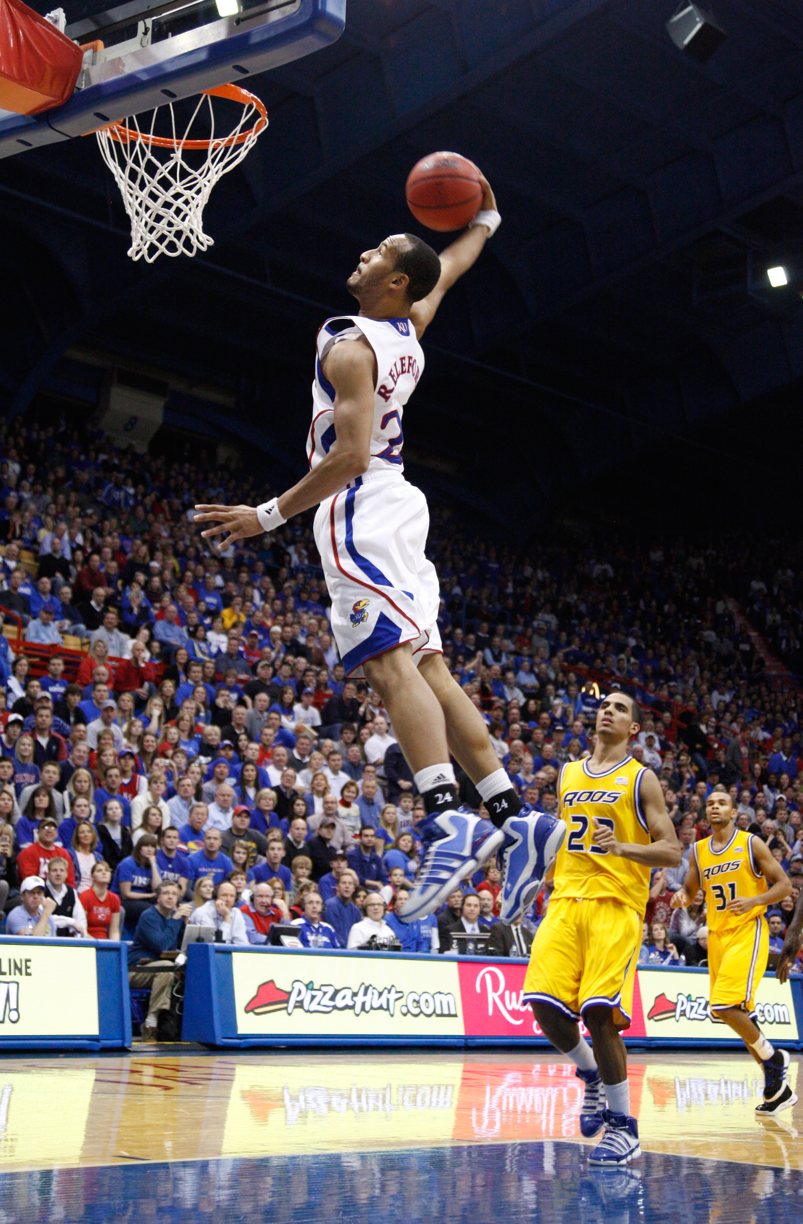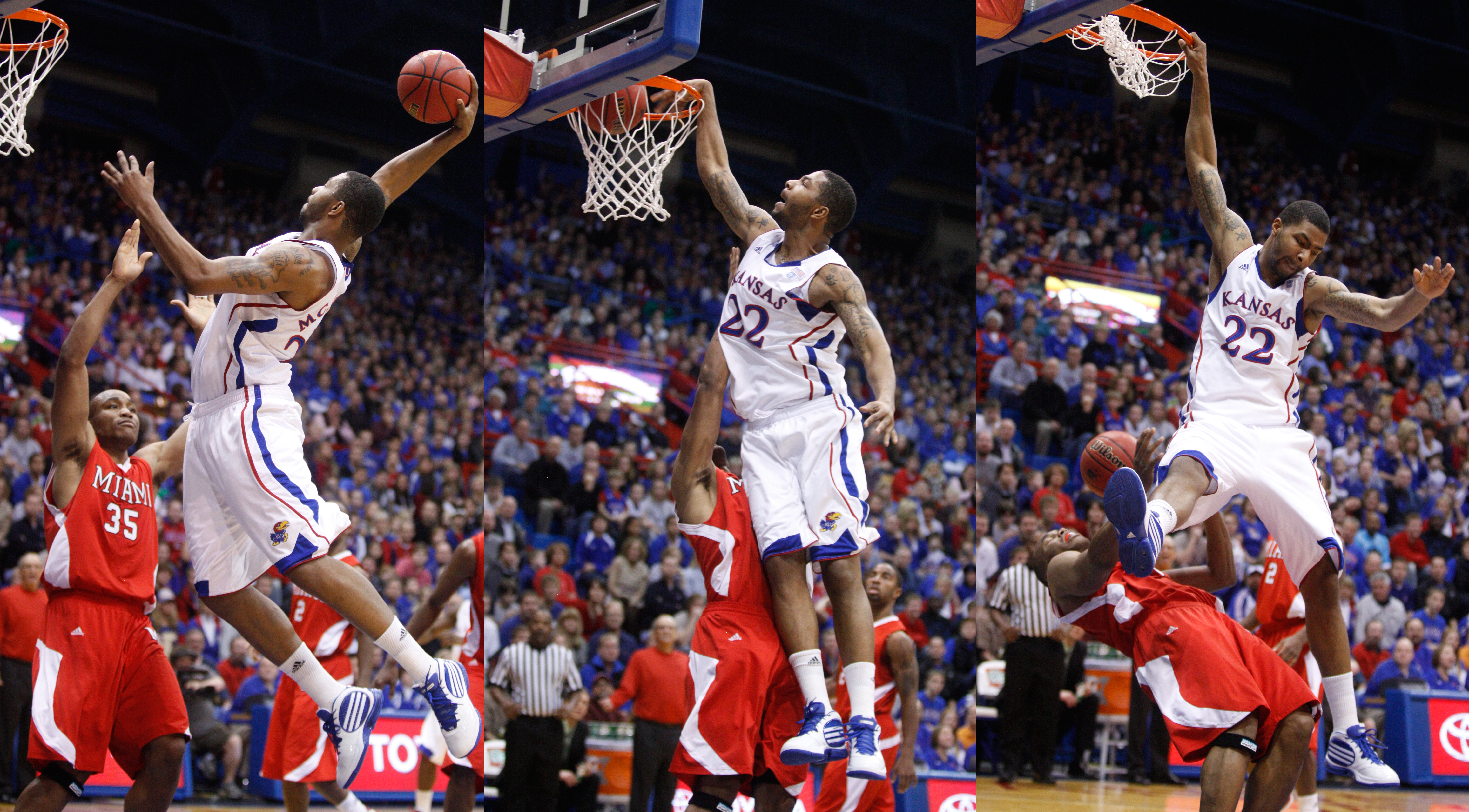 In this sequence of images, Kansas forward Marcus Morris finishes a high-flying dunk and gets the foul from Miami (Ohio) University guard Antonio Ballard during the first half, Sunday, Jan. 2, 2011 at Allen Fieldhouse.