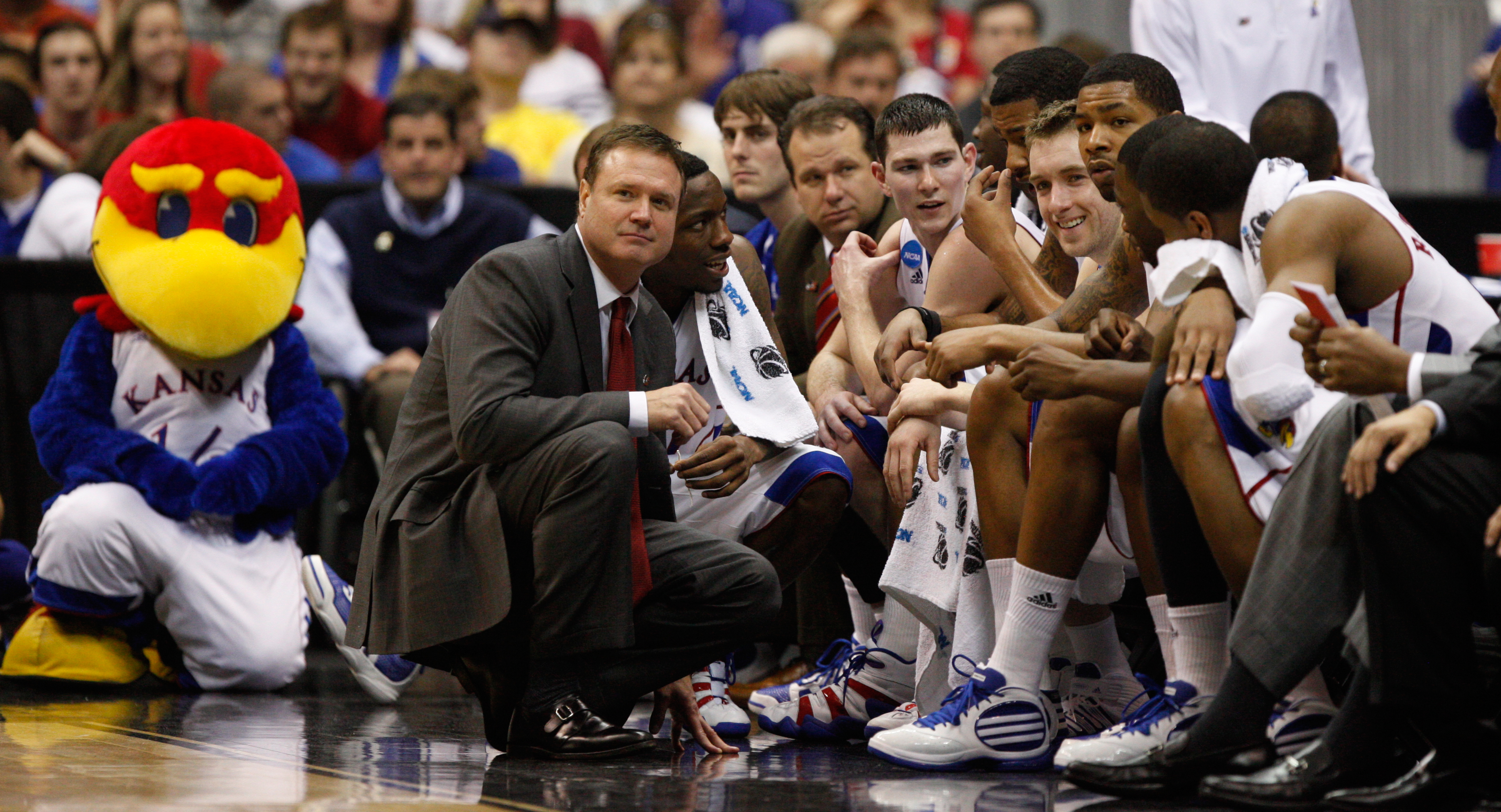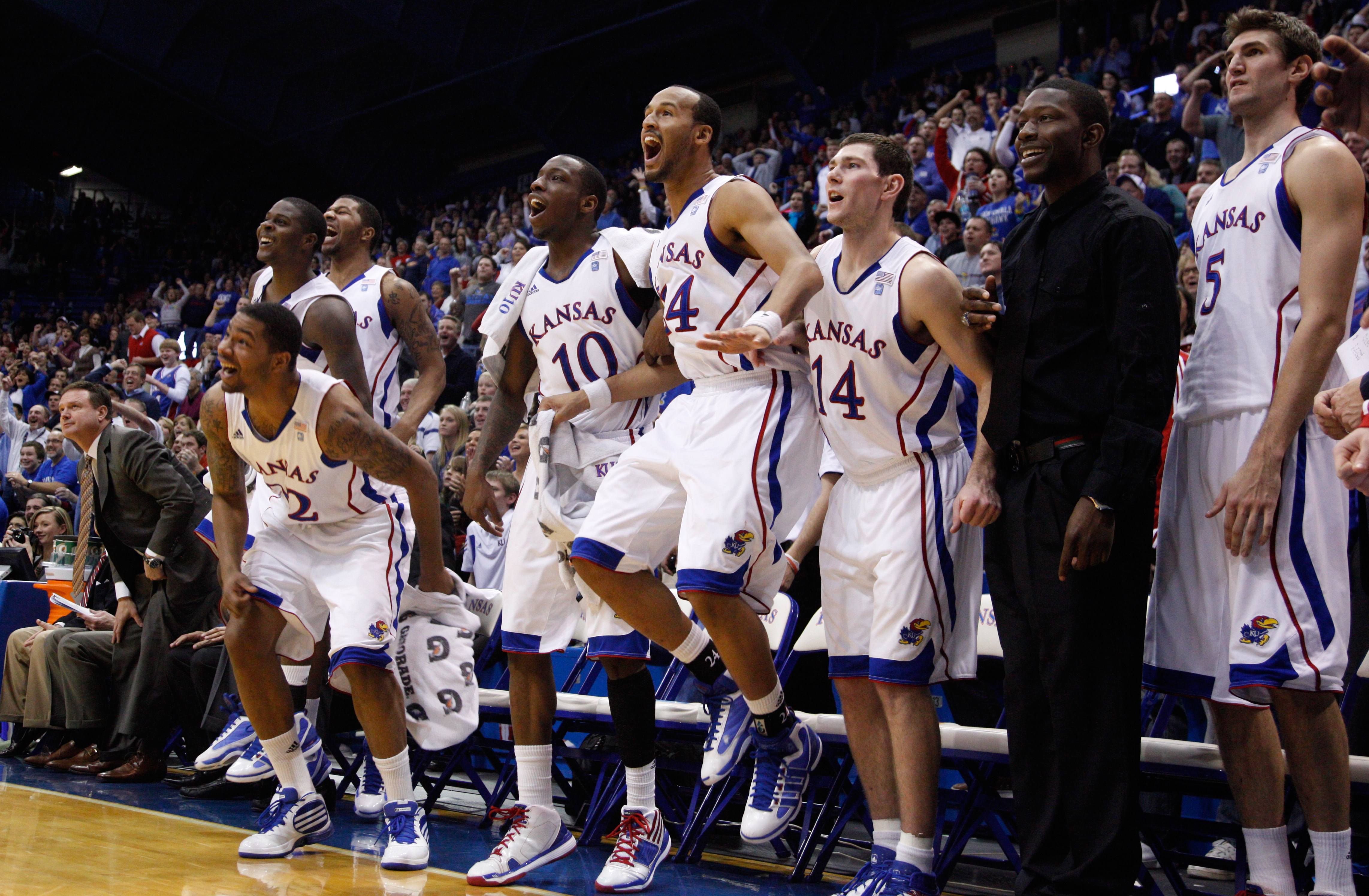 The Kansas bench and head coach Bill Self included, gets up with anticipation as the Jayhawks try to break 100 points against UMKC during the second half on Wednesday, Jan. 5, 2011 at Allen Fieldhouse. The 'Hawks narrowly missed the mark defeating the 'Roos 99-52.