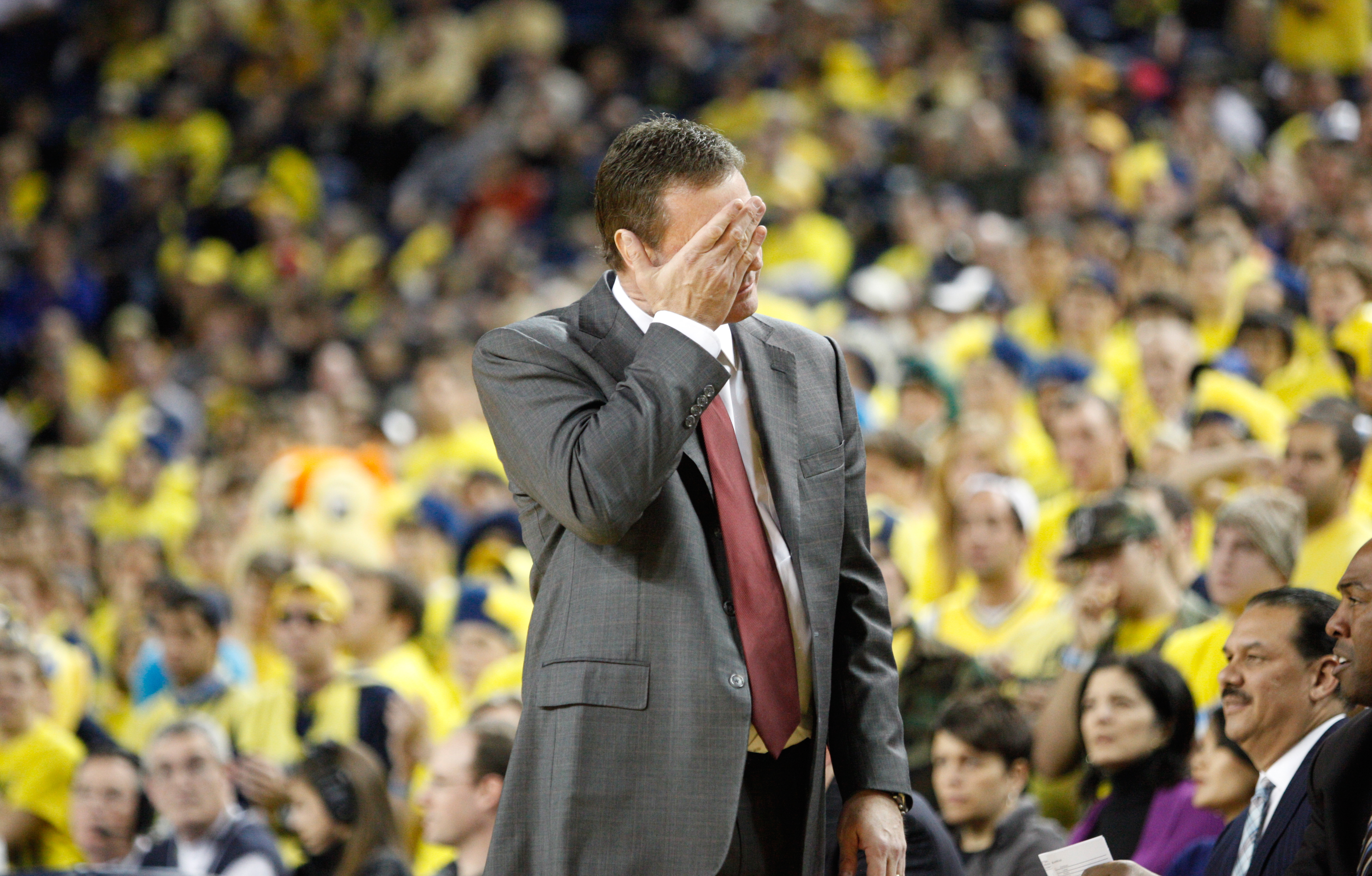 Kansas head coach Bill Self wipes his face after a Jayhawk turnover during the second half on Sunday, Jan. 9, 2011 at Crisler Arena.