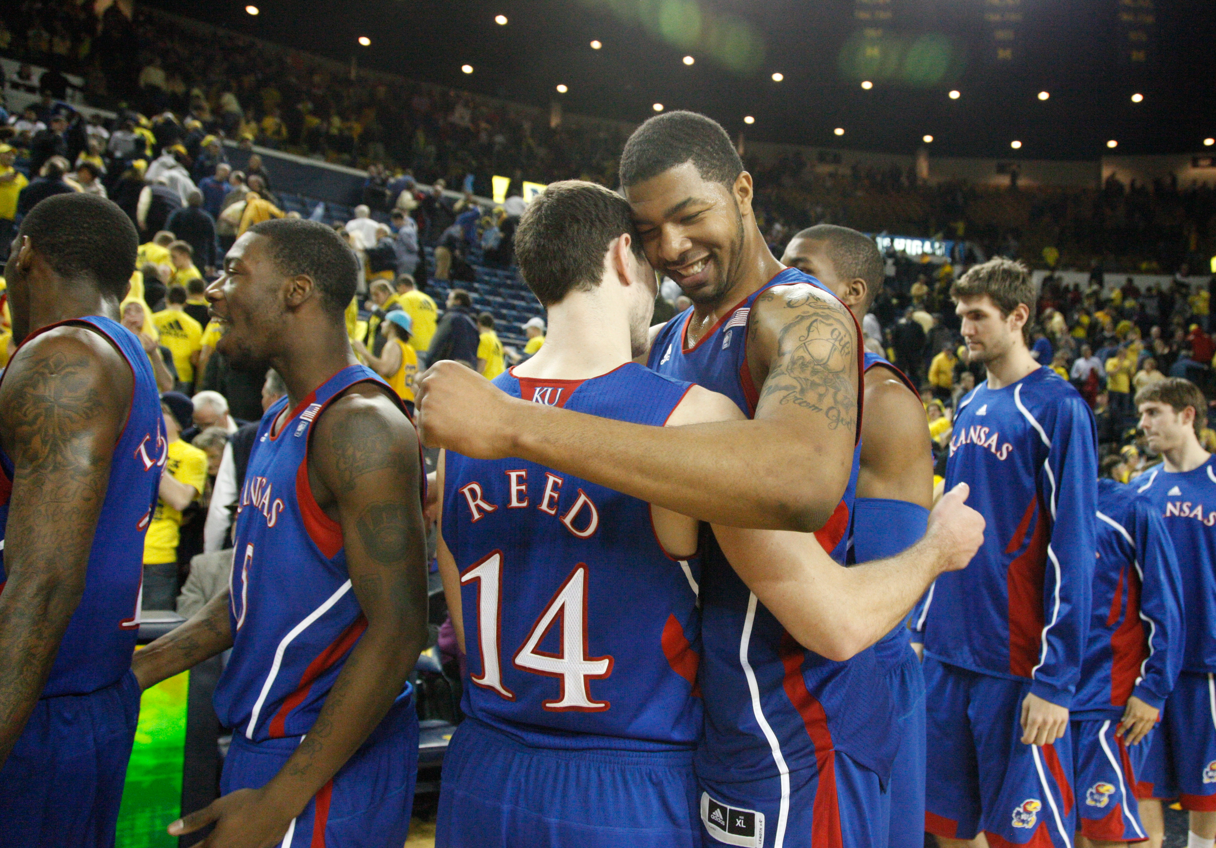 Kansas forward Markieff Morris hugs teammate Tyrel Reed after holding off Michigan for a 67-60 overtime win on Sunday, Jan. 9, 2011 at Crisler Arena.