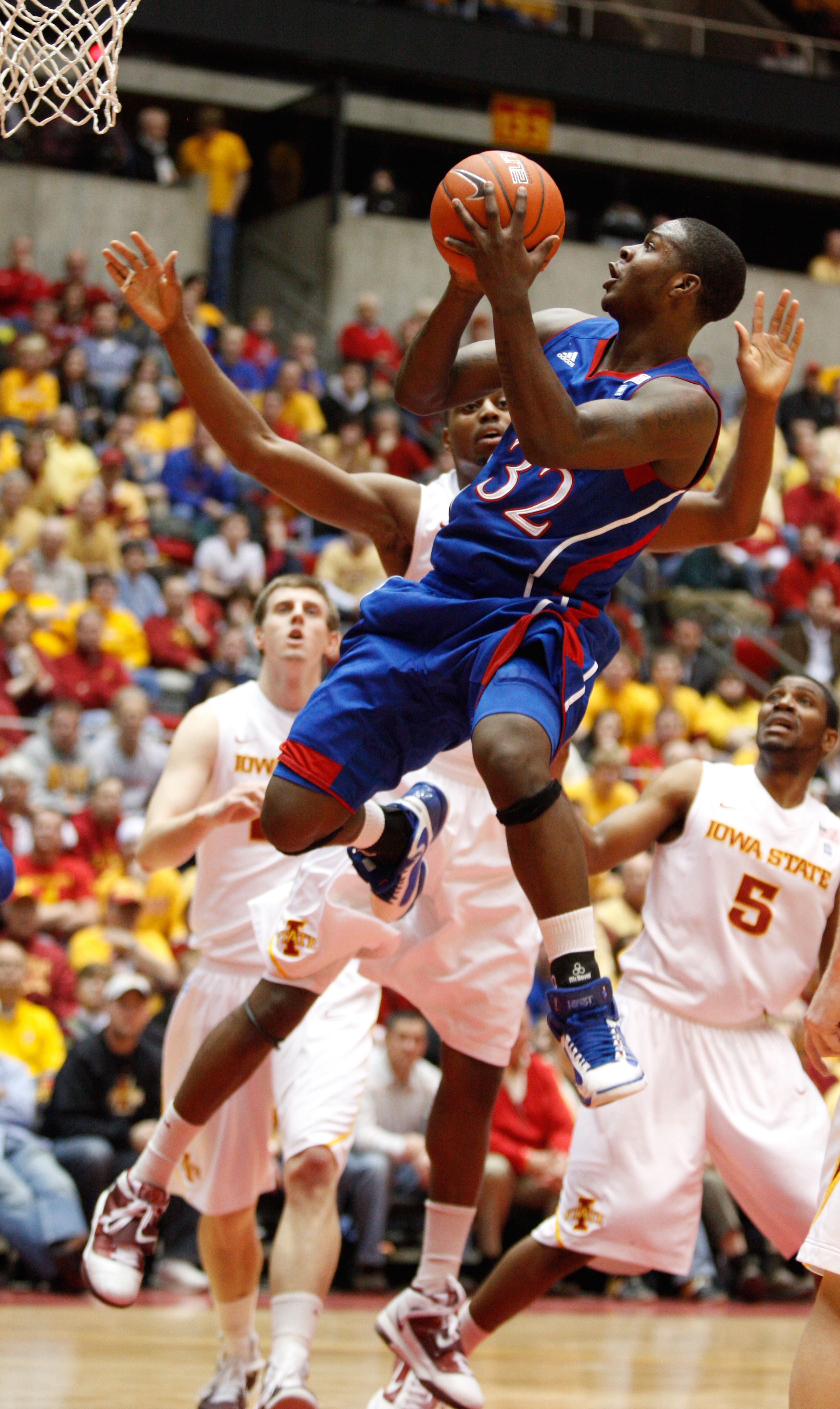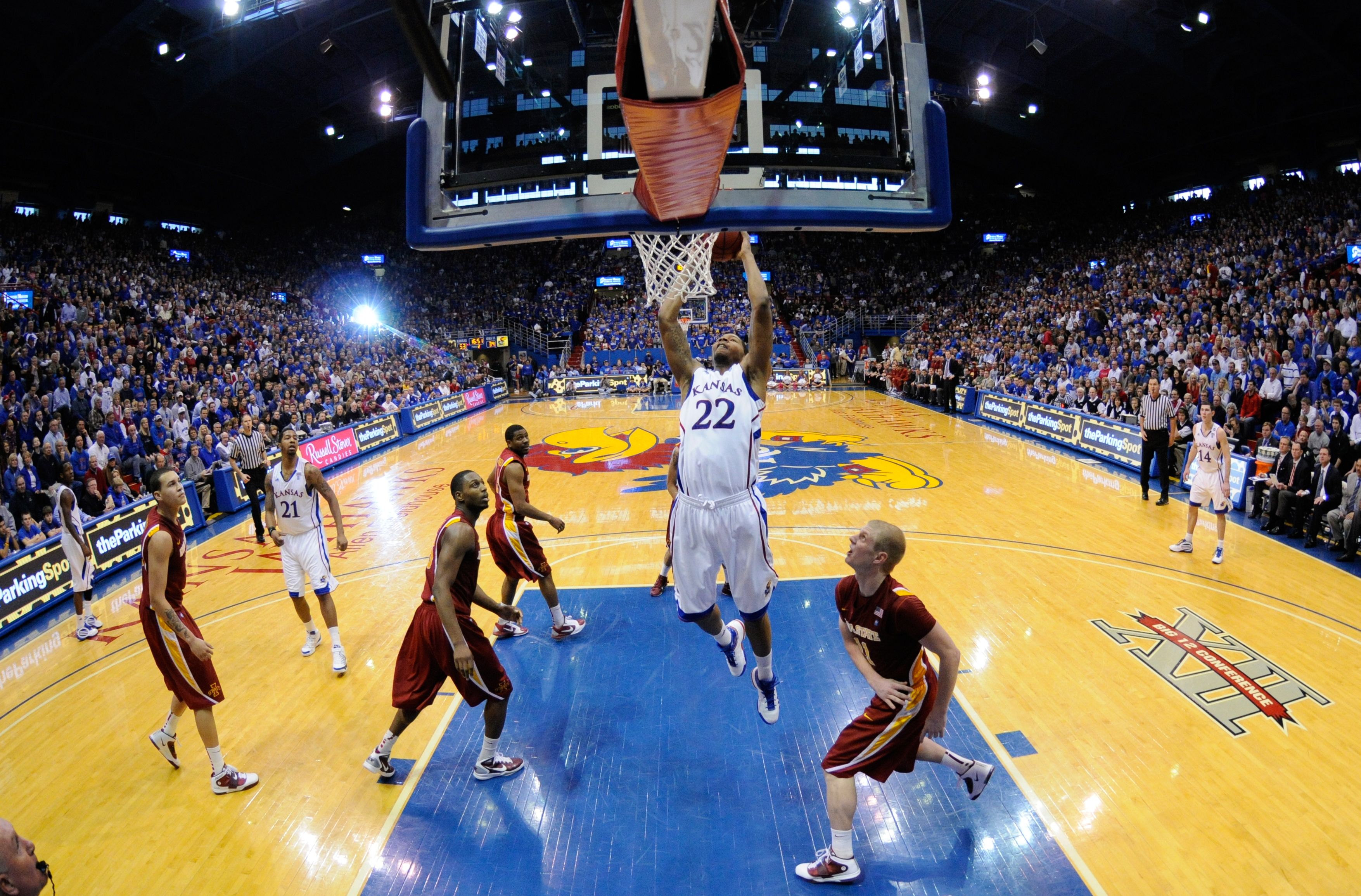 Kansas forward Marcus Morris swoops in for a jam before the Iowa State defense during the second half on Saturday, Feb. 12, 2011 at Allen Fieldhouse.