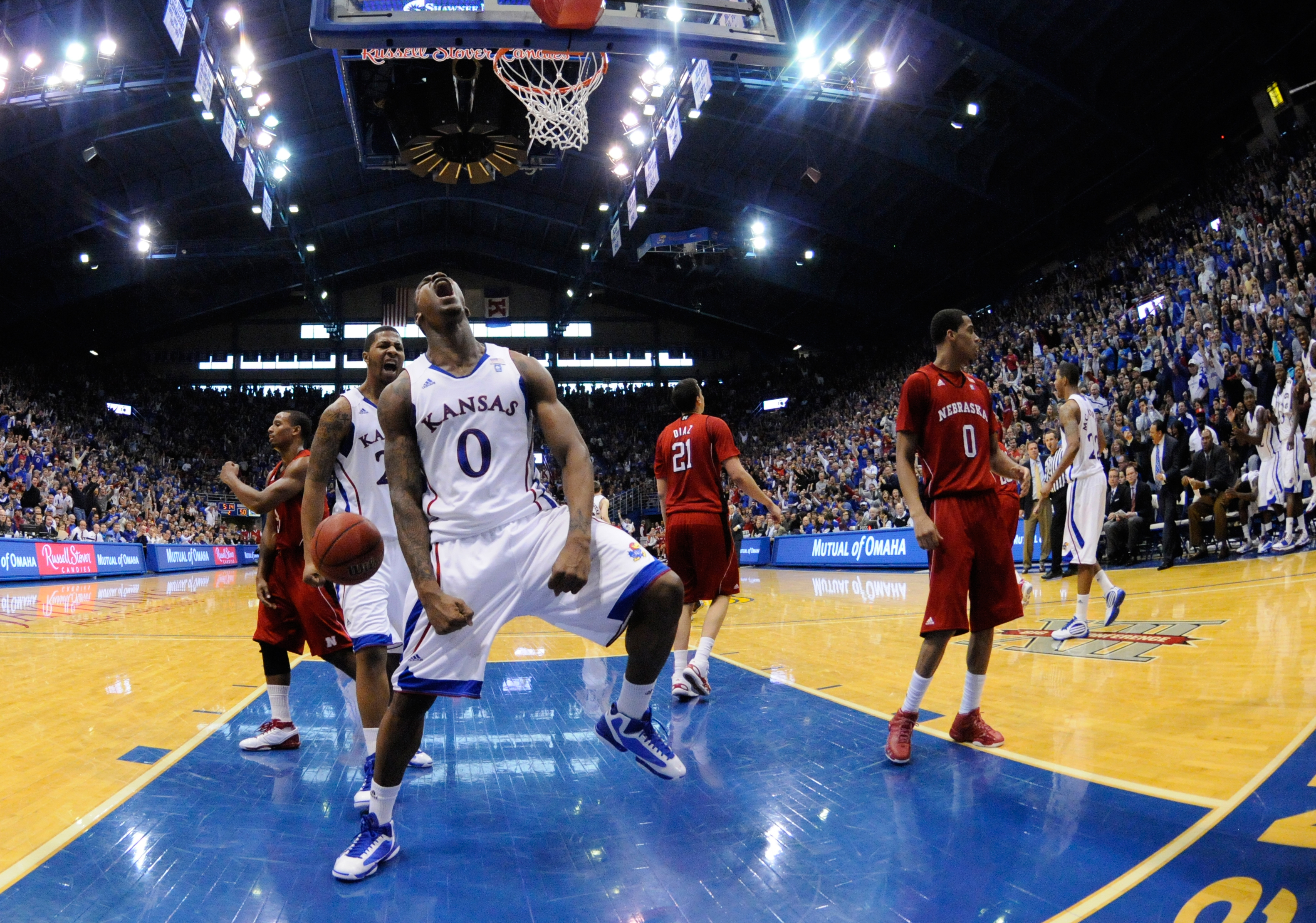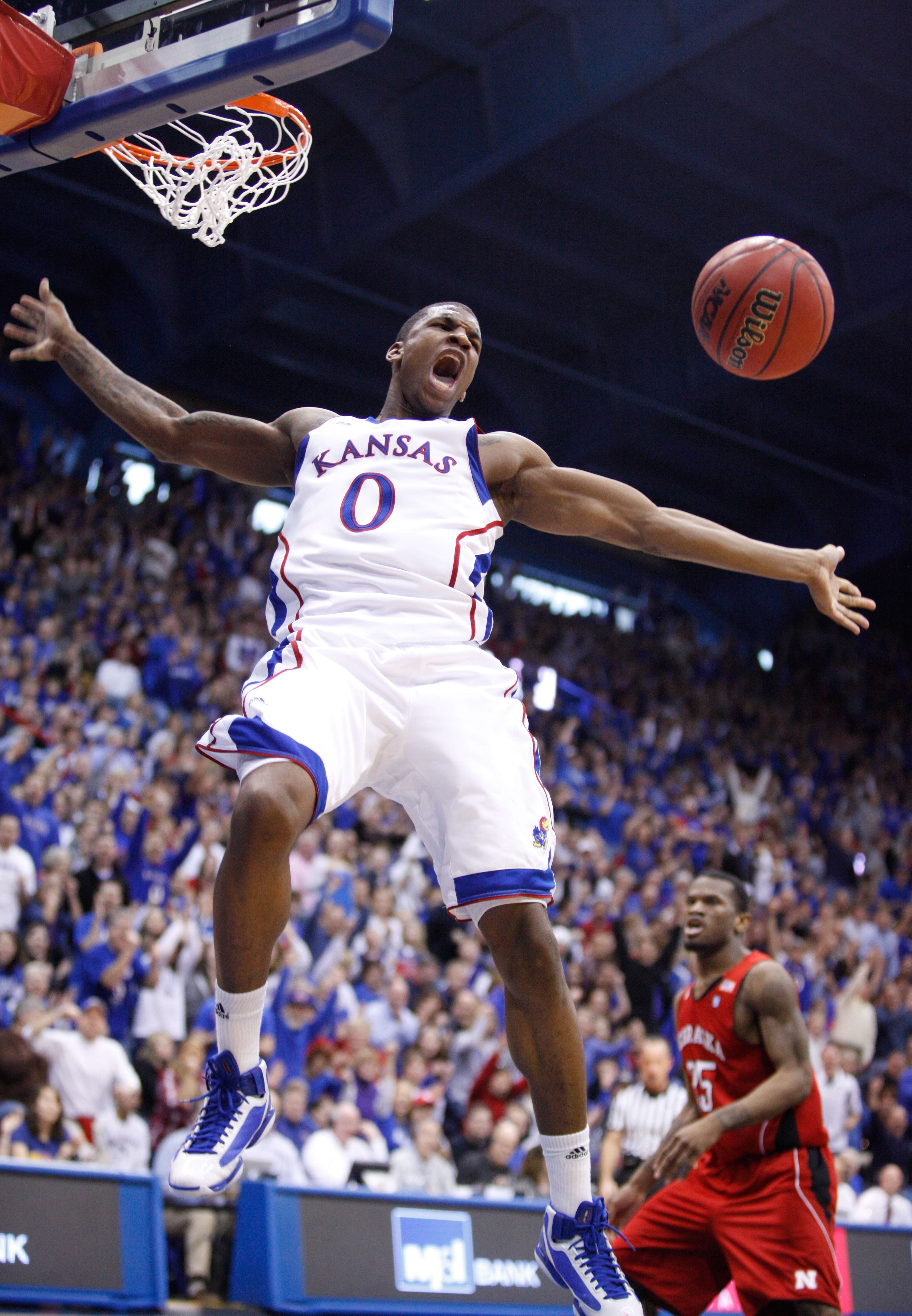 Kansas forward Thomas Robinson roars after a dunk and a foul against Nebraska during the second half on Saturday, Jan. 15, 2011 at Allen Fieldhouse.