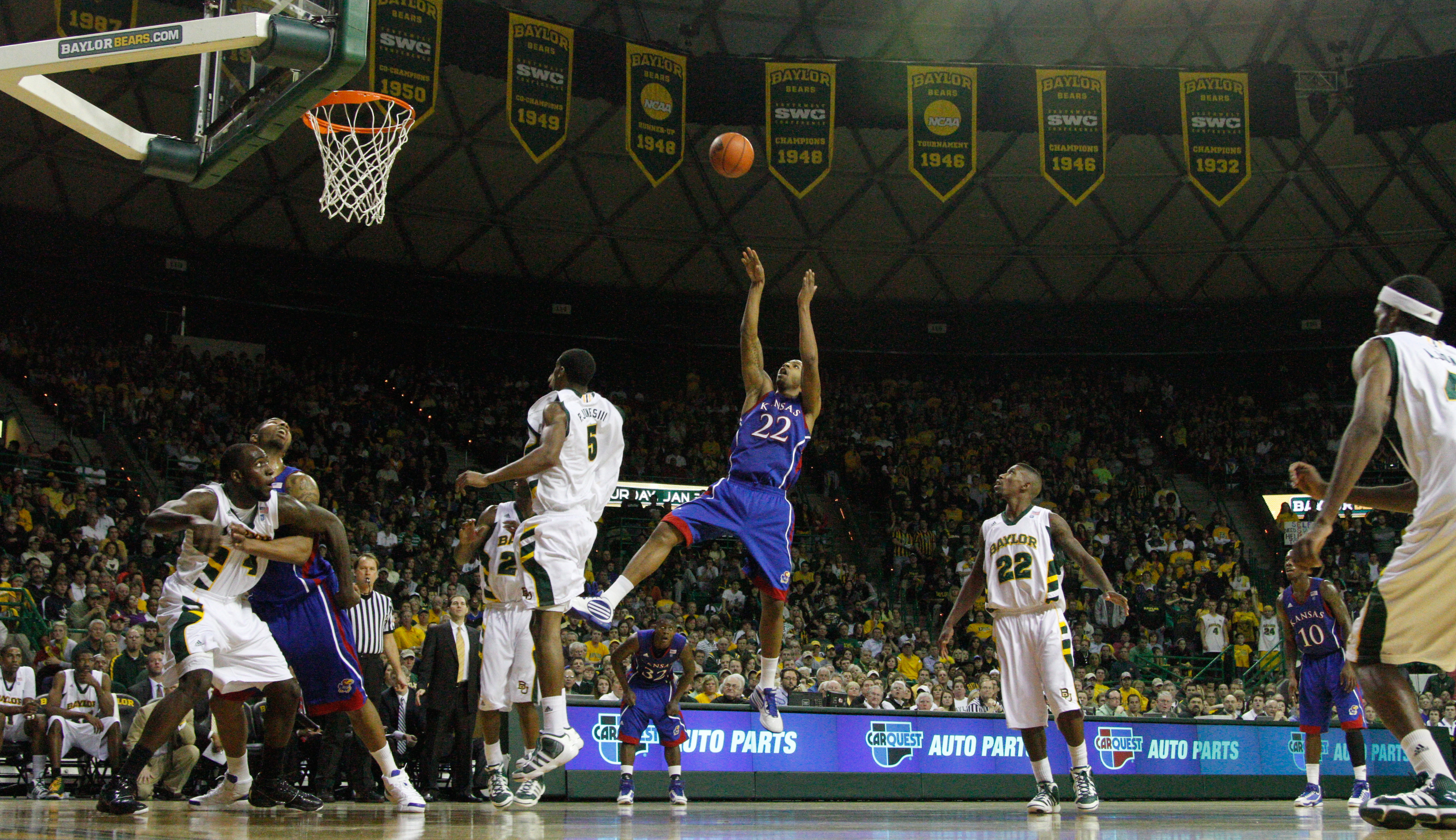 Kansas forward Marcus Morris fades back for a bucket before the Baylor defense during the first half on Monday, Jan. 17, 2011 at the Ferrell Center in Waco, Texas.