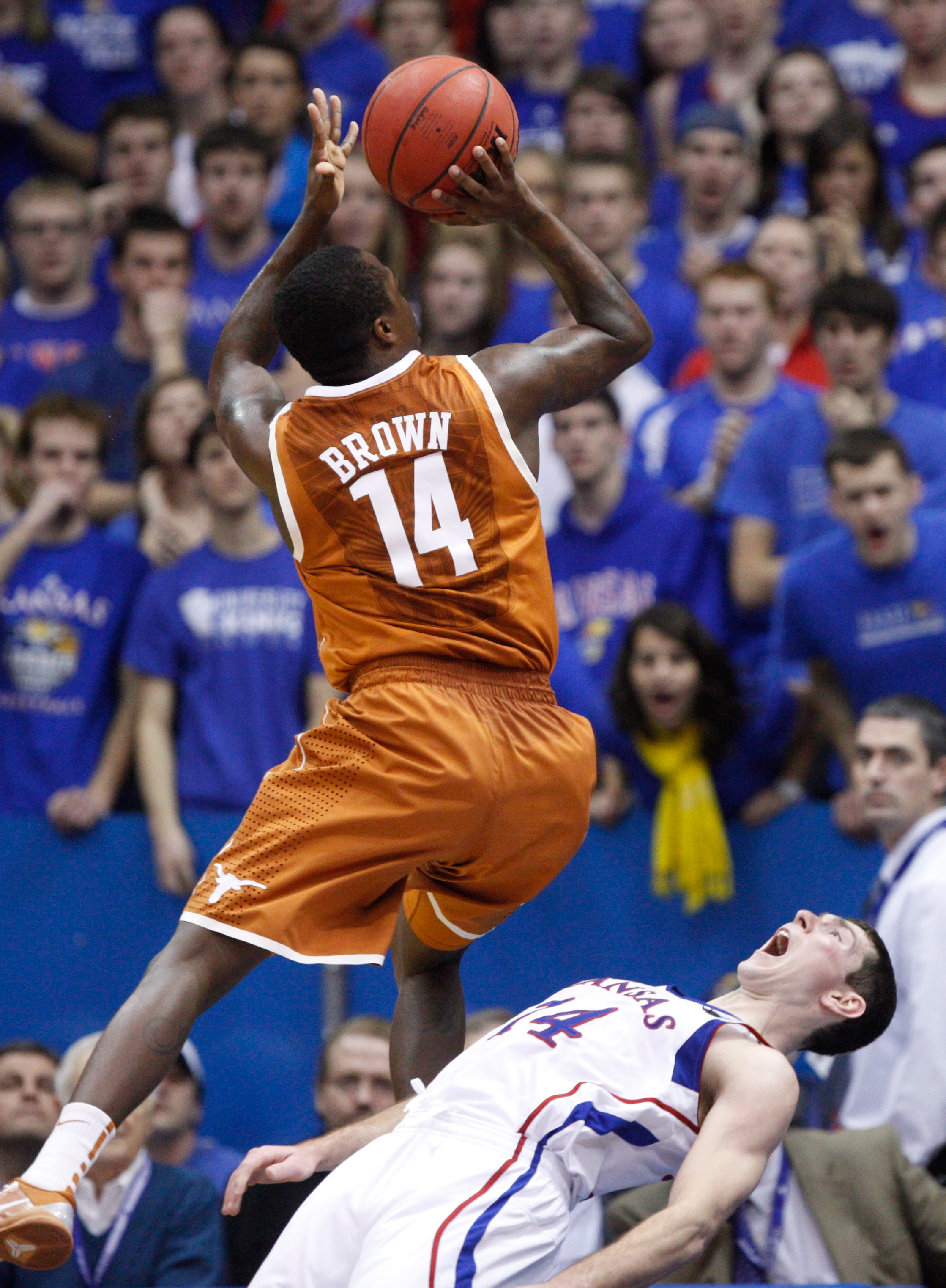 Kansas guard Tyrel Reed takes a charge from Texas guard J'Covan Brown during the first half on Saturday, Jan. 22, 2011 at Allen Fieldhouse.