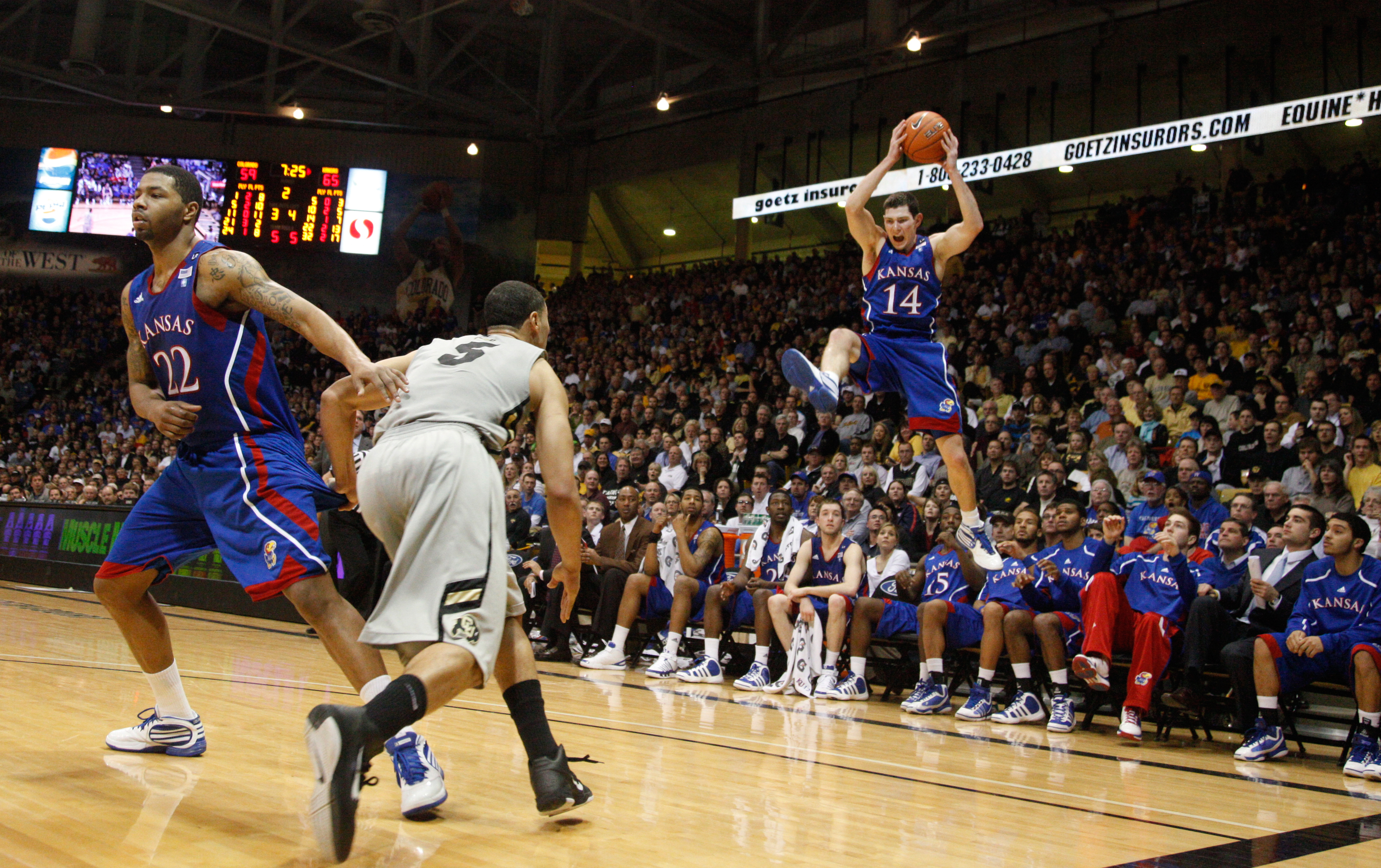 The Kansas bench pulls back as Tyrel Reed gets airborne for a pass during the second half on Tuesday, Jan. 25, 2011 at the Coors Events Center in Boulder. At left is Kansas forward Marcus Morris and Colorado forward Marcus Relphorde.