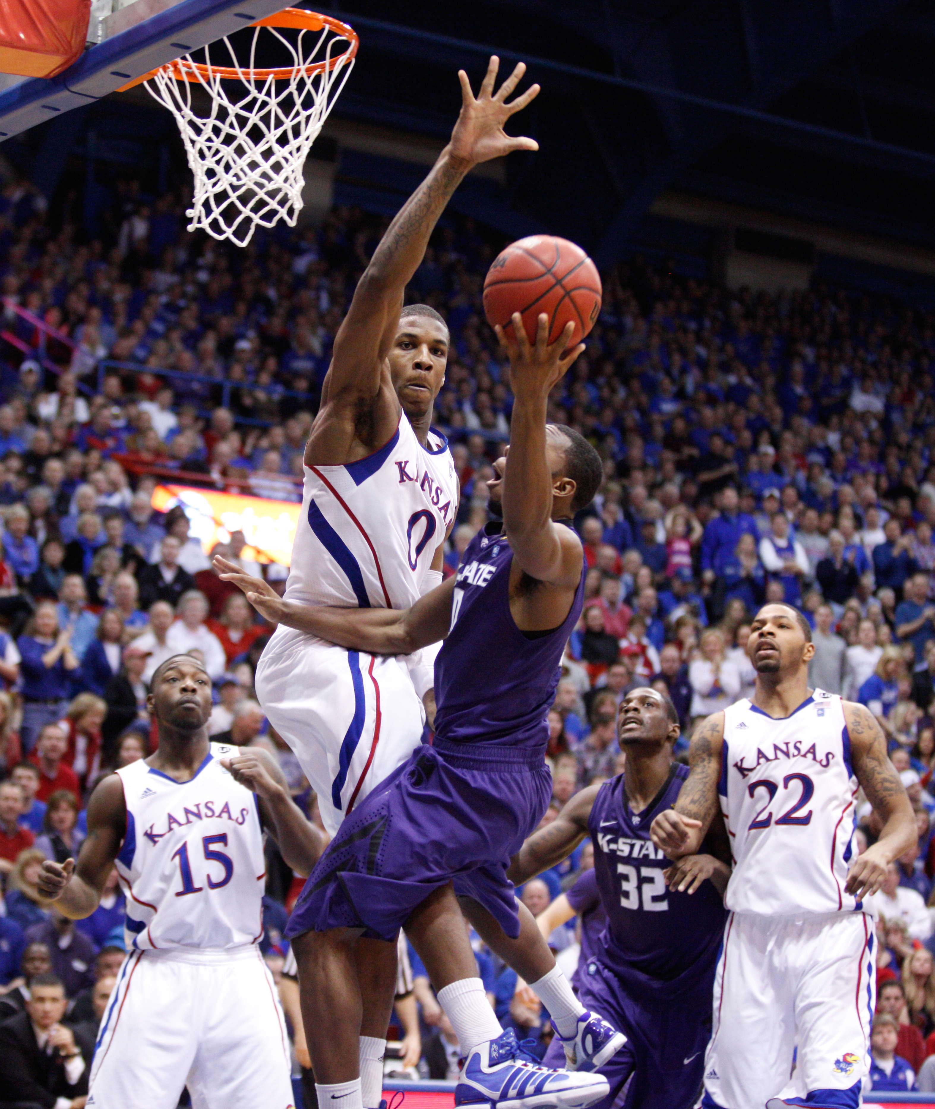 Kansas forward Thomas Robinson defends against a shot by Kansas State guard Jacob Pullen during the second half on Saturday, Jan. 29, 2011 at Allen Fieldhouse. At left is KU guard Elijah Johnson and at right are KSU forward Jamar Samuels and KU forward Marcus Morris.
