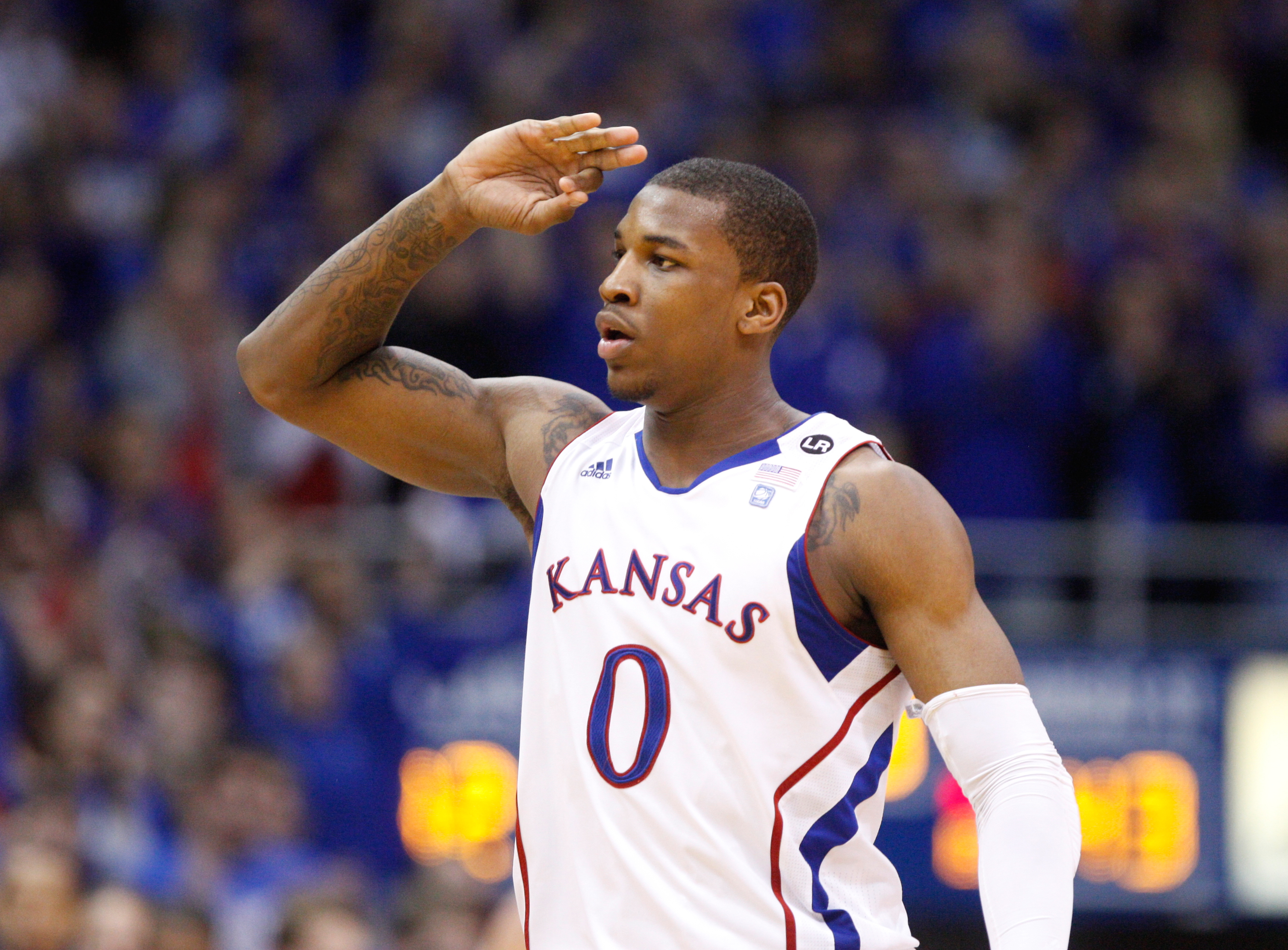 Kansas guard Josh Selby salutes the Allen Fieldhouse crowd as he leaves the court following the Jayhawks' 70-68 win over USC, Saturday, Dec. 18, 2010. Selby made his debut with 21 points and hit what proved to be the game winning shot.