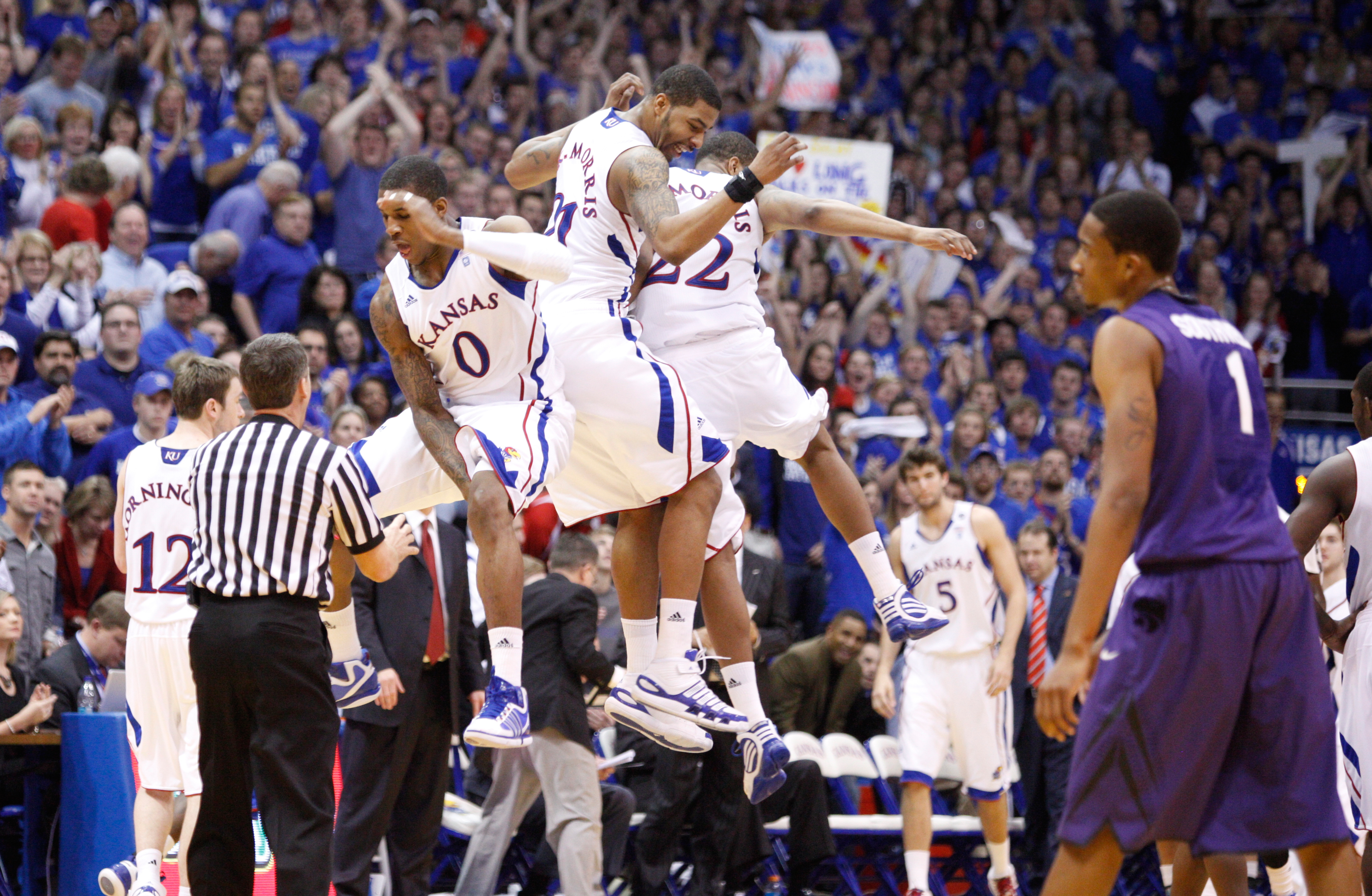 Kansas forward Thomas Robinson gets airborne for a flying bump from the Morris brothers Markieff (21) and Marcus during a timeout against Kansas State during the second half on Saturday, Jan. 29, 2011 at Allen Fieldhouse. Robinson erupted for 17 points in the effort, two days after the funeral of his mother Lisa Robinson.