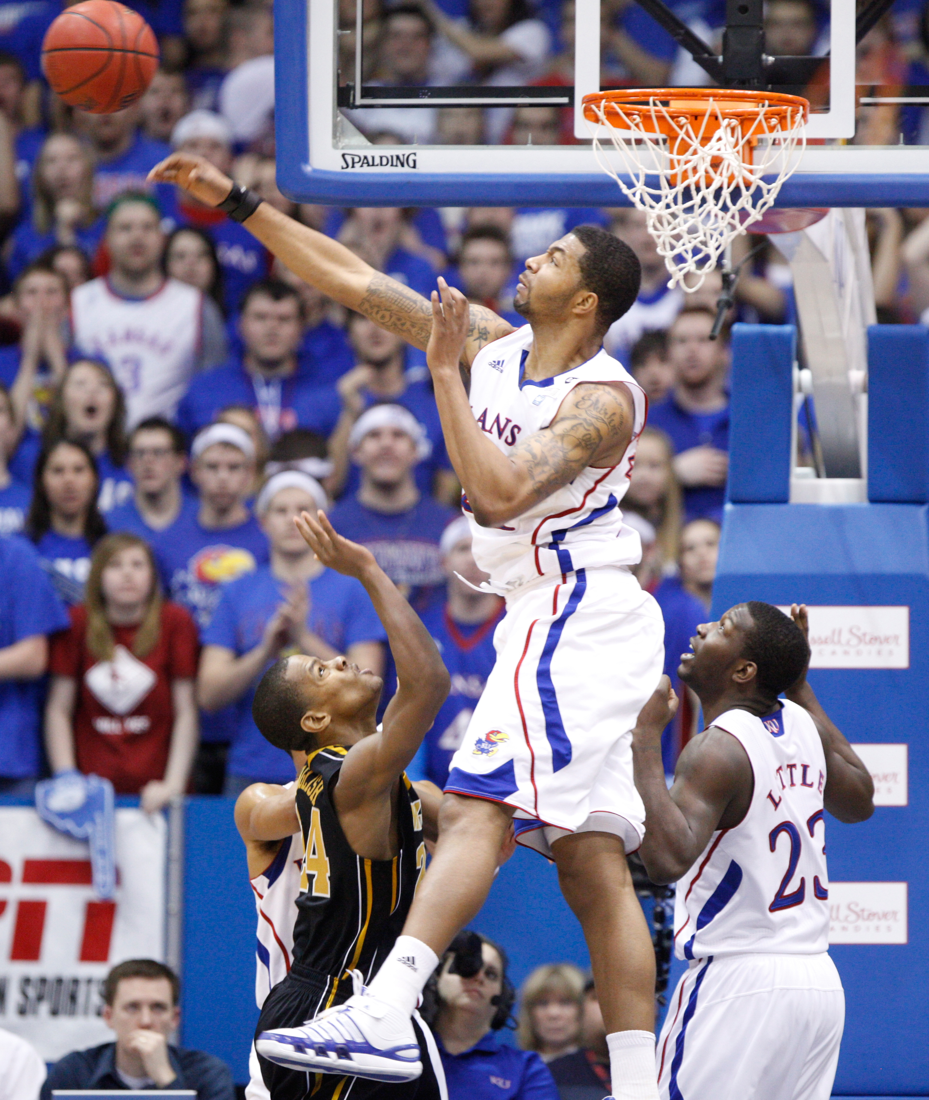 Kansas forward Markieff Morris sends a shot soaring from Missouri guard Kim English during the second half on Monday, Feb. 7, 2011 at Allen Fieldhouse. At right is forward Mario Little.