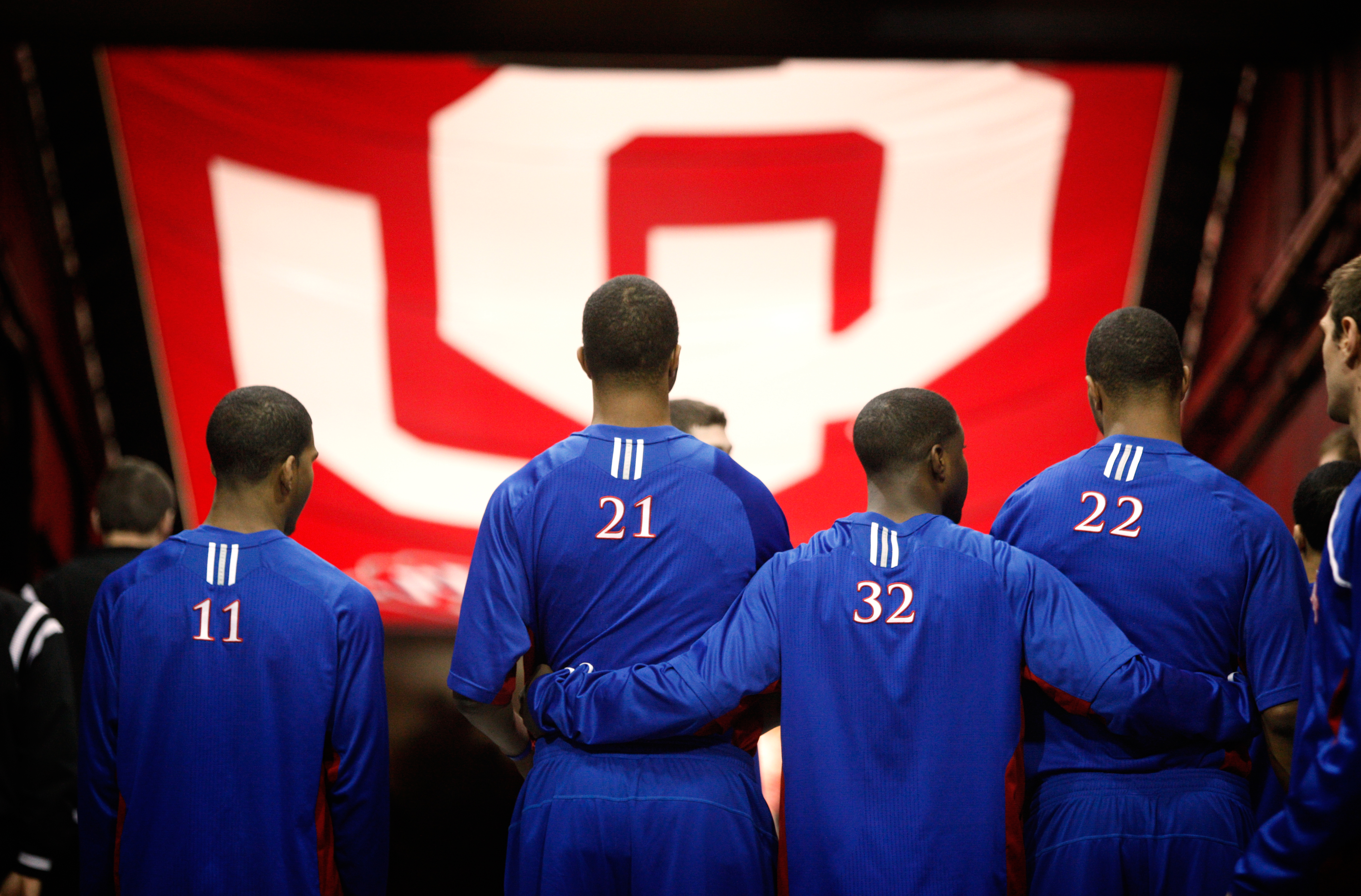 Kansas players Royce Woolridge (11) Markieff Morris (21) Josh Selby (32) and Marcus Morris (22) wait in the tunnel before taking the court on Saturday, Feb. 26, 2011 at the Lloyd Noble Center in Norman, Okla.