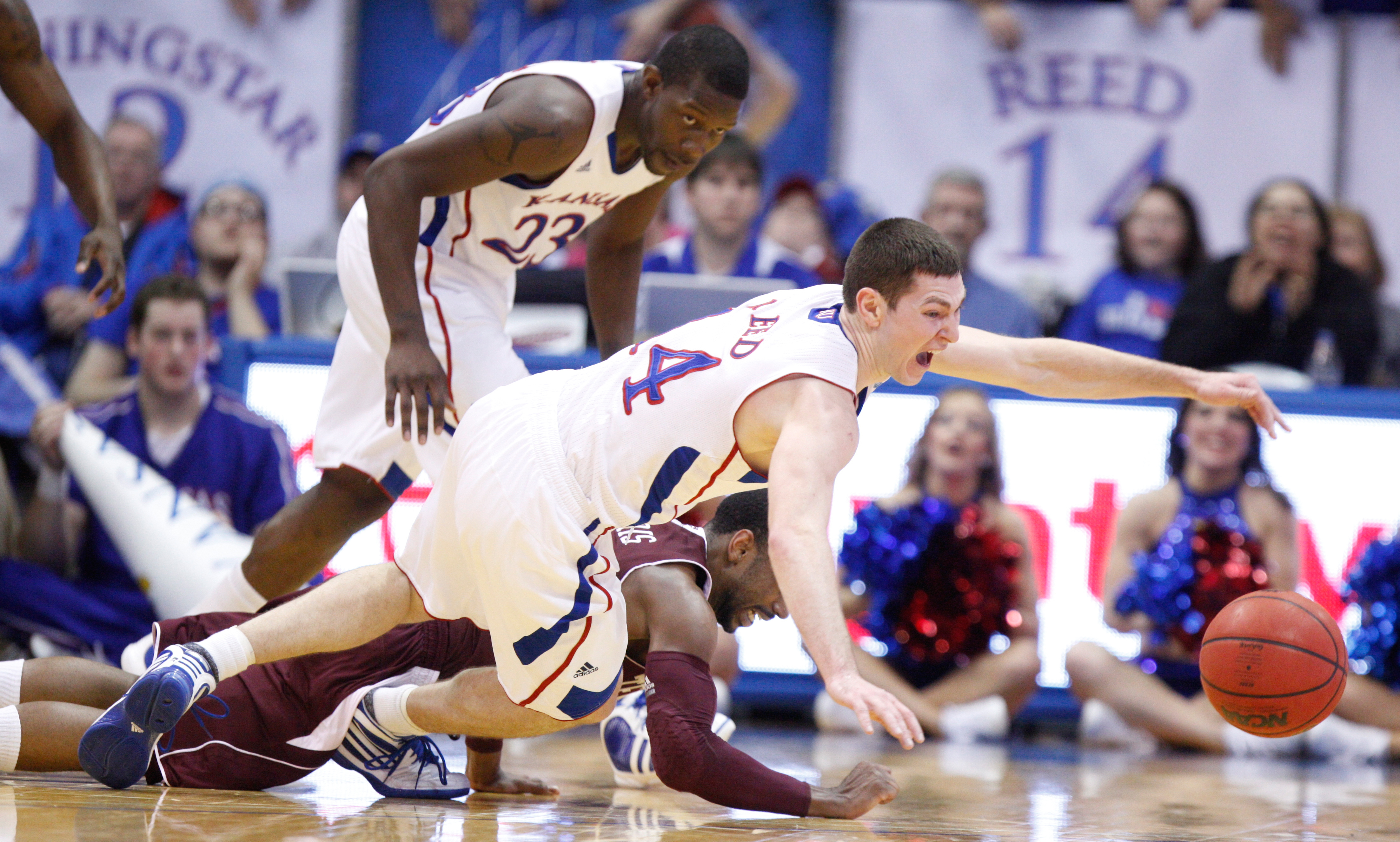 Kansas guard Tyrel Reed dives for a loose ball with Texas A&M guard Dash Harris during the first half on Wednesday, March 2, 2011 at Allen Fieldhouse. In back is Kansas forward Mario Little.