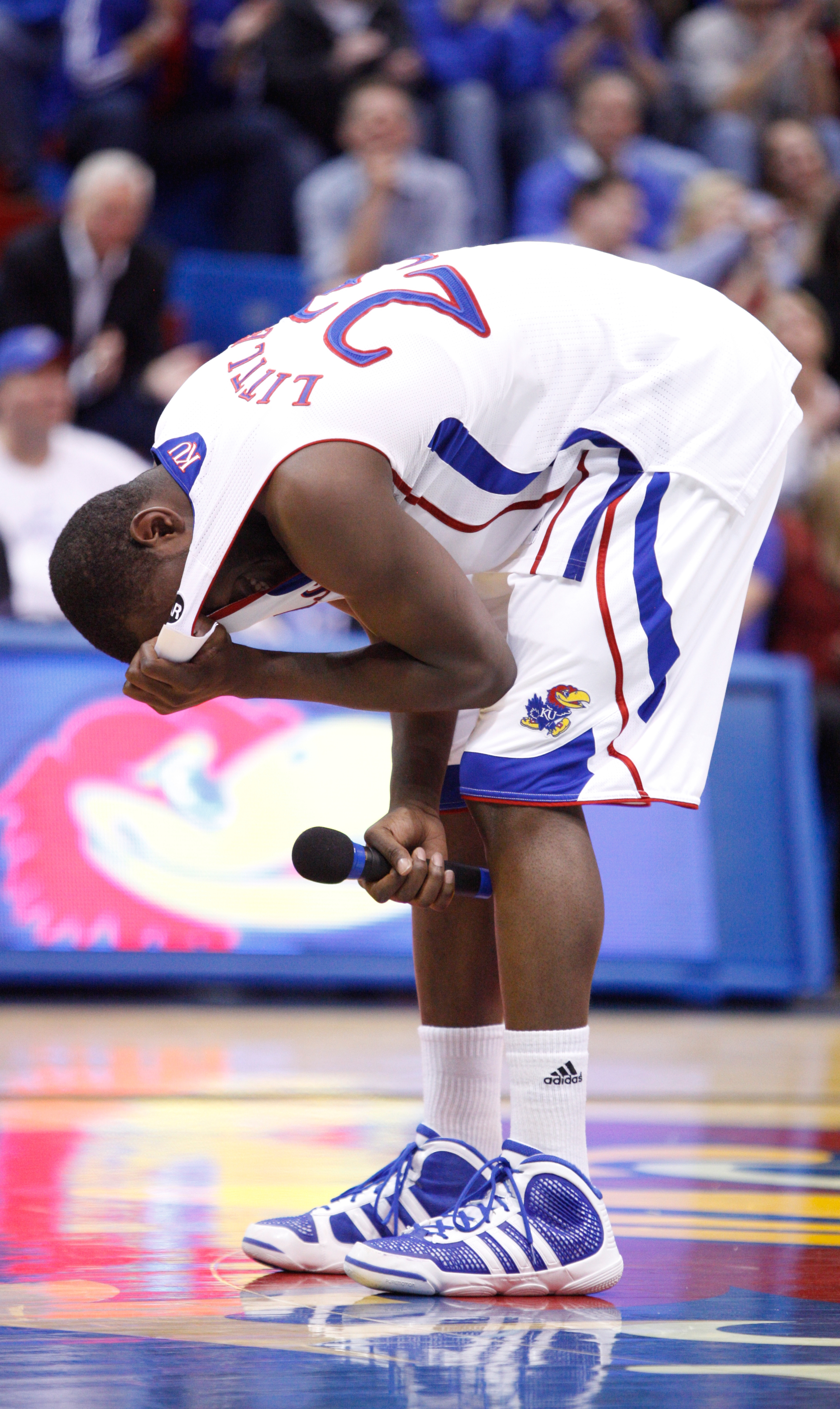 Kansas forward Mario Little wipes his eyes in his jersey as he thanks members of his family during the senior speeches following the Jayhawks' 64-51 win over Texas A&M on Wednesday, March 2, 2011 at Allen Fieldhouse.