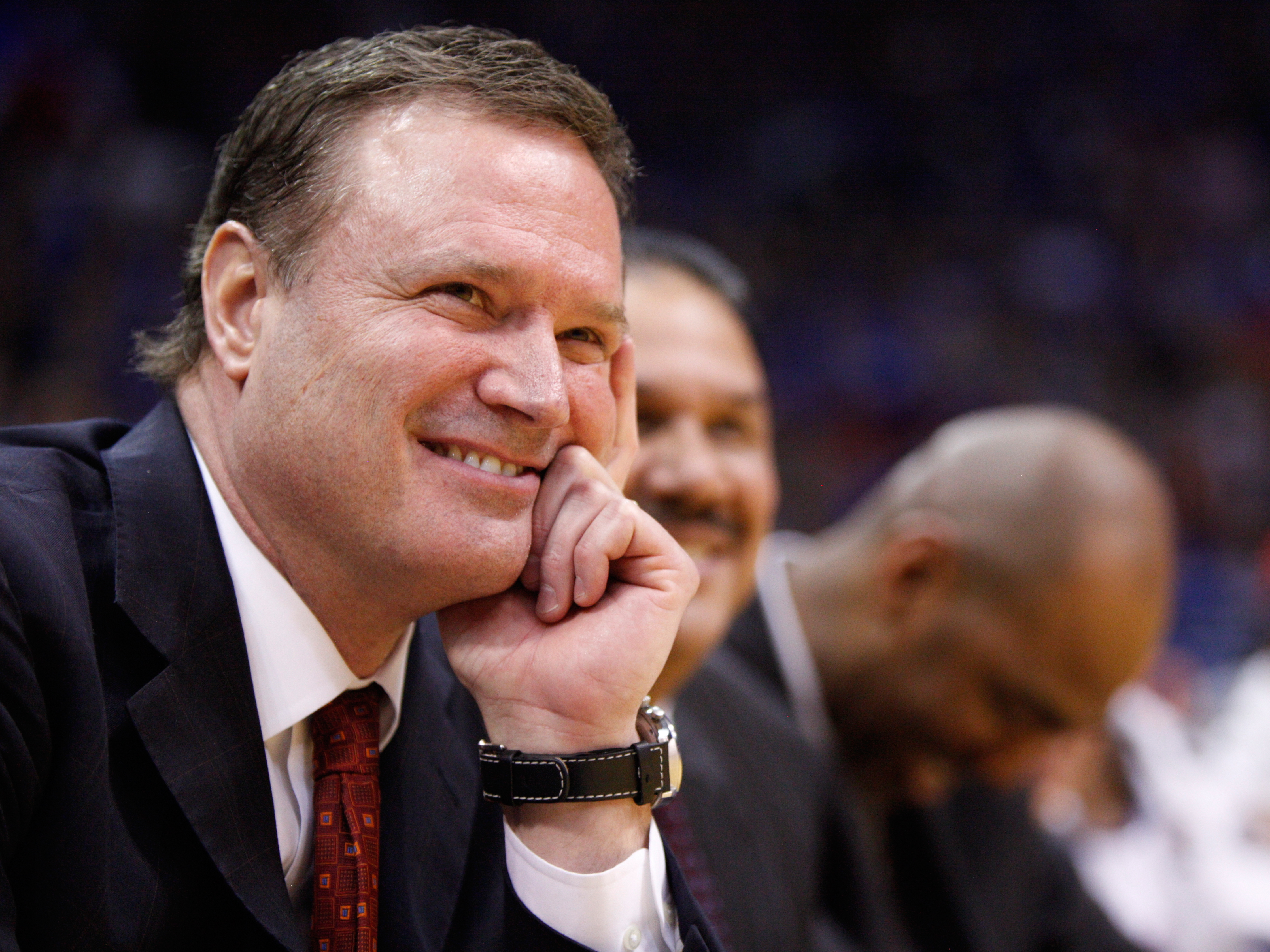 Kansas head coach Bill Self smiles as he listens to forward Mario Little's senior speech following the Jayhawks' 64-51 win over Texas A&M on Wednesday, March 2, 2011 at Allen Fieldhouse.