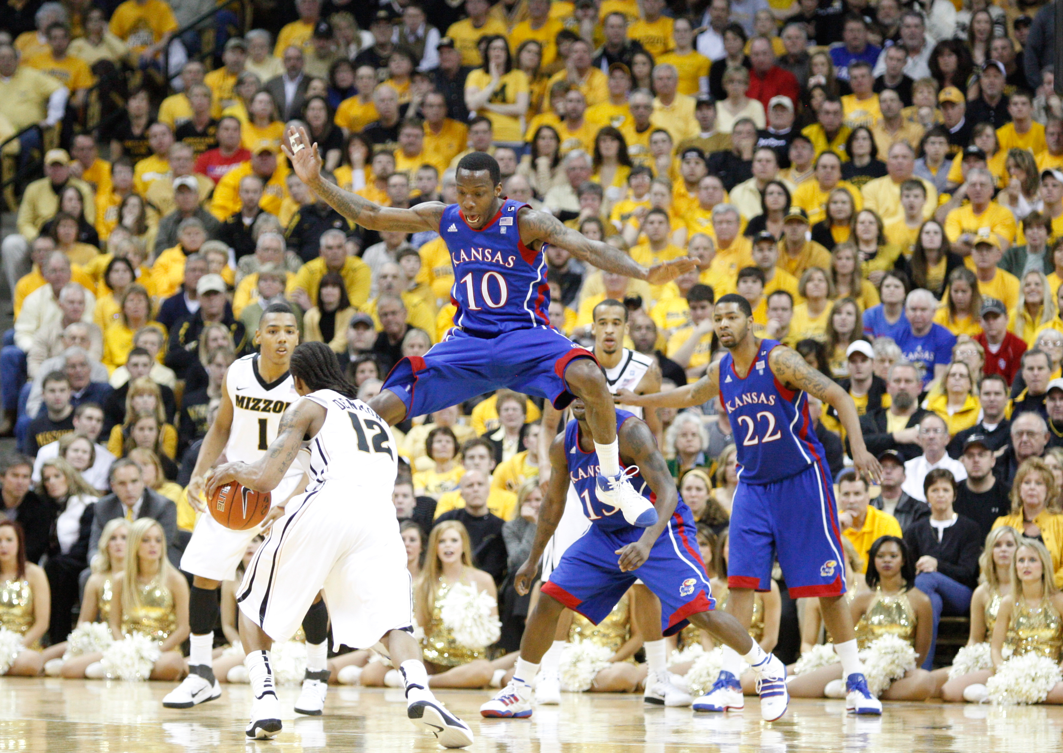 Kansas guard Tyshawn Taylor gets airborne as he defends against a drive by Missouri guard Marcus Denmon during the second half on Saturday, March 5, 2011 at Mizzou Arena.