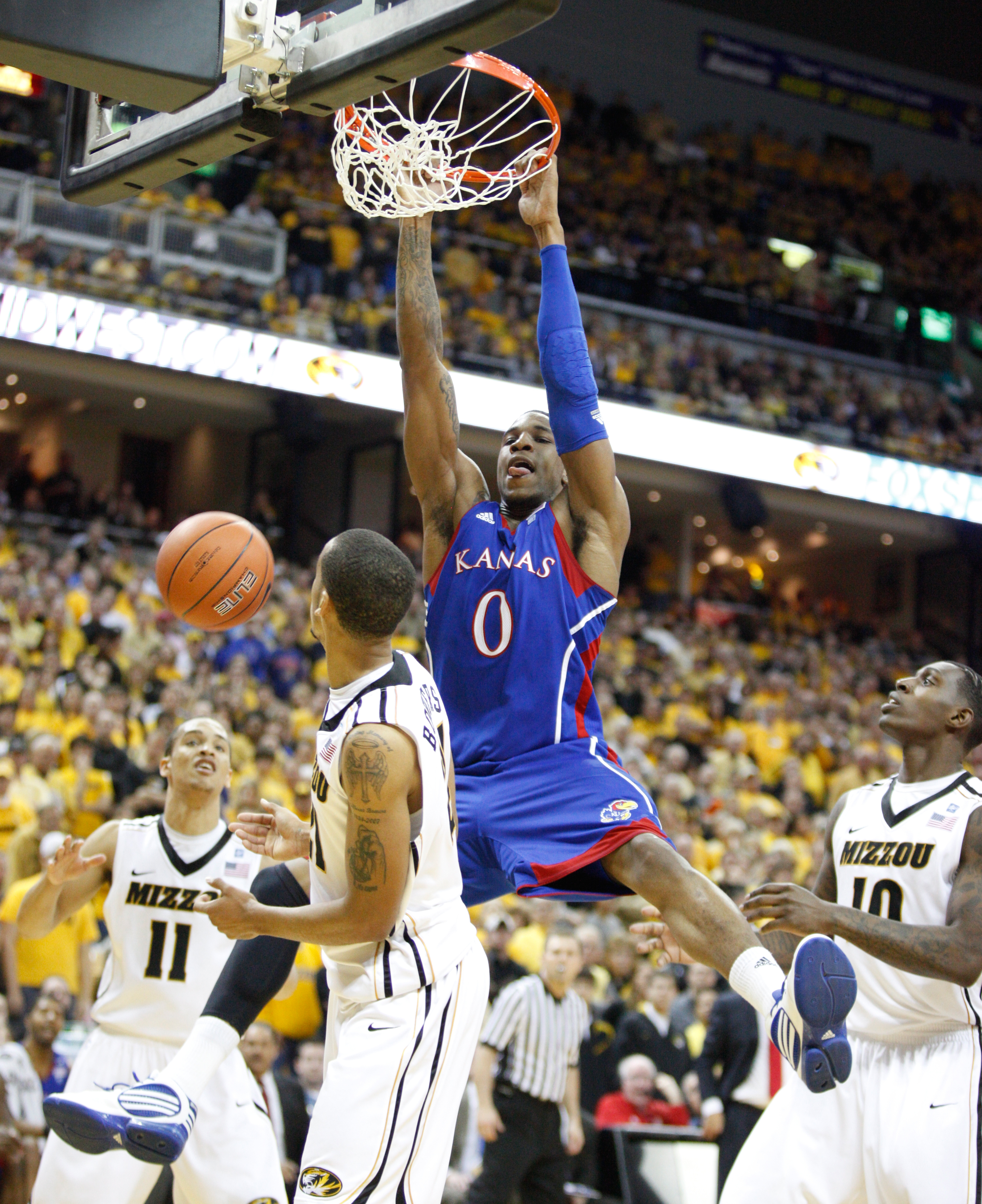 Kansas forward Thomas Robinson finishes a put-back dunk before Missouri forward Laurence Bowers during the second half on Saturday, March 5, 2011 at Mizzou Arena.