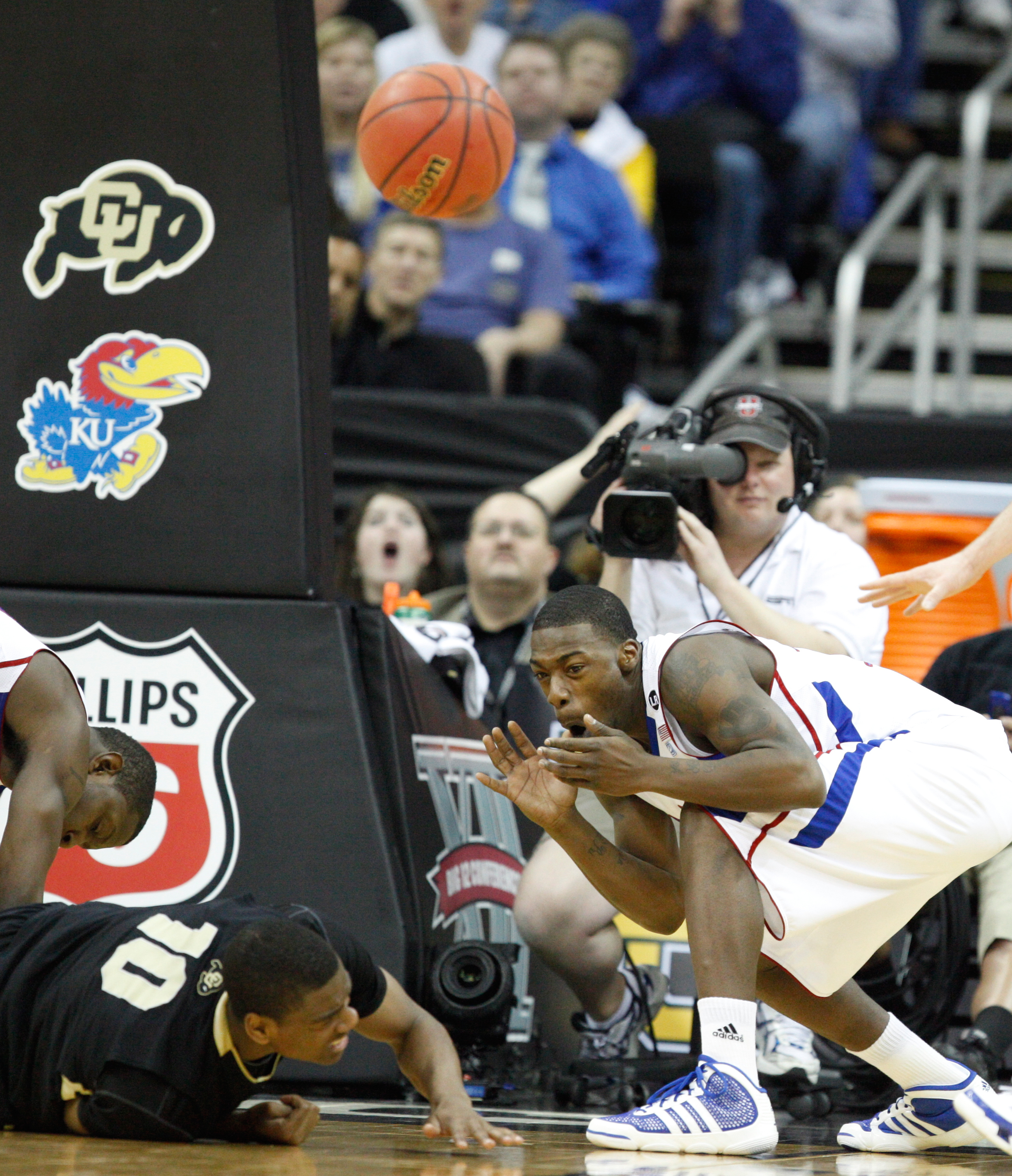 Kansas guard Elijah Johnson reacts after bringing down Colorado guard Alec Burks following a collision during the second half on Friday, March 11, 2011 at the Sprint Center.