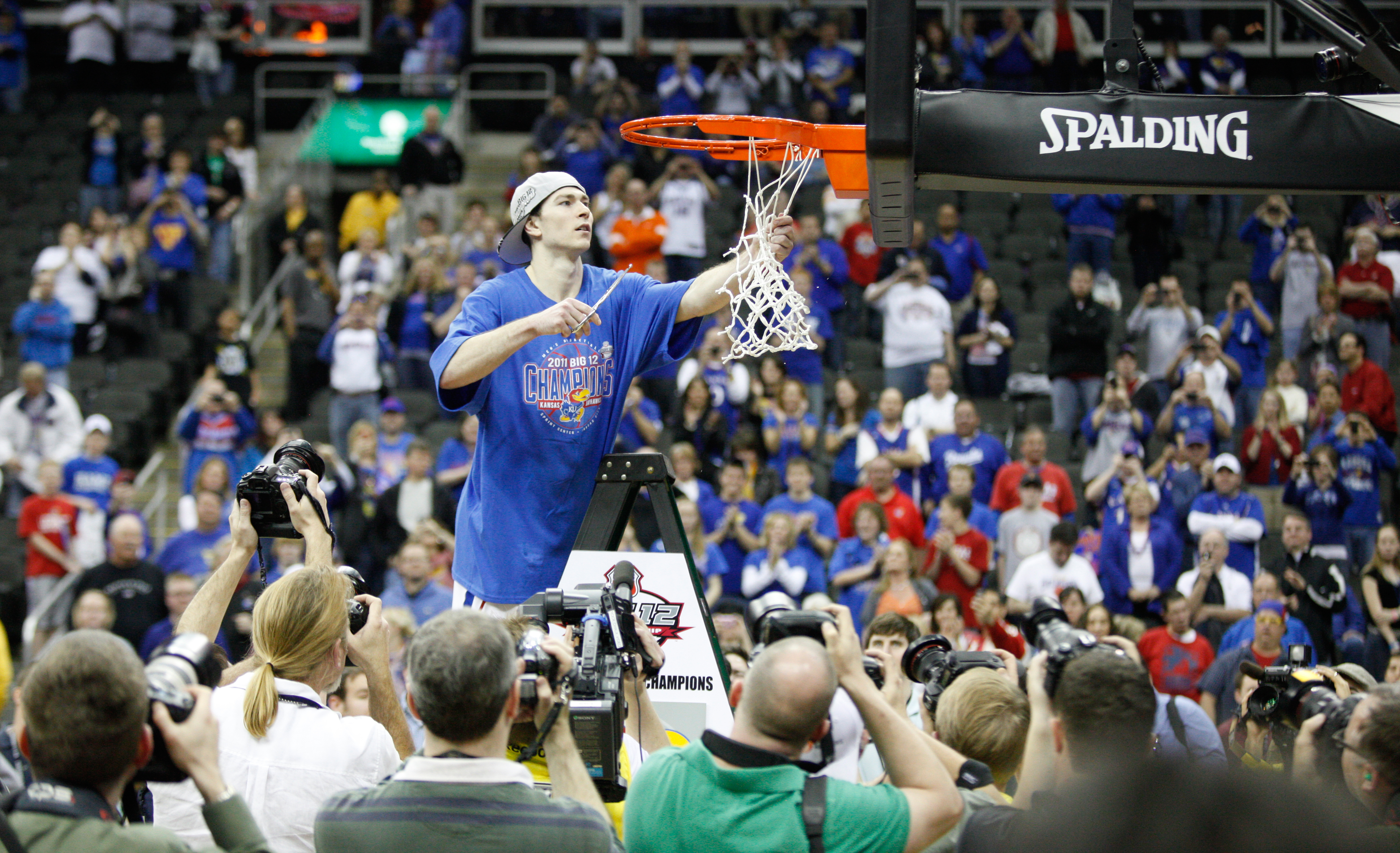 Kansas guard Tyrel Reed does the honors taking down the remainder of the net following the Jayhawks' win over Texas on Saturday, March 12, 2011 at the Sprint Center.