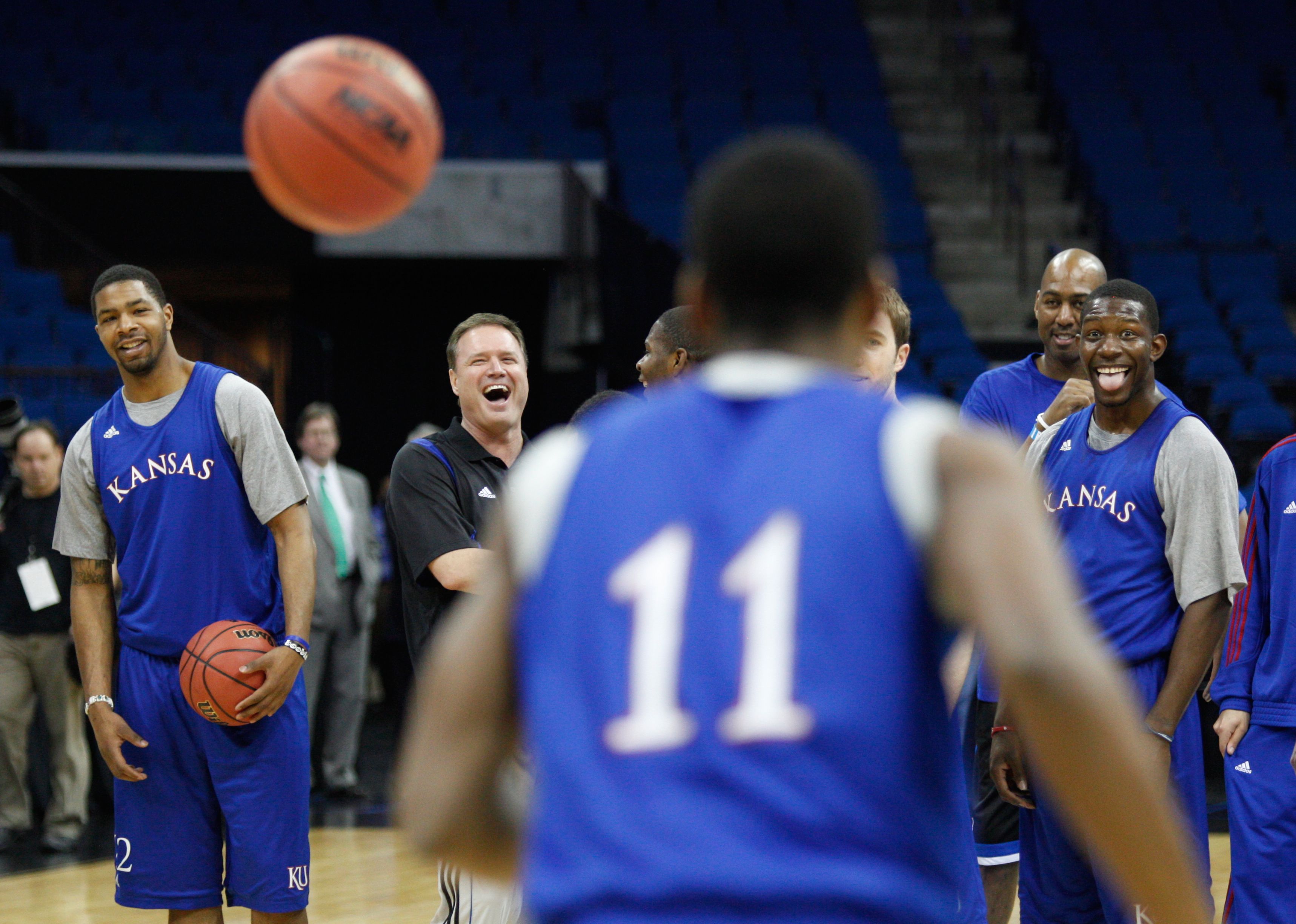 Kansas' Marcus Morris, left, head coach Bill Self, assistant Danny Manning and forward Mario Little react after a missed dunk attempt by freshman guard Royce Woolridge during a day of practices and press conferences for teams playing second and third round games in Tulsa on Thursday, March 17, 2011 at the BOK Center.