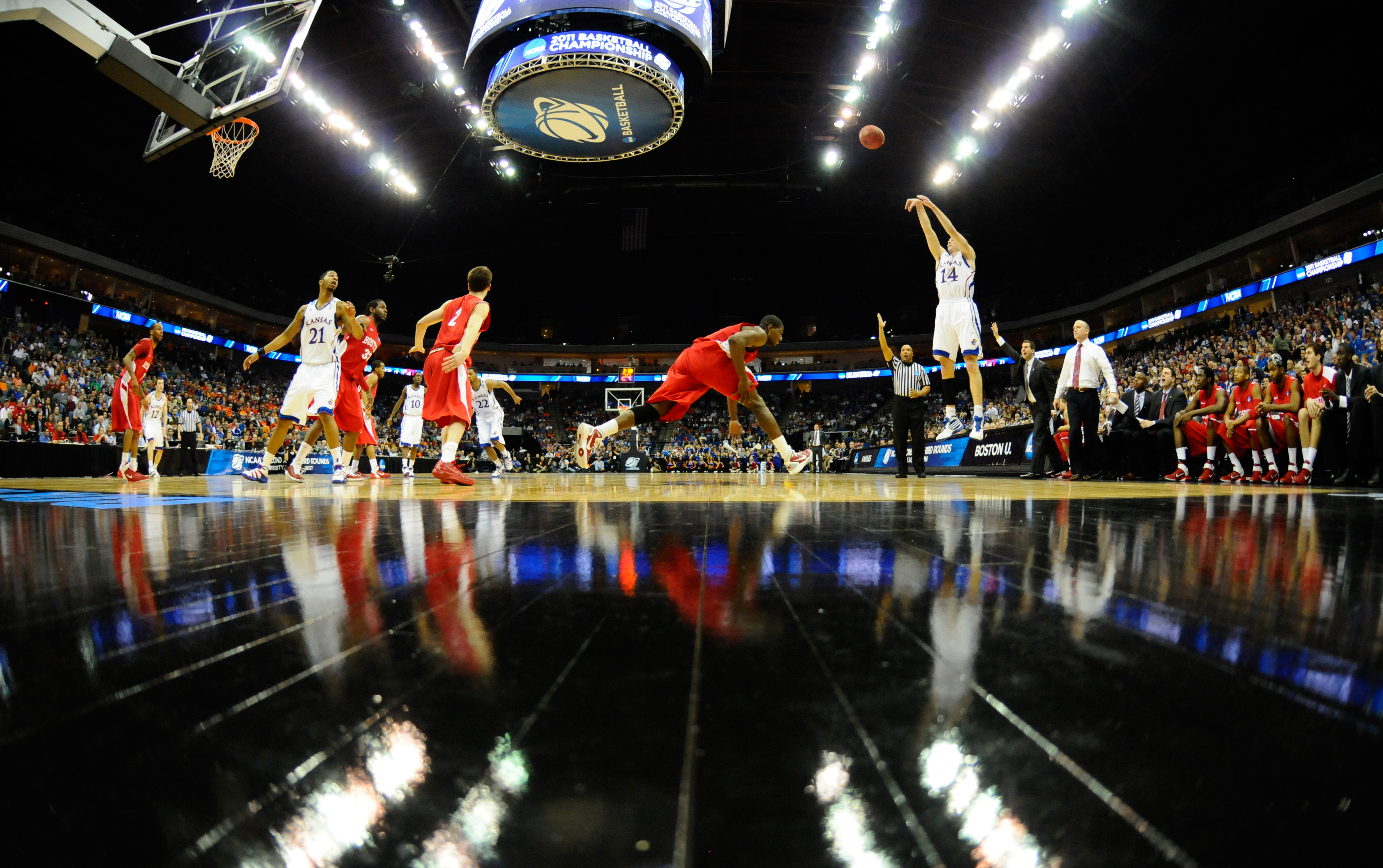 Kansas guard Tyrel Reed hoists a three from the corner against Boston University during the first half on Friday, March 18, 2011 at the BOK Center in Tulsa.