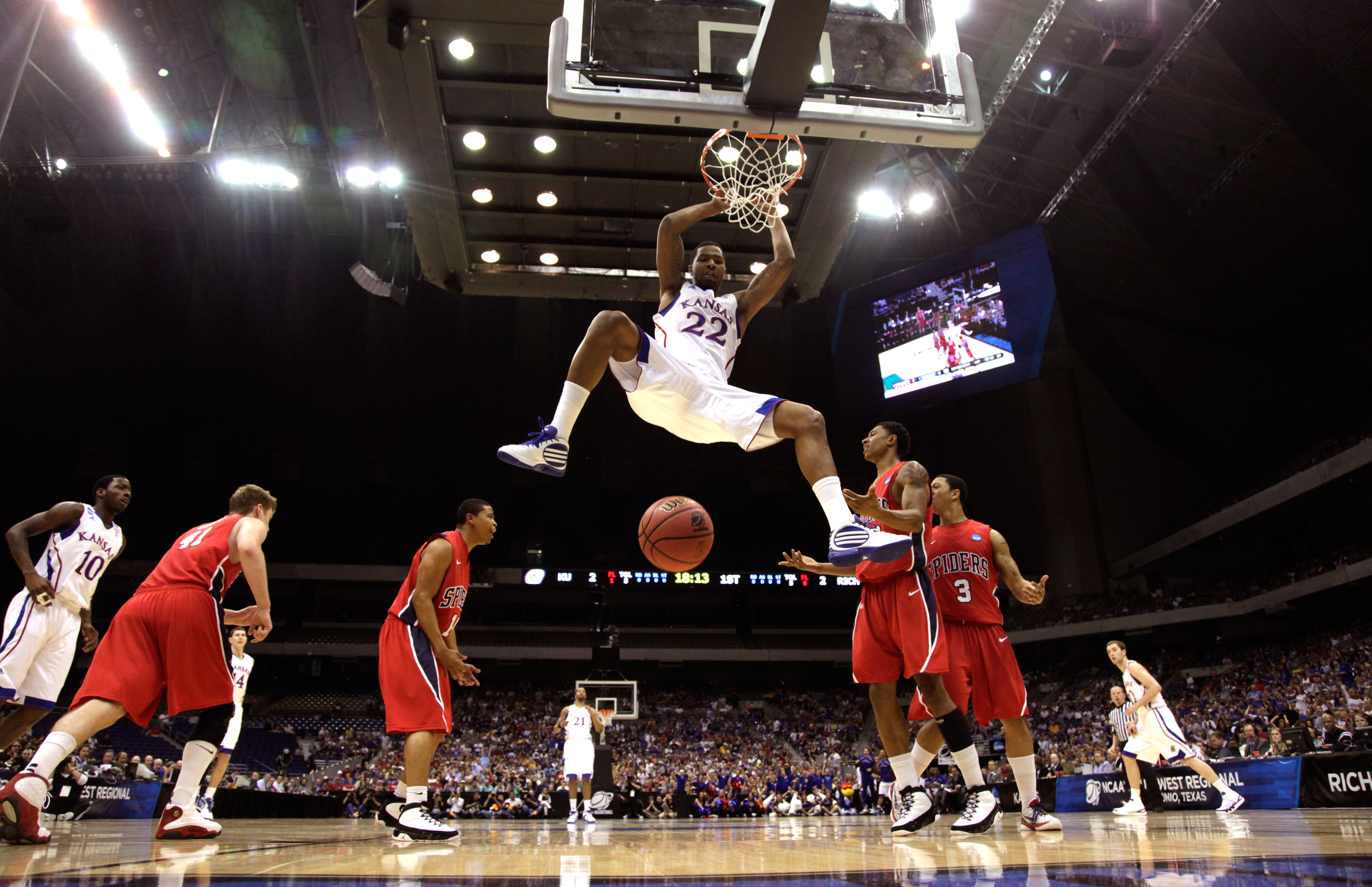Kansas forward Marcus Morris hangs on the rim after a dunk against the Richmond defense during the first half on Friday, March 25, 2011 at the Alamodome in San Antonio. The Jayhawks made short work of the Spiders with a 77-57 win advancing to the Elite Eight.