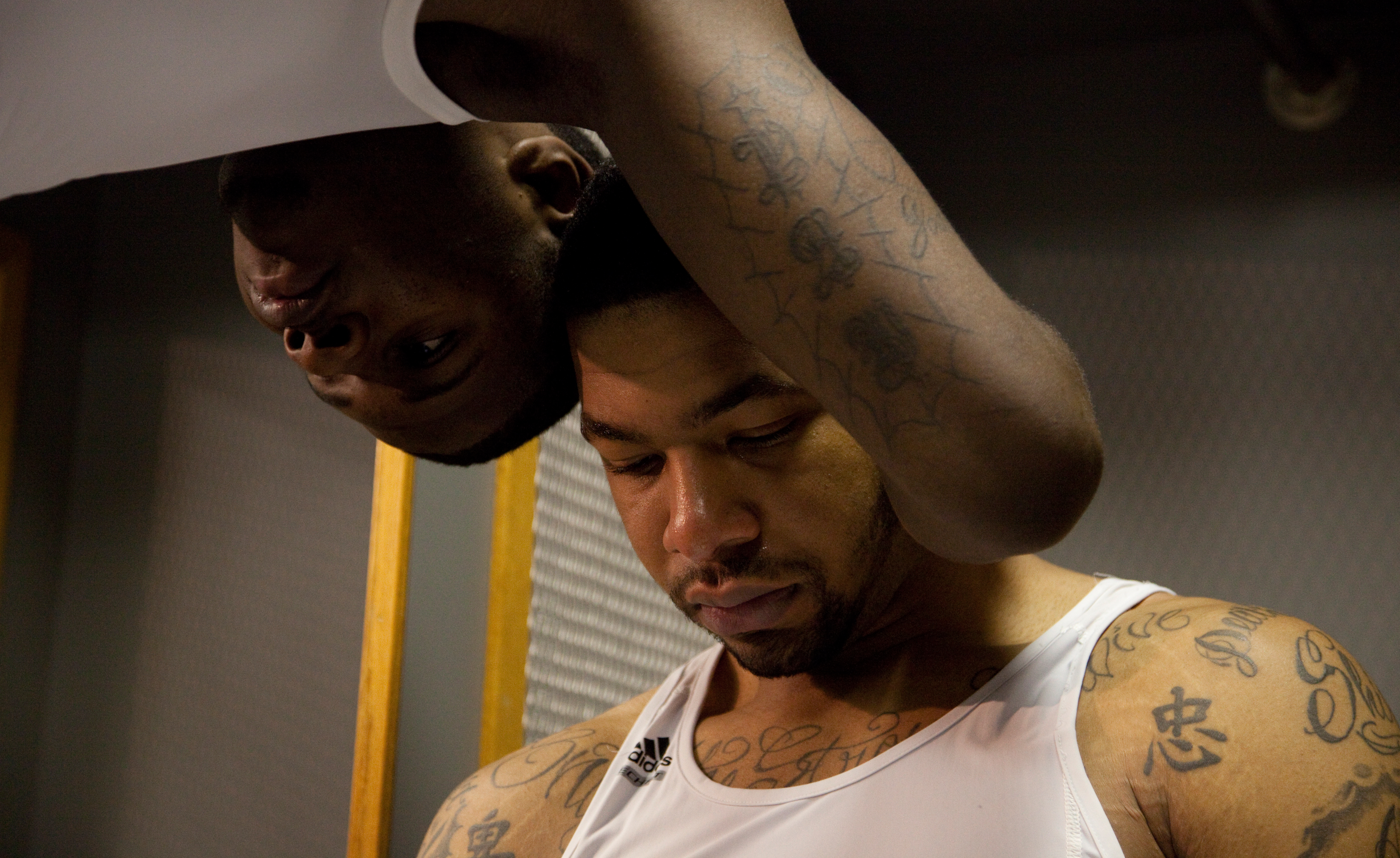 Kansas guard Josh Selby leans over to hug forward Markieff Morris in the locker room following the Jayhawks' 71-61 loss to Virginia Commonwealth on Sunday, March 27, 2011 at the Alamodome in San Antonio.