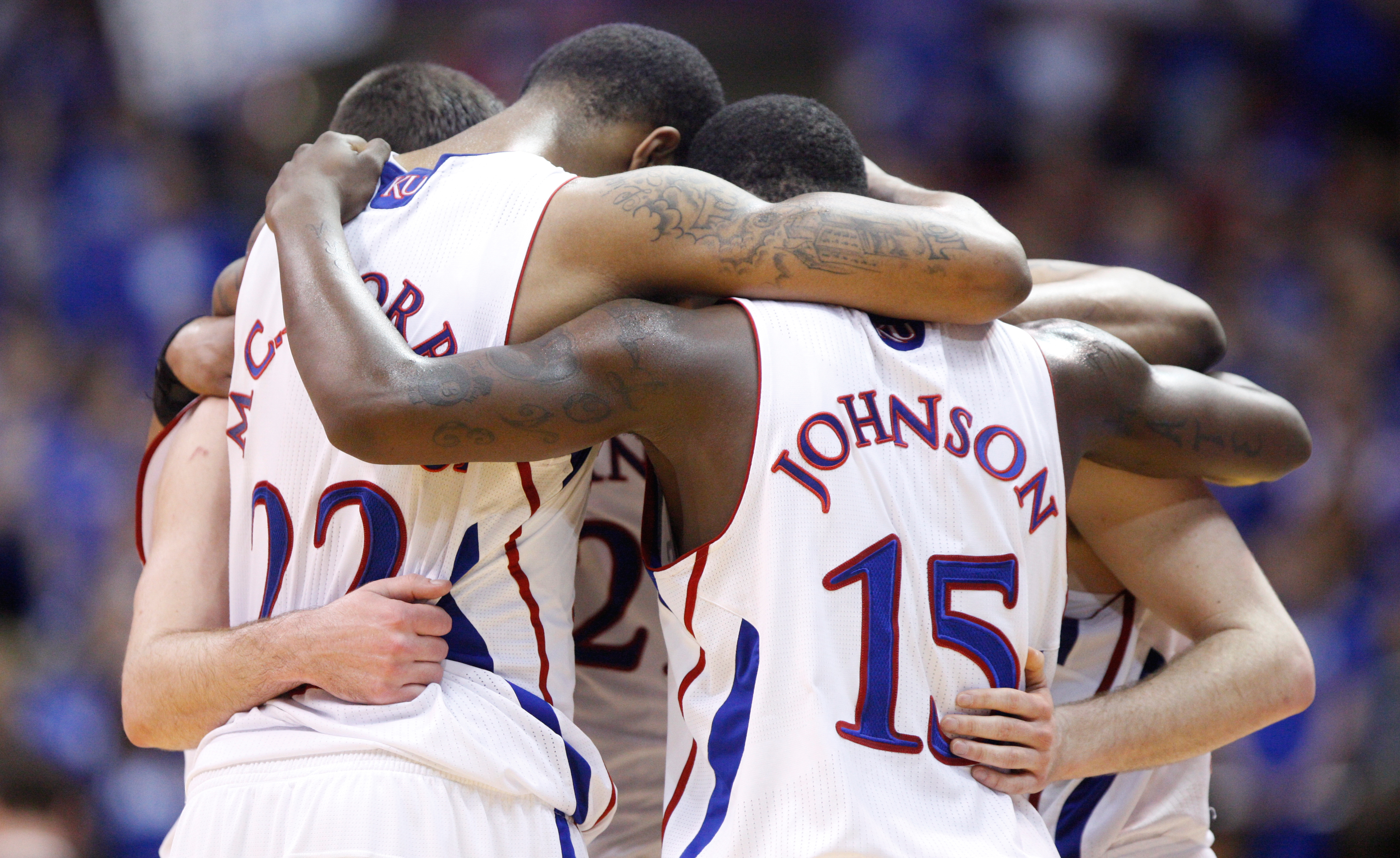The Kansas Jayhawks come together in a huddle during a timeout in the second half against Texas A&M on Wednesday, March 2, 2011 at Allen Fieldhouse.