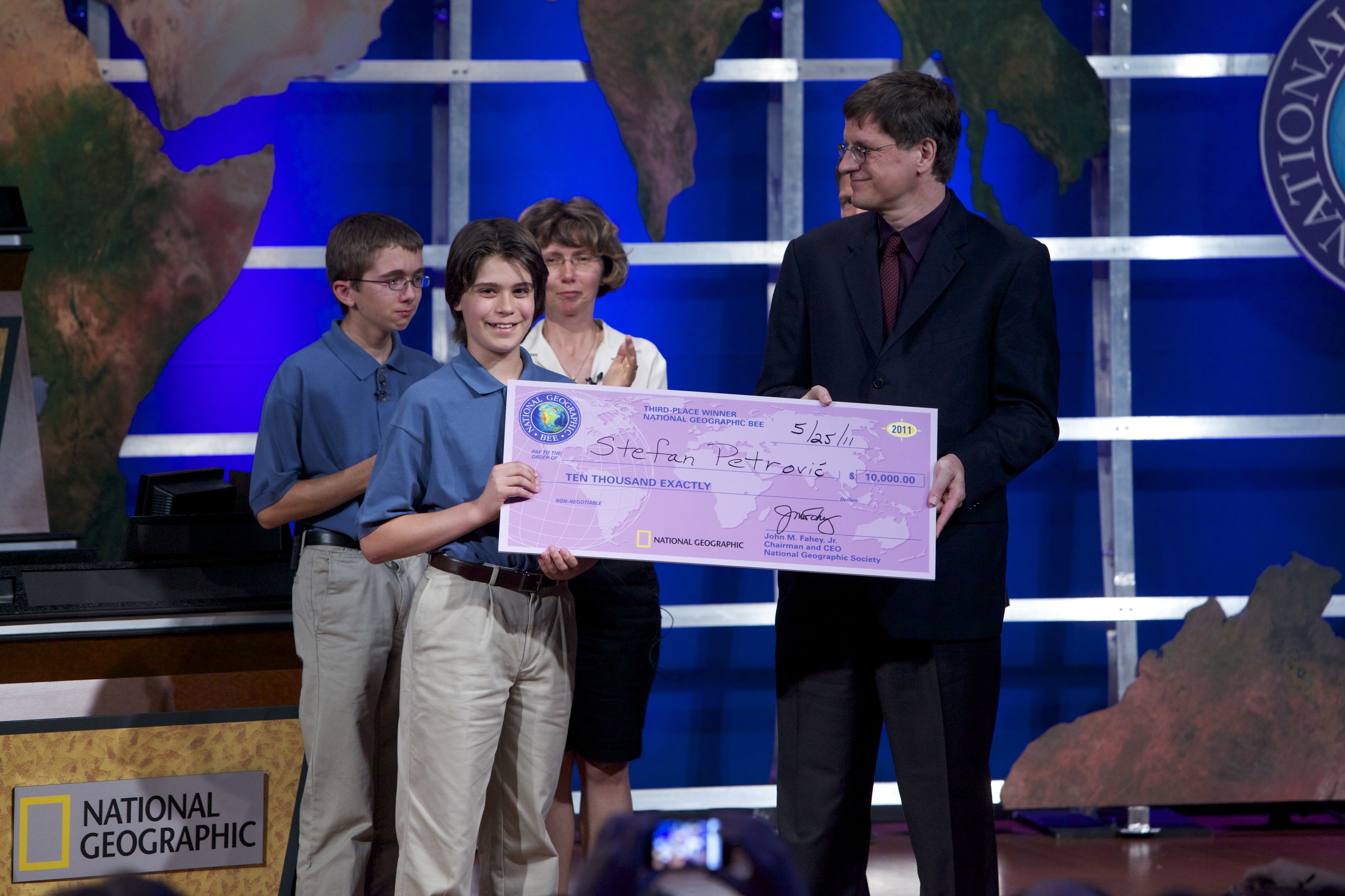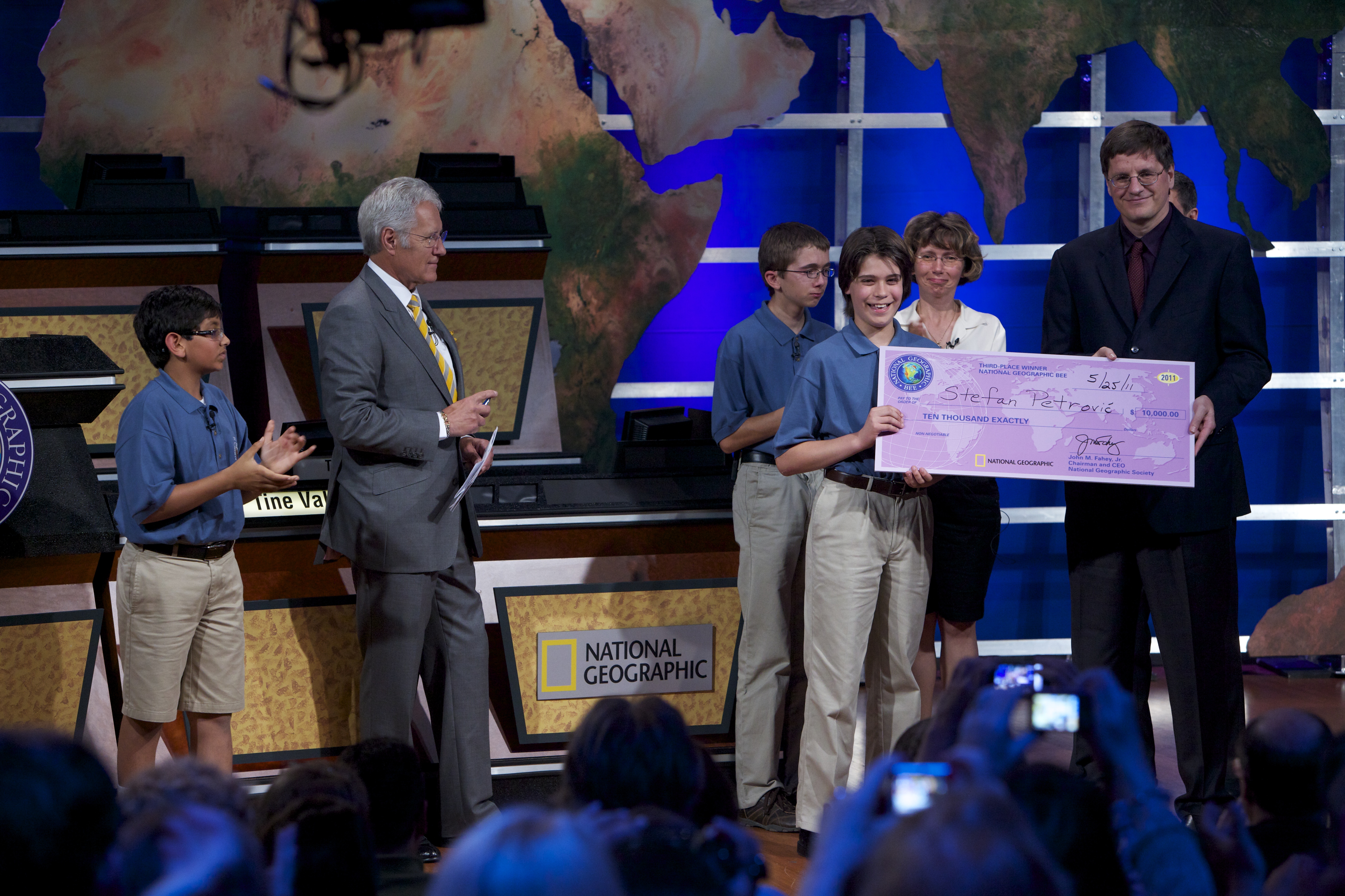 Stefan Petrovic, who will be an eighth-grader at South Middle School, joins Lawrence High School alum Brian McClendon, vice president for Google Earth and Maps, in holding a $10,000 scholarship check Petrovic won in the National Geographic Bee in Washington, D.C., an event for which the National Geographic Society and Google were sponsors. " ‘Jeopardy!’ host Alex Trebek" is the answer to this question under the "Identities" category: "Who is the other guy on stage, in the gray suit?"