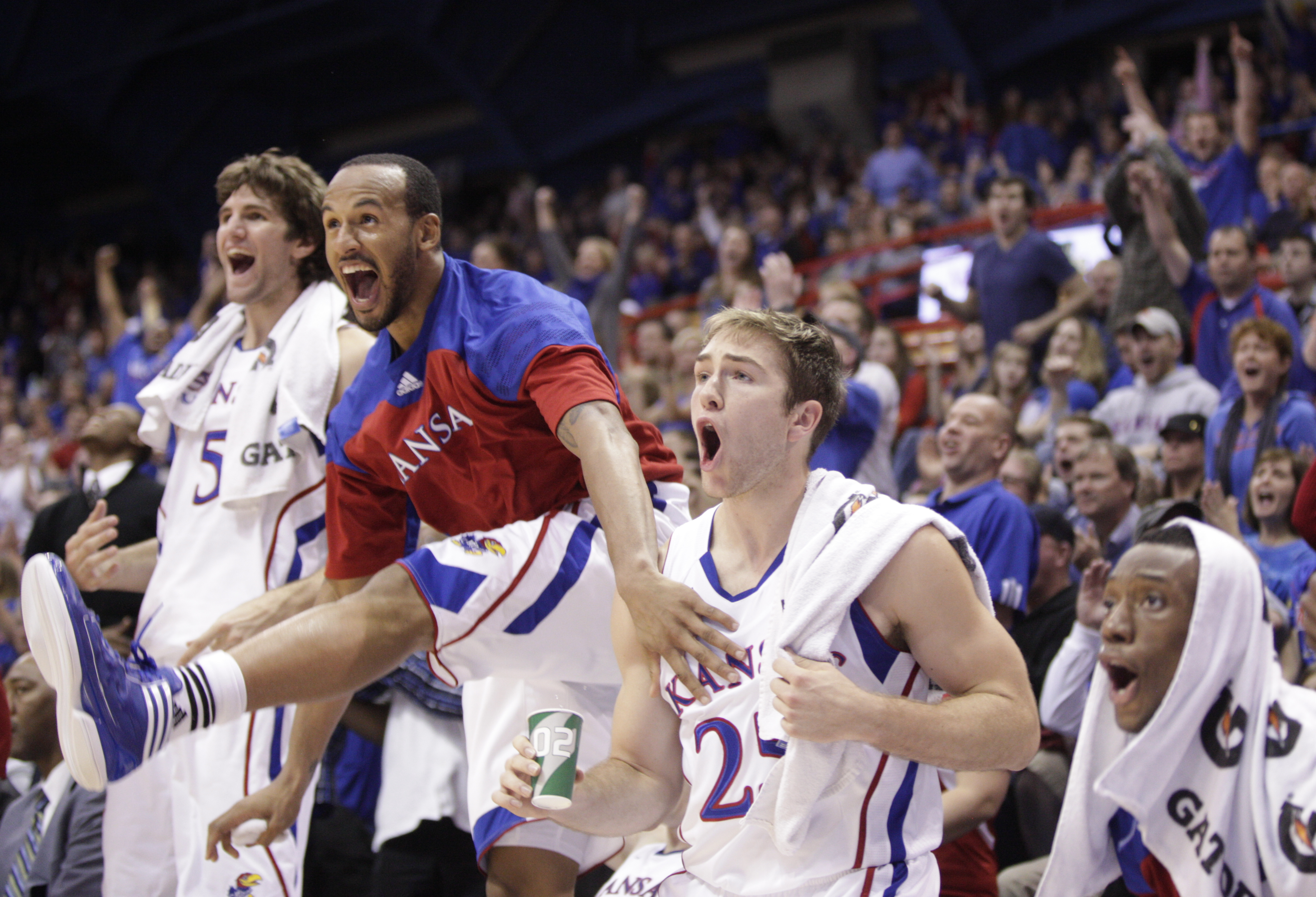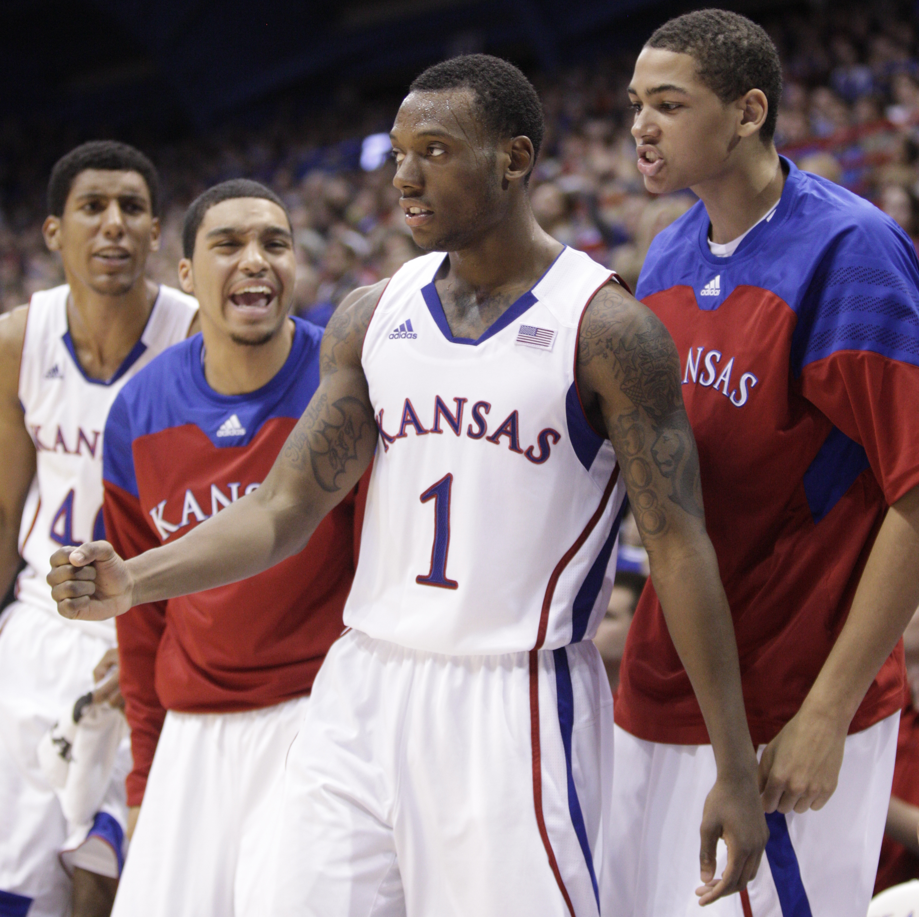 Kansas guard Travis Releford, second from left, explodes off the bench in celebration of a dunk by teammate Merv Lindsay, along with Jeff Withey, left, Jordan Juenemann and Naadir Tharpe late in the second half on Tuesday, Nov. 8, 2011 at Allen Fieldhouse.