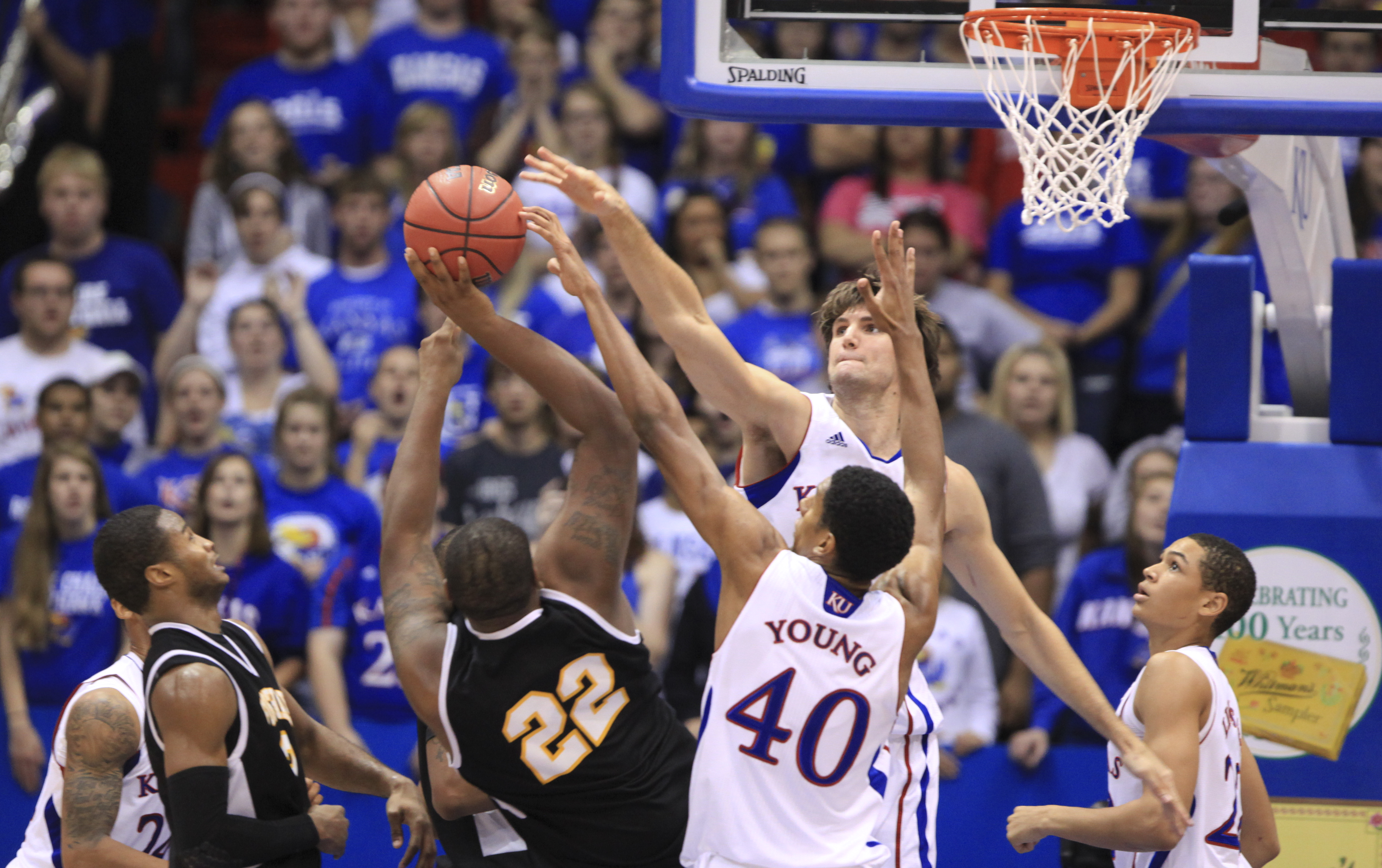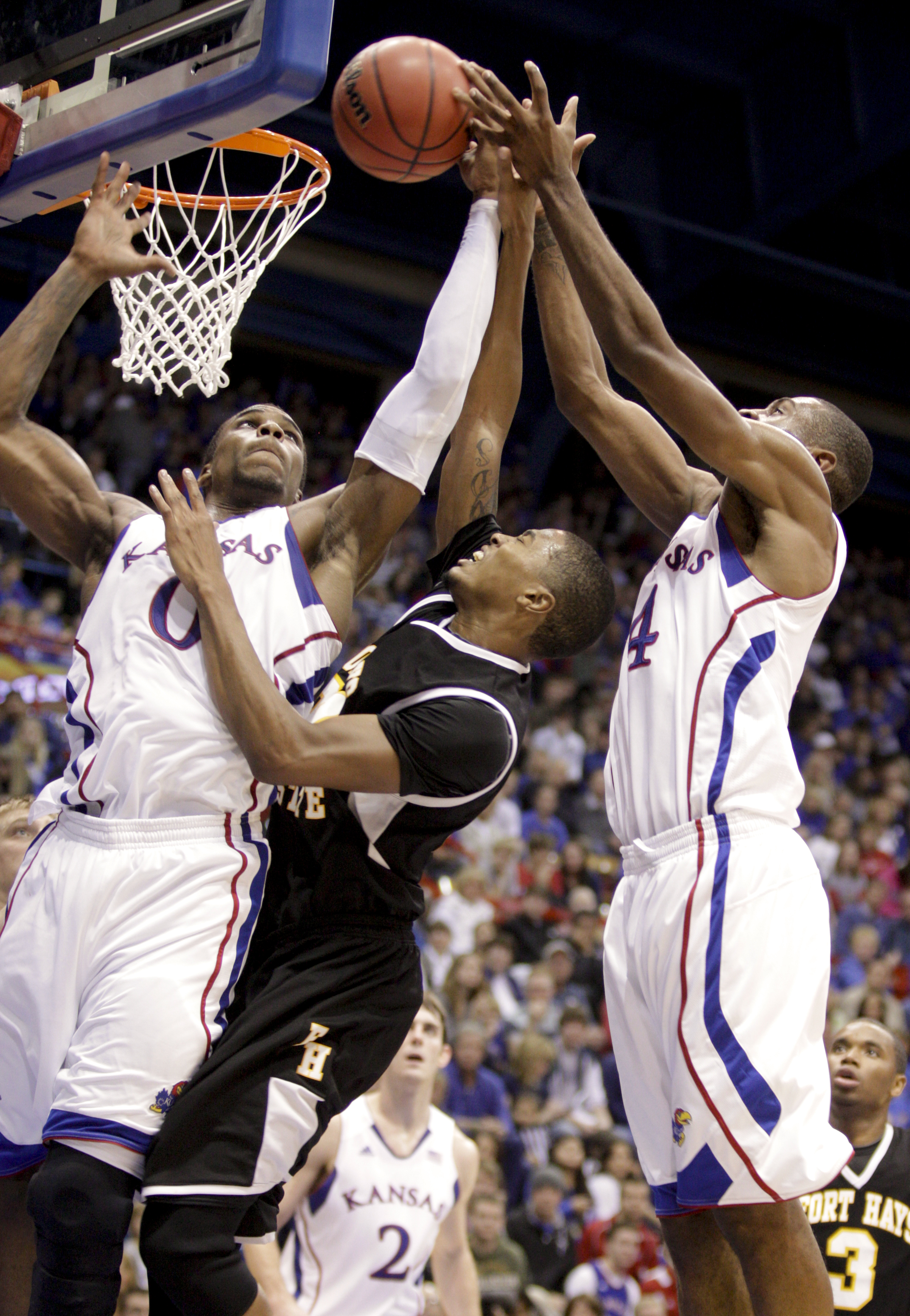 Kansas center Jeff Withey and forward Kevin Young, stuff a shot by Fort Hays State forward Markus Yarbrough during the second half on Tuesday, Nov. 8, 2011 at Allen Fieldhouse.