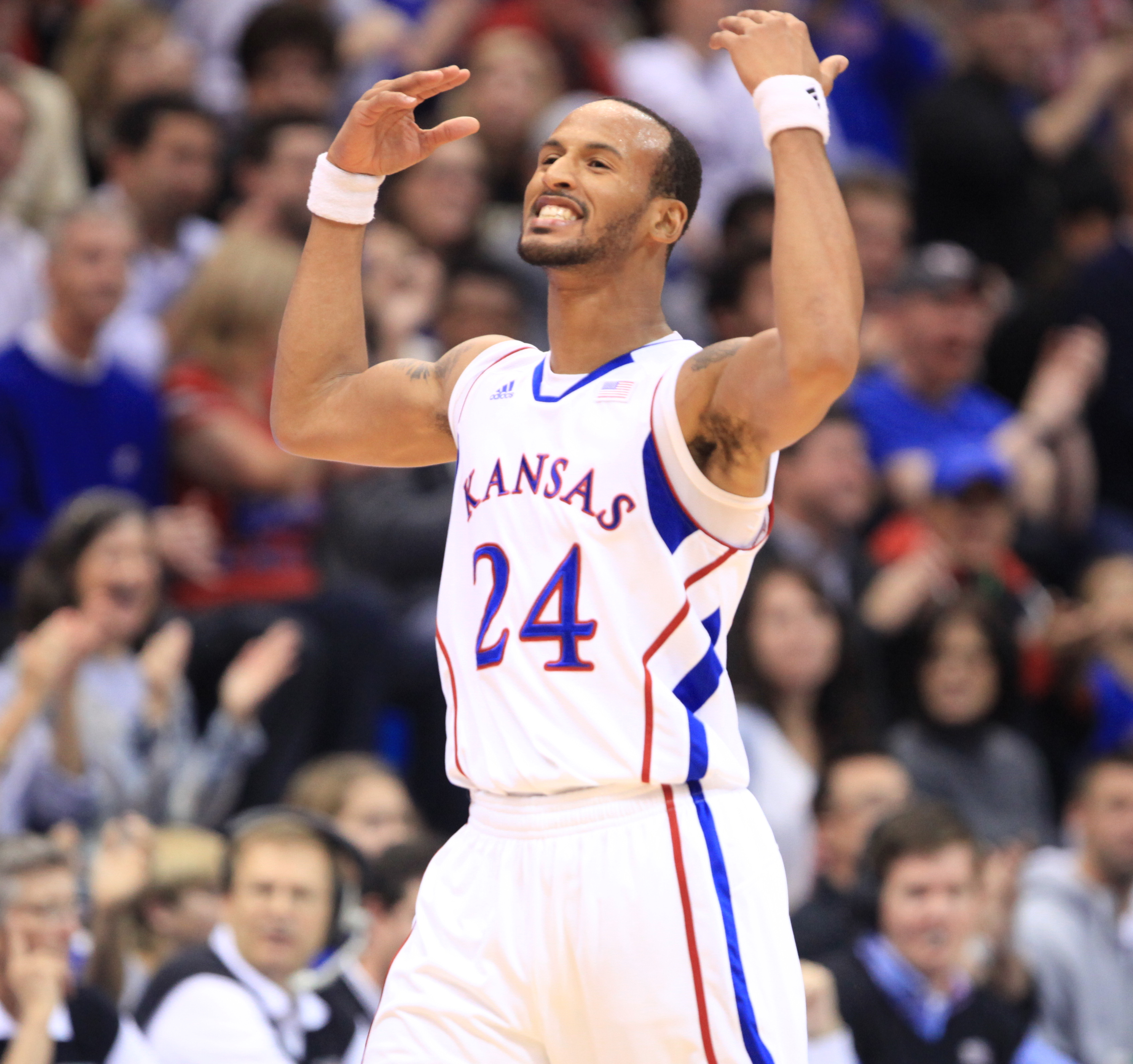 Kansas guard Travis Releford raises the roof at Allen Fieldhouse after a steal and a made bucket by the Jayhawks against Fort Hays State during the first half on Tuesday, Nov. 8, 2011 at Allen Fieldhouse.
