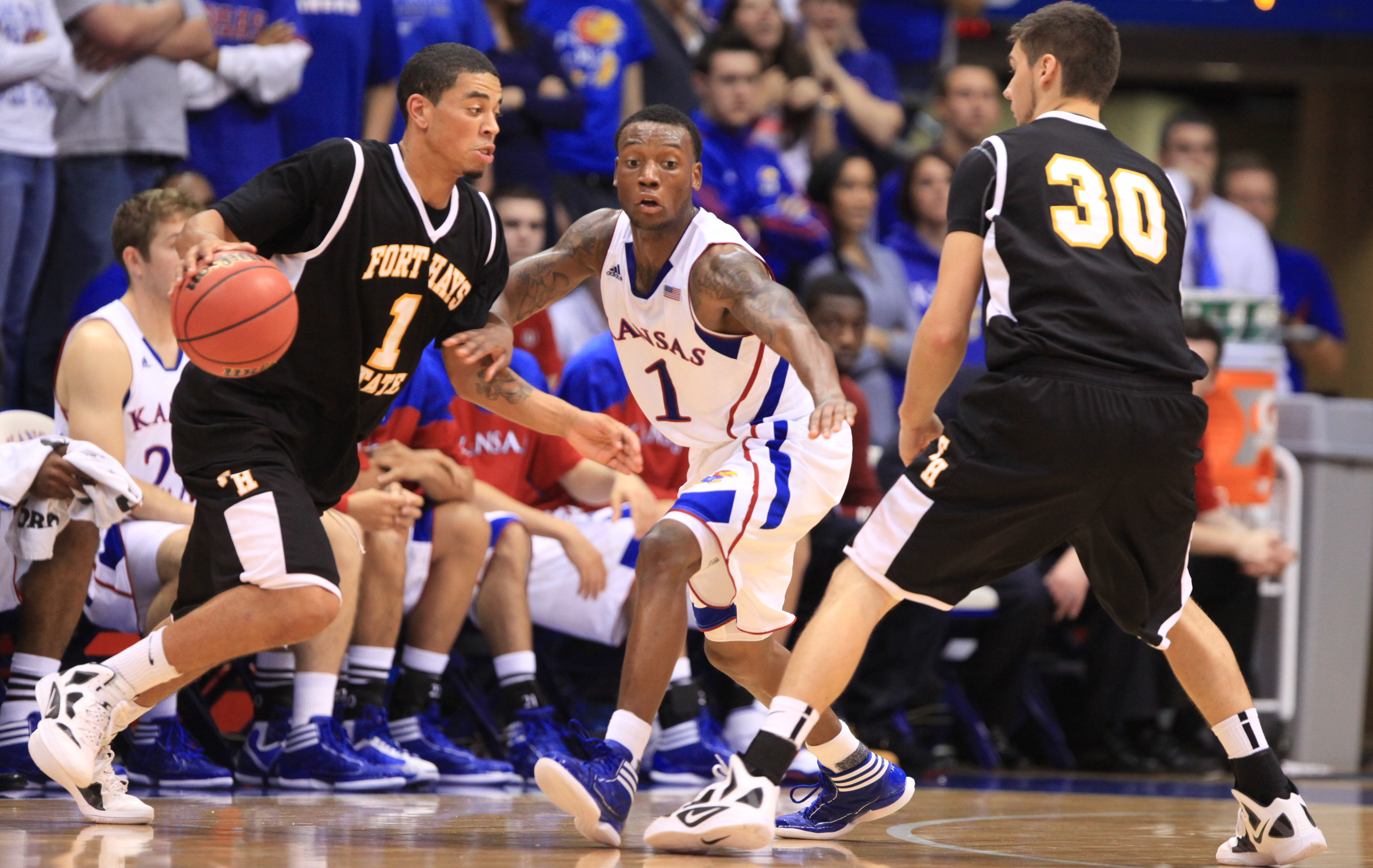 Kansas guard Naadir Tharpe looks to fight through a screen by Fort Hays State forward K.C. Rodenburg (30) while defending Omar McDade (1) during the first half on Tuesday, Nov. 8, 2011 at Allen Fieldhouse.