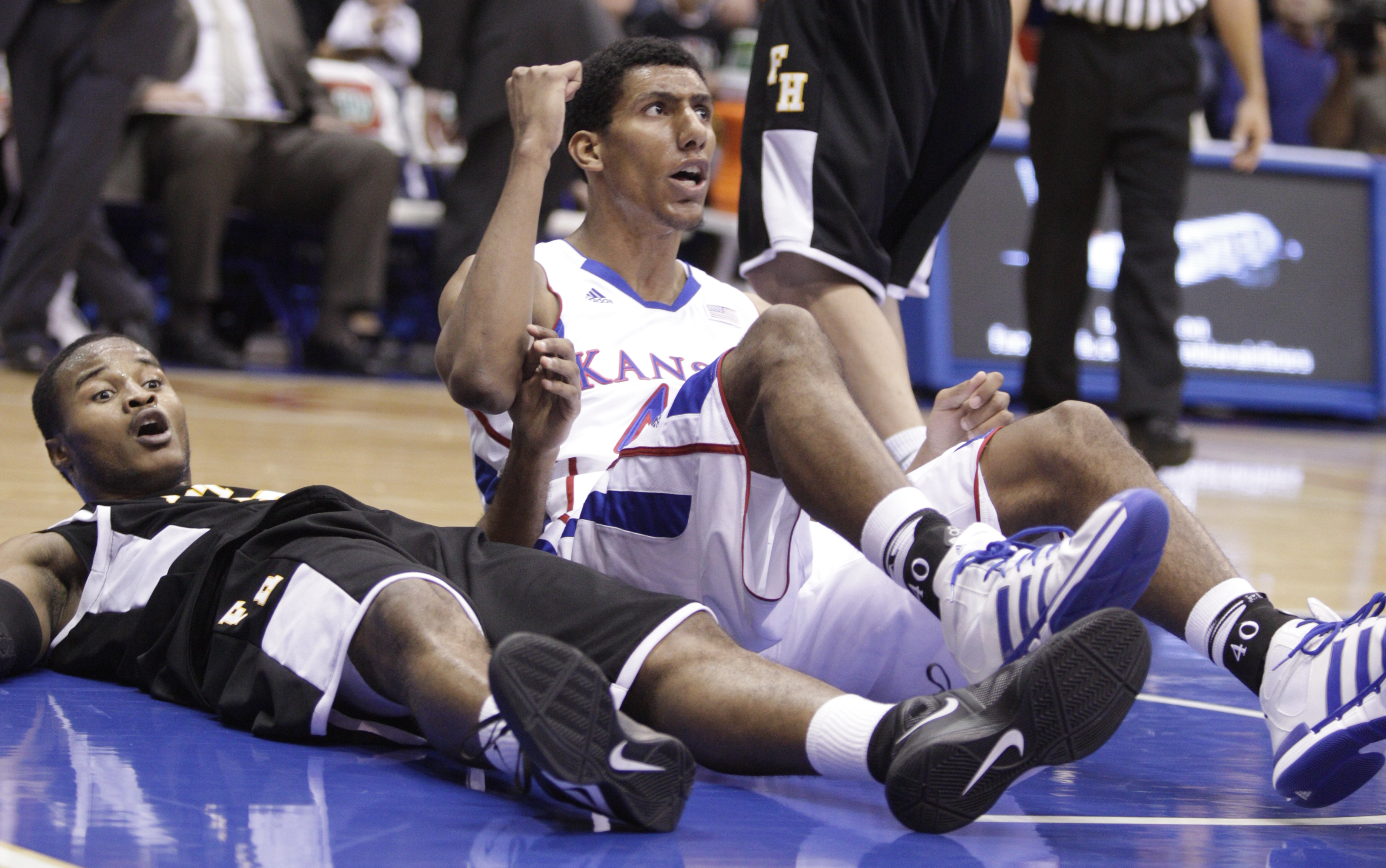 Kansas forward Kevin Young pumps his fist as Fort Hays State guard Karron Mckenzie shows surprise at a call after a made bucket during the first half on Tuesday, Nov. 8, 2011 at Allen Fieldhouse.