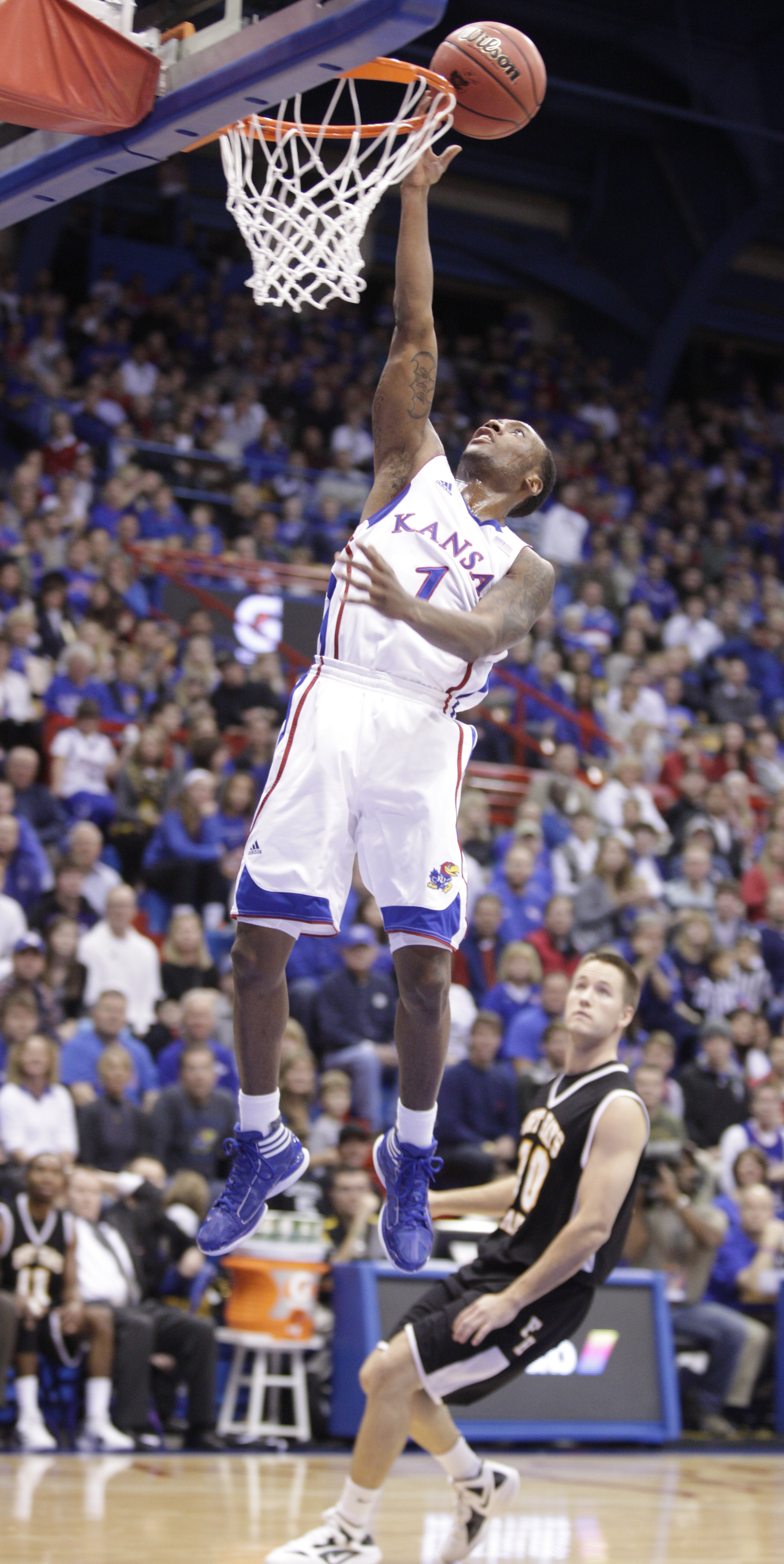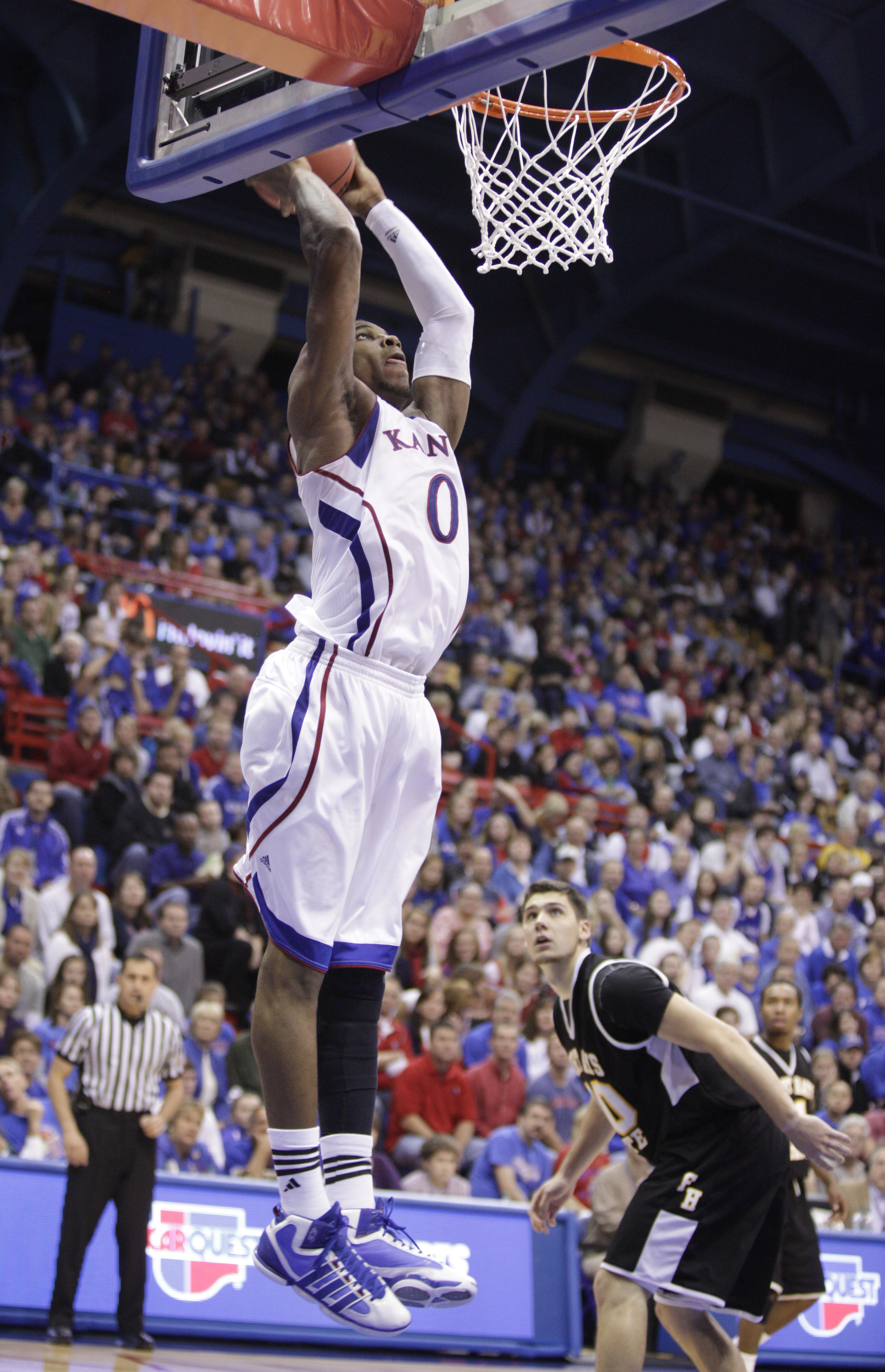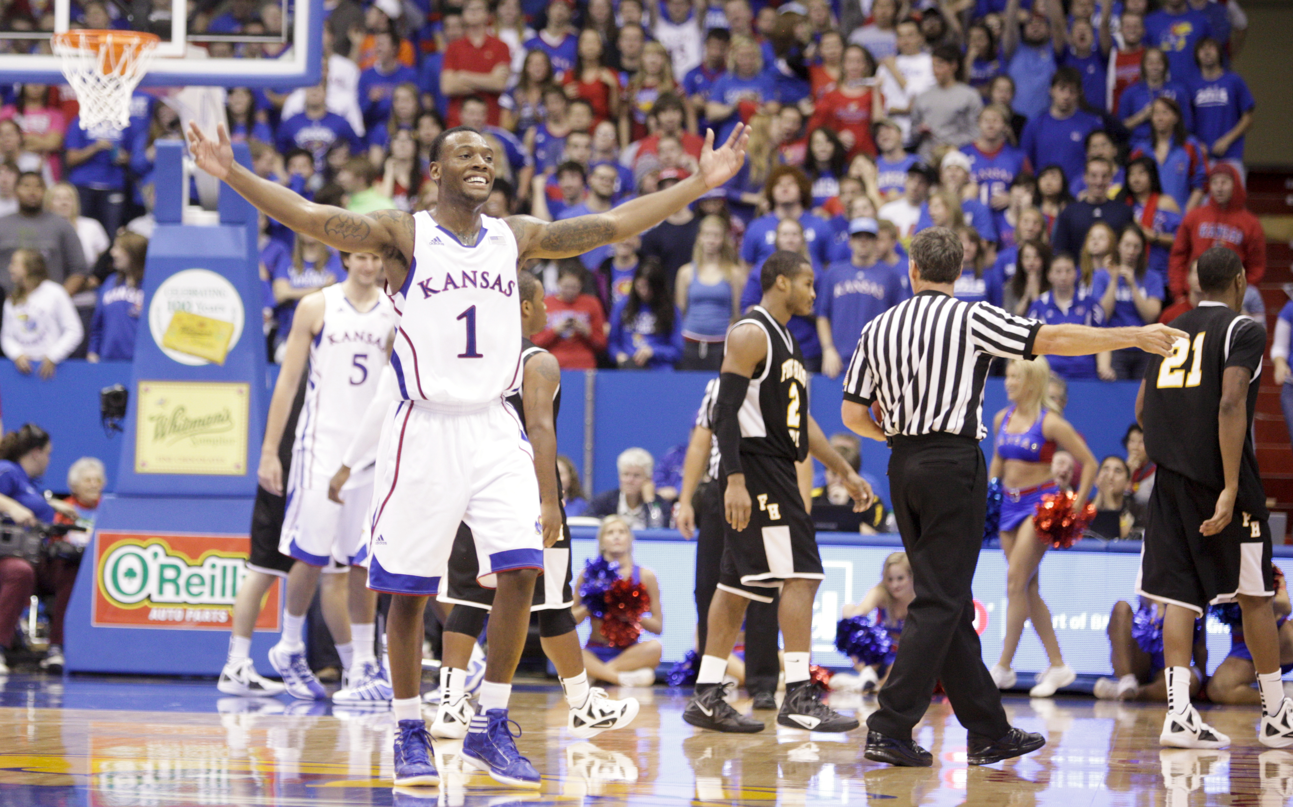 Kansas guard Naadir Tharpe raises up the Fieldhouse during a run by the Jayhawks against Fort Hays State during the second half on Tuesday, Nov. 8, 2011 at Allen Fieldhouse.