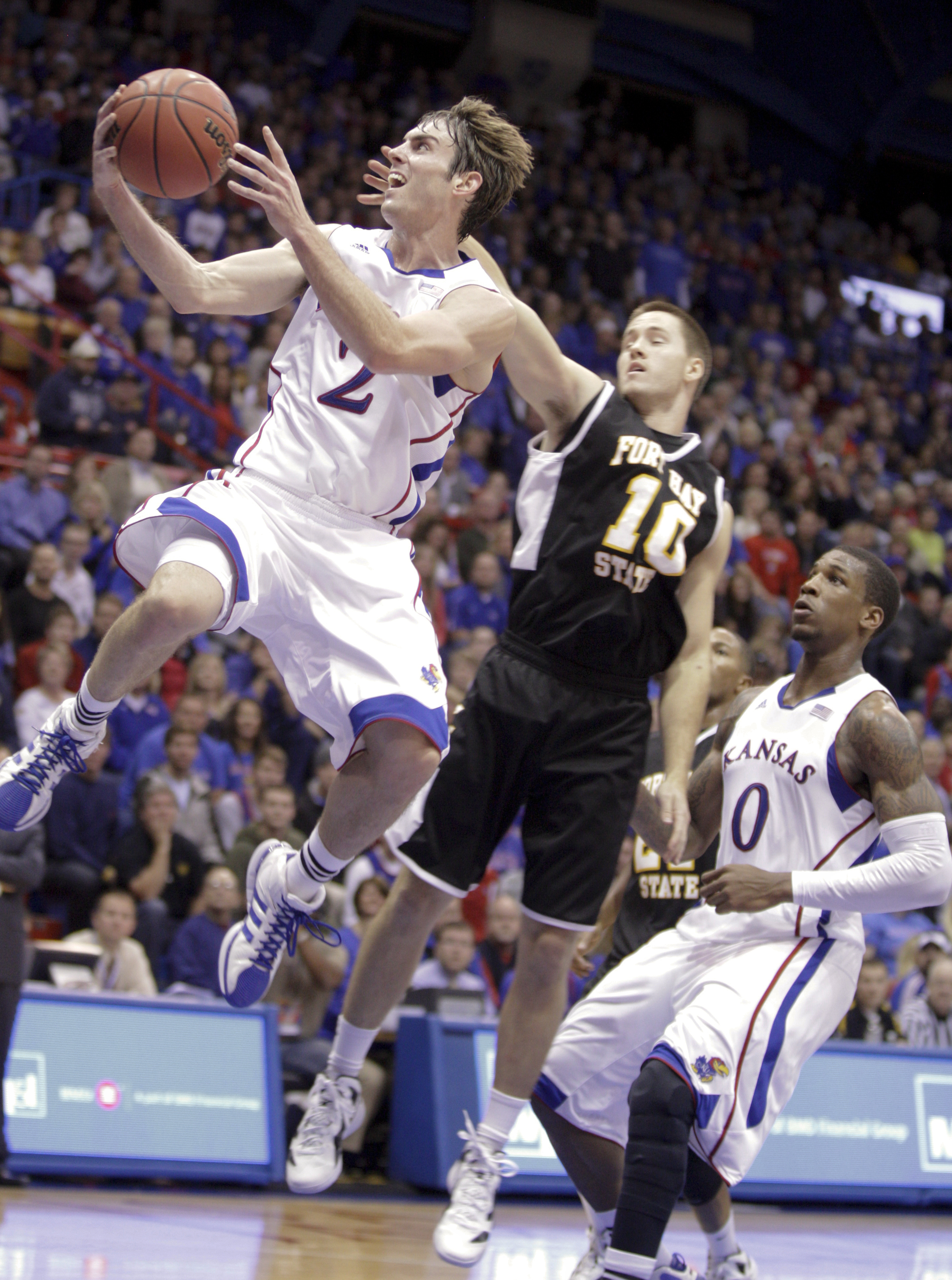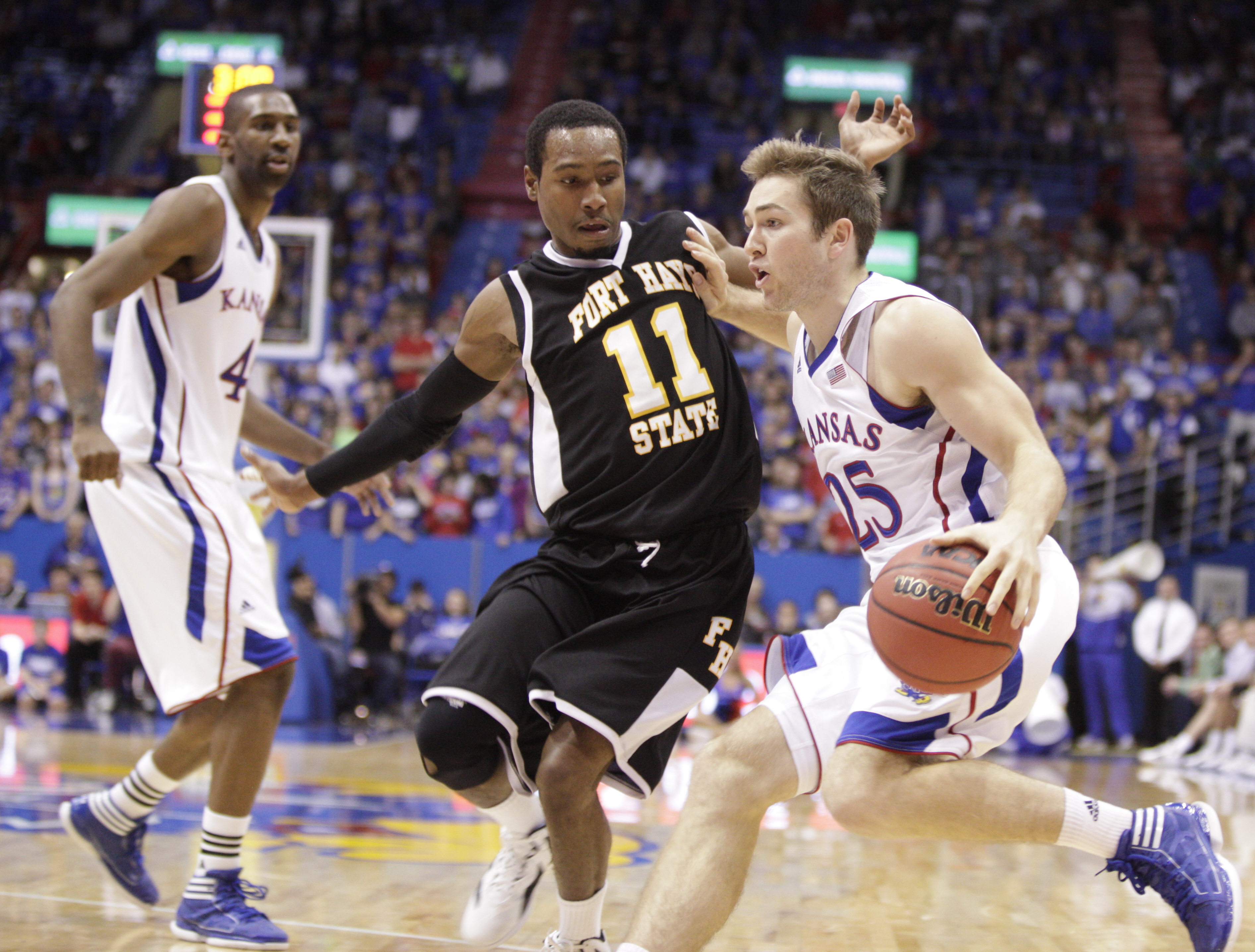 Kansas guard Conner Teahan swoops past Fort Hays State guard Jason Ball and teammate Thomas Robinson for a bucket during the first half on Tuesday, Nov. 8, 2011 at Allen Fieldhouse.