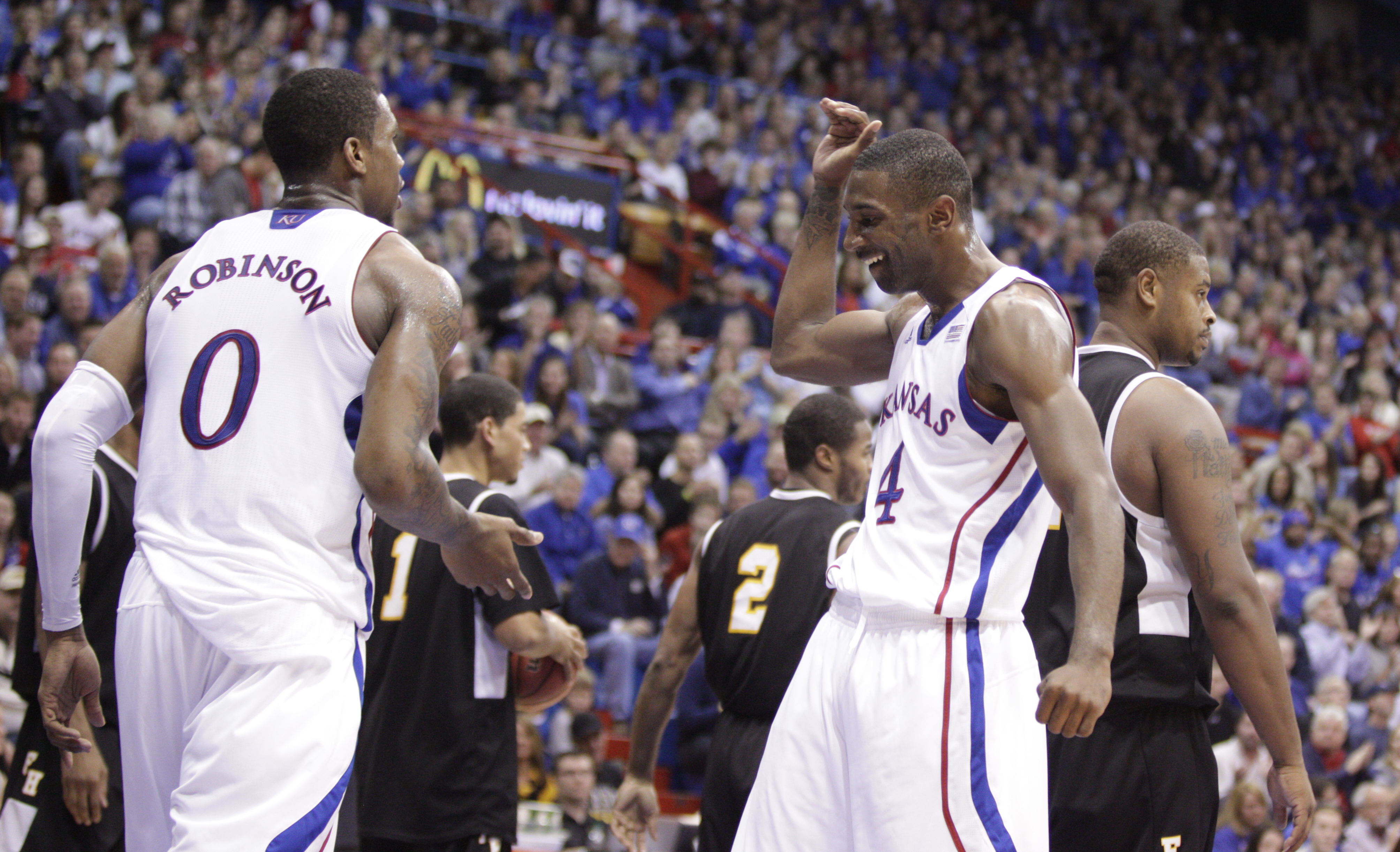 Teammates Justin Wesley (4) and Thomas Robinson slap hands after a Robinson converted a bucket and a foul against Fort Hays State during the first half on Tuesday, Nov. 8, 2011 at Allen Fieldhouse.