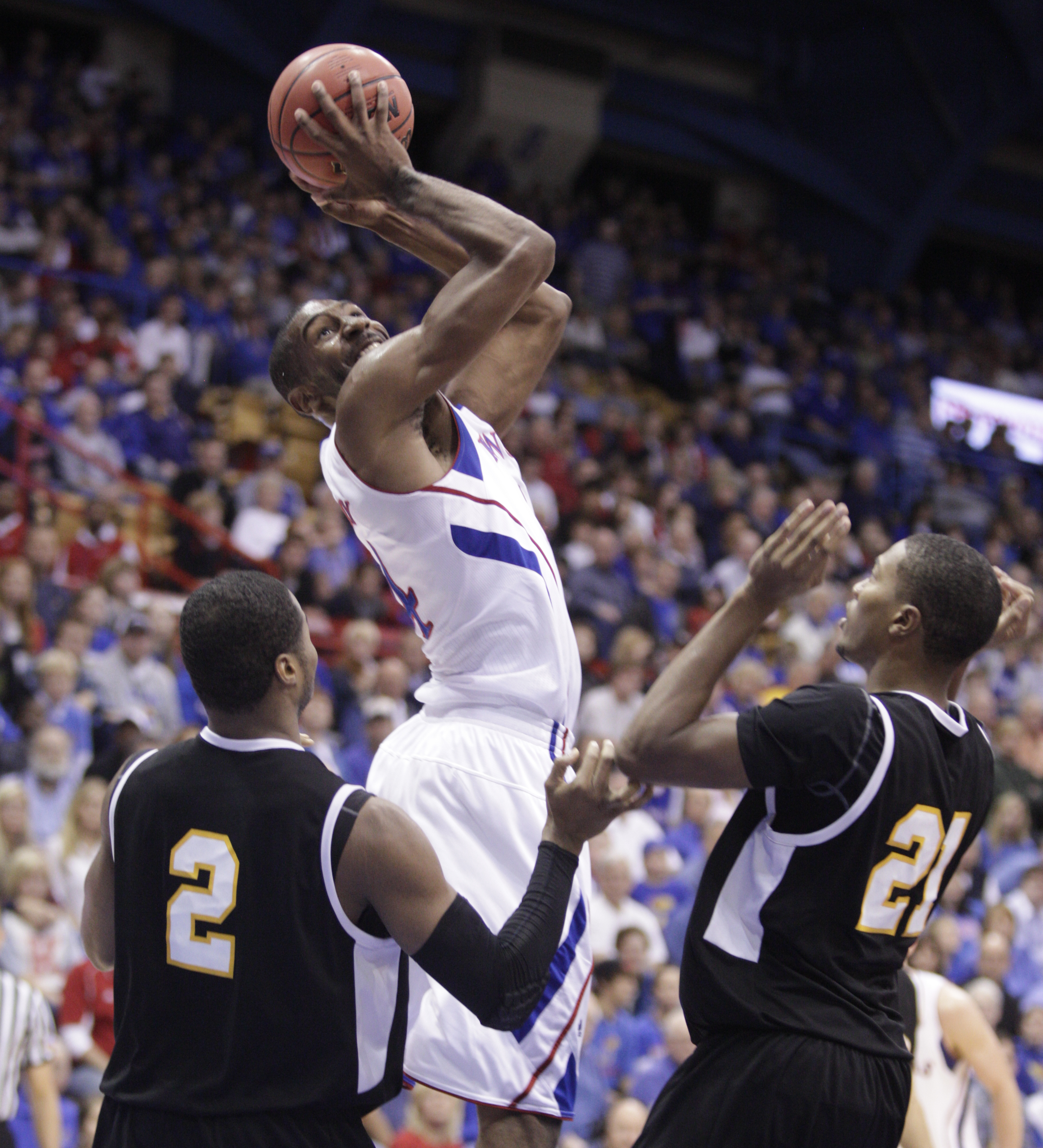 Kansas forward Justin Wesley goes up to the bucket between Fort Hays State defenders Karron Mckenzie (2) and Lance Russell (21) during the second half on Tuesday, Nov. 8, 2011 at Allen Fieldhouse.