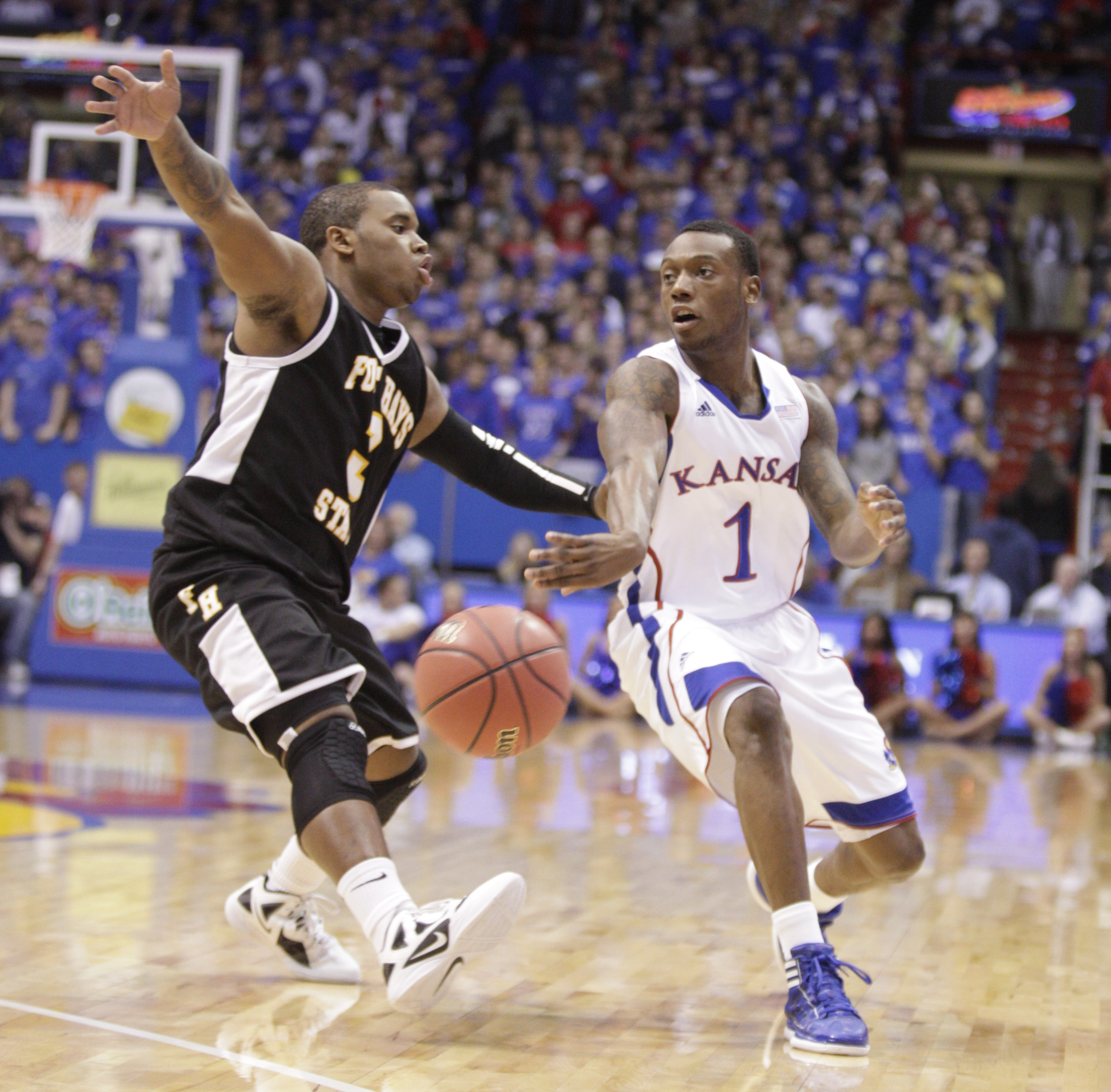 Kansas guard Naadir Tharpe pushes a pass beyond Fort Hays State guard Karron Mckenzie during the first half on Tuesday, Nov. 8, 2011 at Allen Fieldhouse.