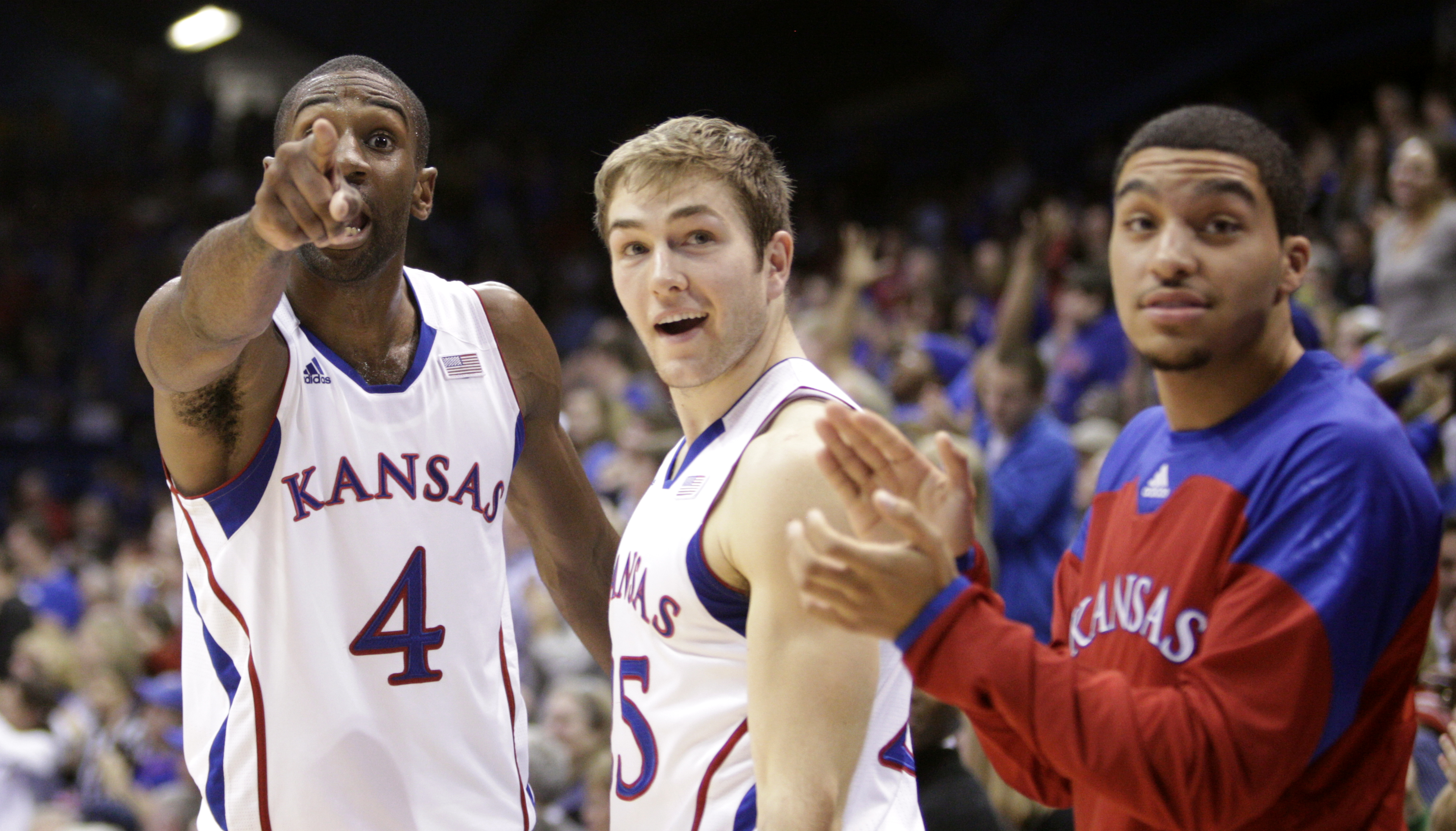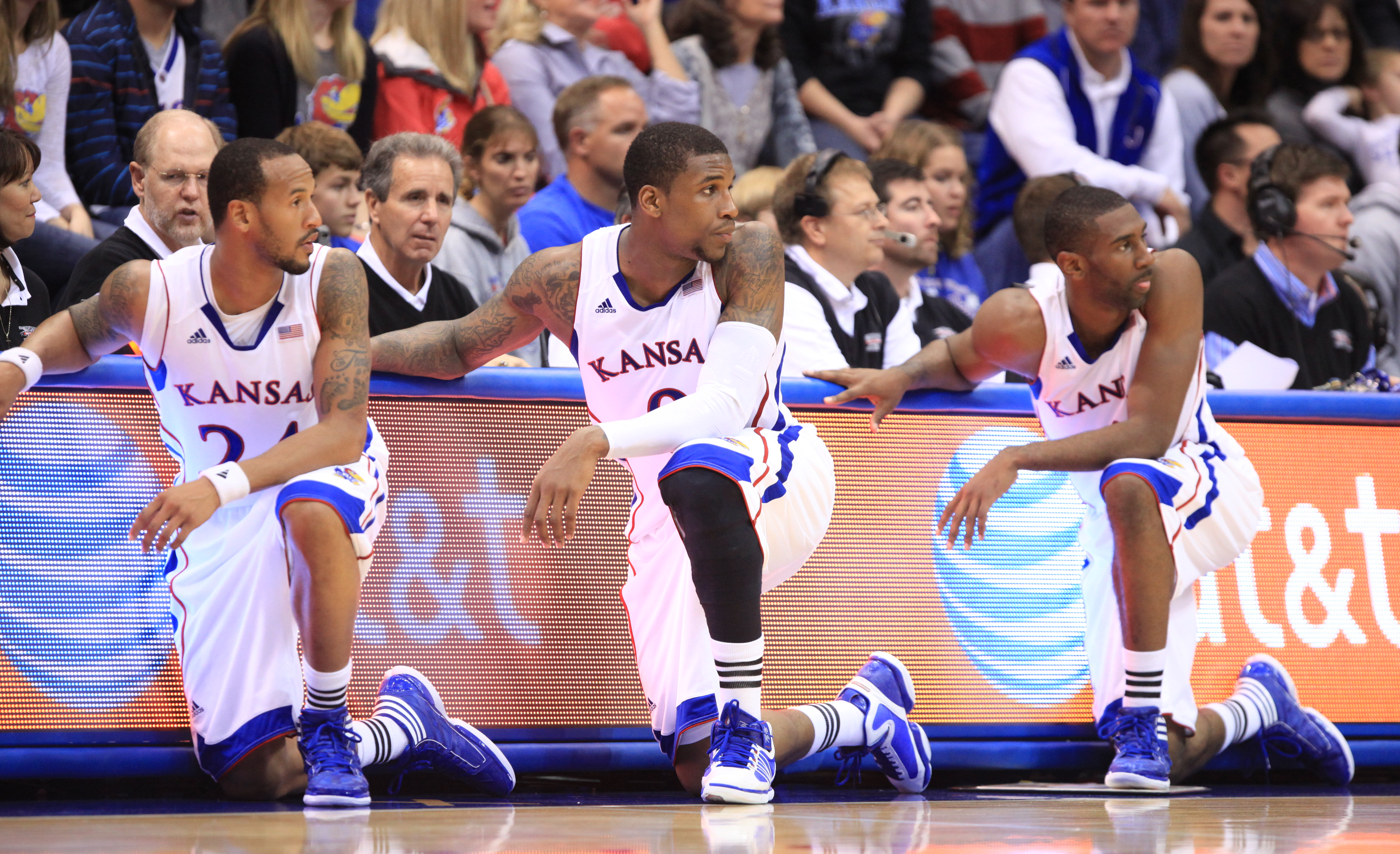Kansas teammates Travis Releford, left, Thomas Robinson and Justin Wesley strike a similar pose as the three wait to check into the game against Fort Hays State during the first half on Tuesday, Nov. 8, 2011 at Allen Fieldhouse.
