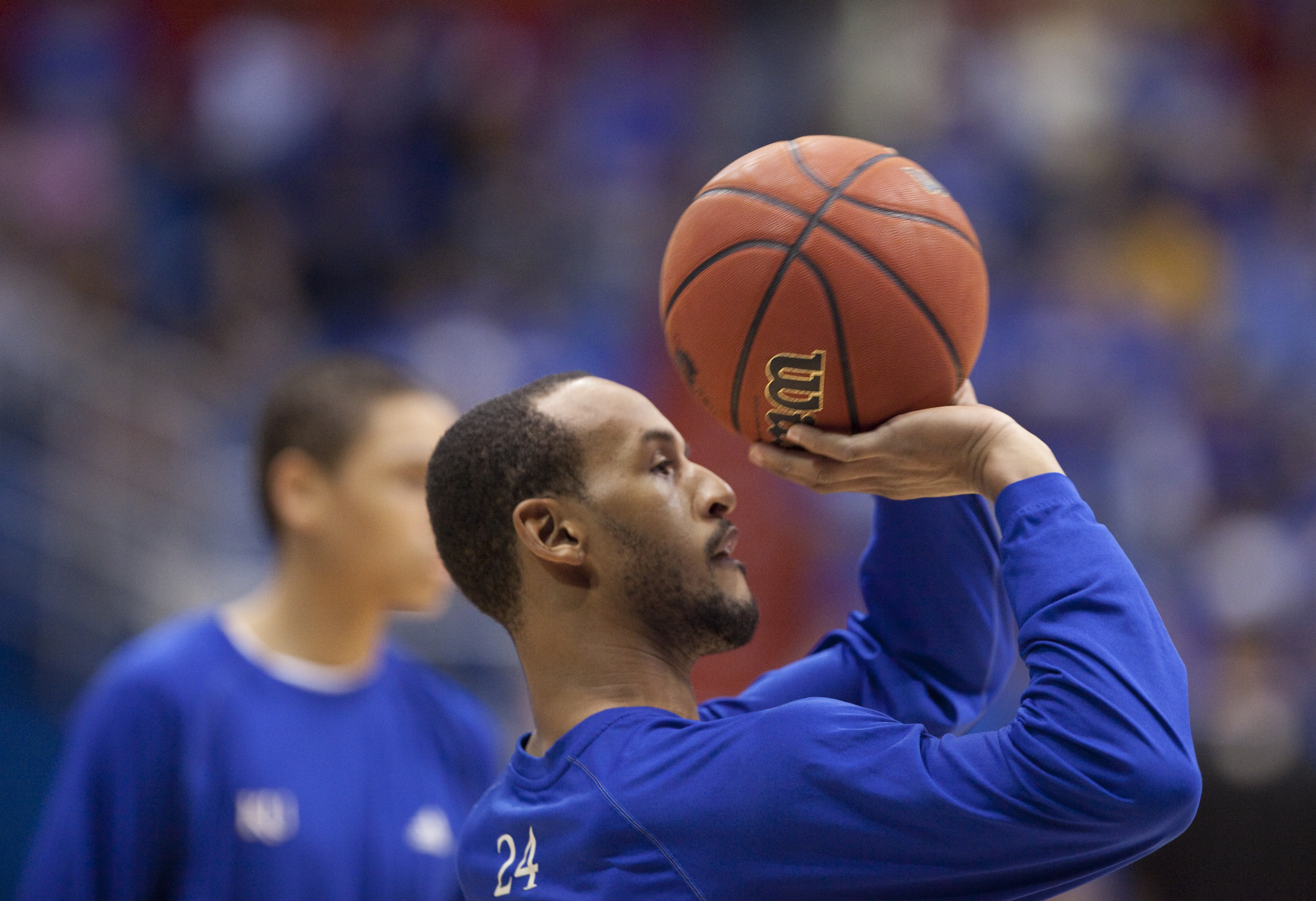 Kansas guard Travis Releford shoots during warmups prior to tipoff against Fort Hays State on Tuesday, Nov. 8, 2011 at Allen Fieldhouse.