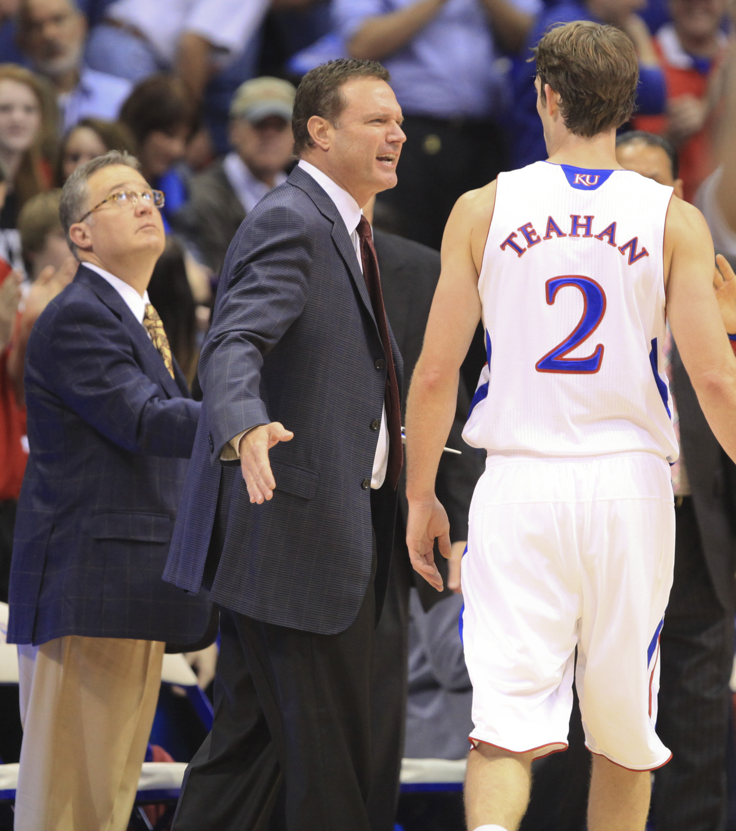Kansas guard Conner Teahan gets a congratulatory pat from head coach Bill Self after a bucket during a timeout against Fort Hays State on Tuesday, Nov. 8, 2011 at Allen Fieldhouse.