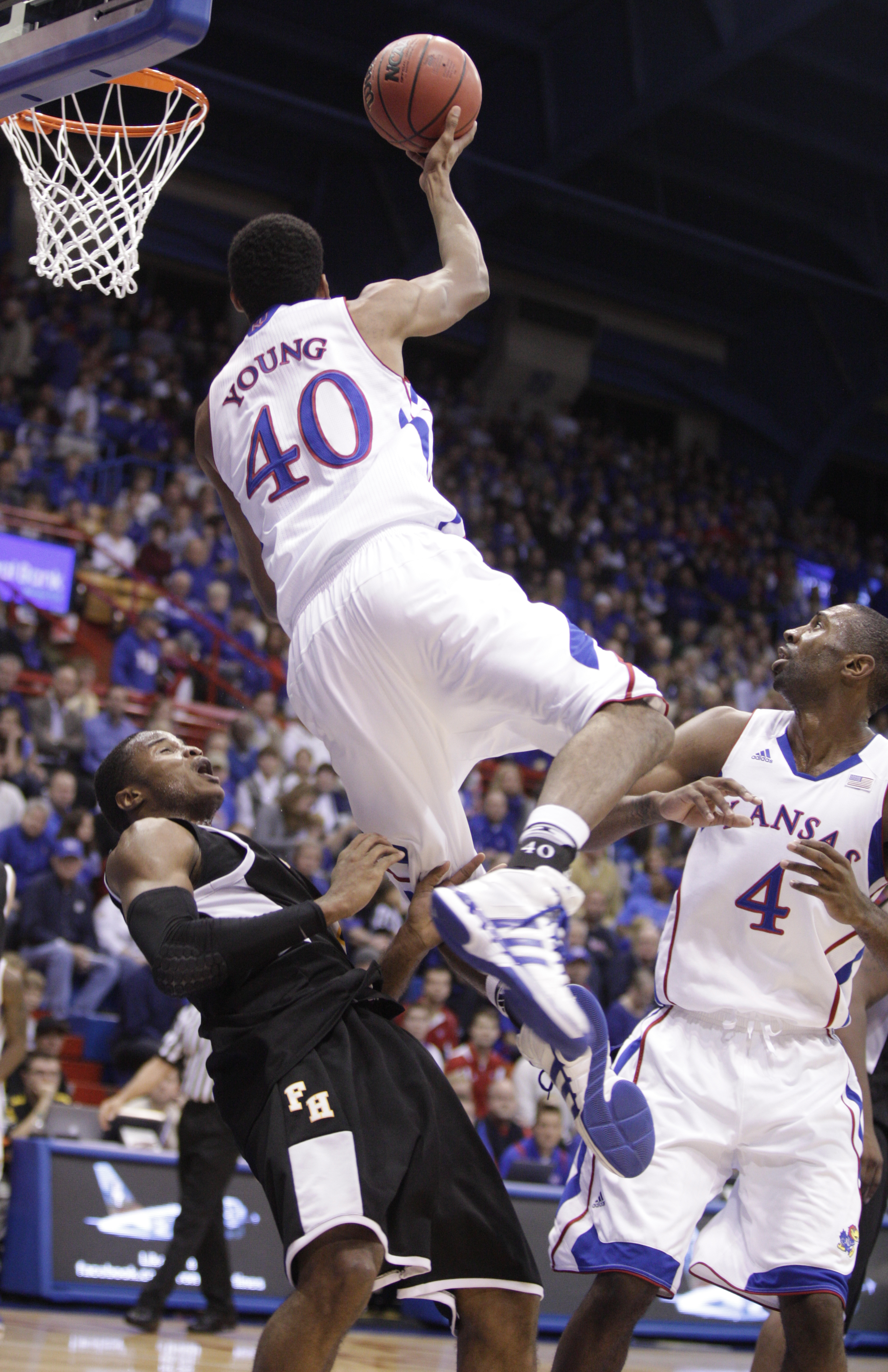 Kansas forward Kevin Young puts in an off-balance shot as he is fouled by Fort Hays State guard Karron Mckenzie during the first half on Tuesday, Nov. 8, 2011 at Allen Fieldhouse. At right is Kansas forward Justin Wesley.