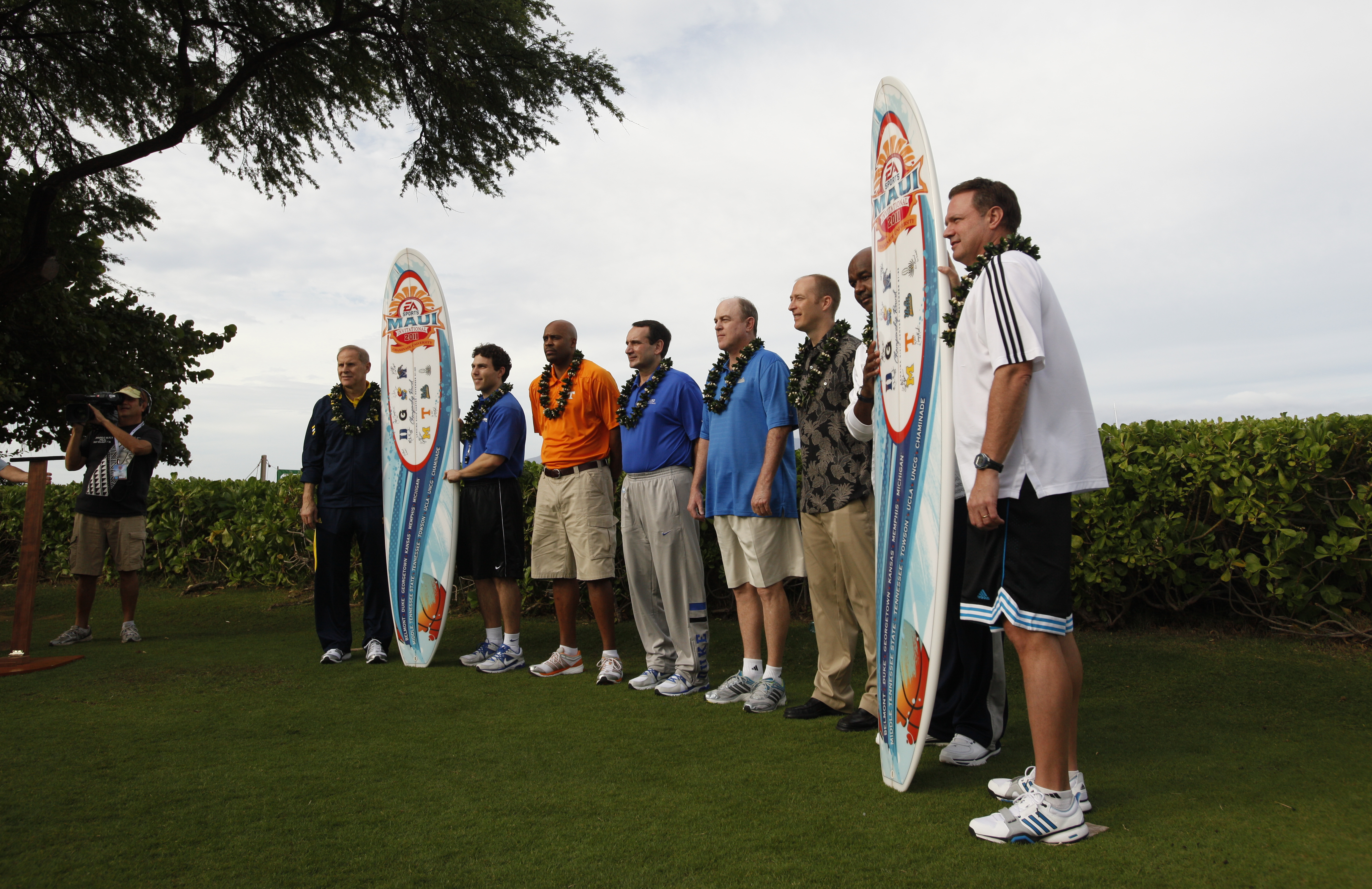 Kansas head coach Bill Self poses for a portrait with the lineup of coaches participating in the EA Sports Maui Invitational on Sunday, Nov. 20, 2011 on Kaanapali Beach in Lahaina. Beyond Self are John Thompson III, Georgetown, Eric Bovaird, Chaminade, Ben Howland, UCLA, Mike Krzyzewski, Duke, Cuonzo Martin, Tennessee, Josh Pastner, Memphis and John Beilein, Michigan.