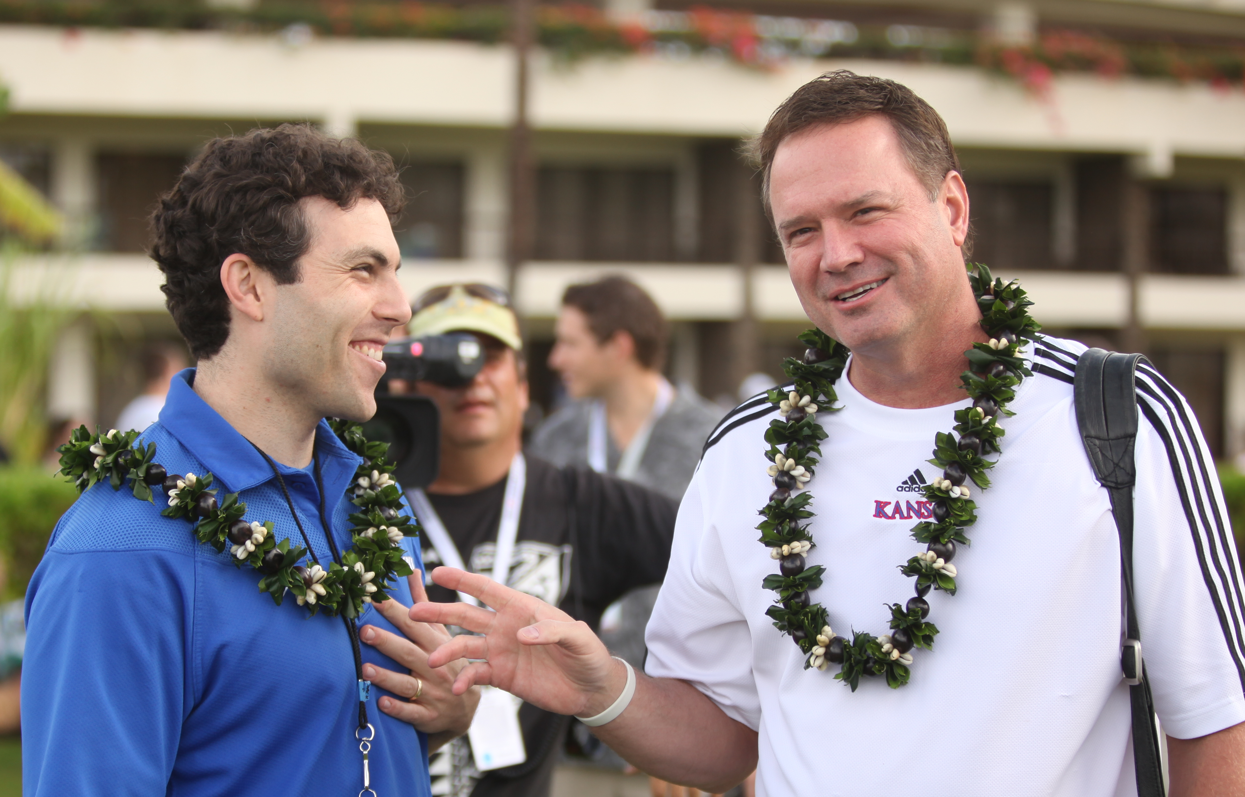 Kansas head coach Bill Self has a laugh with Memphis coach Josh Pastner prior to a press conference at the Sheraon Maui on Sunday, Nov. 20, 2011 on Kaanapali Beach in Lahaina.