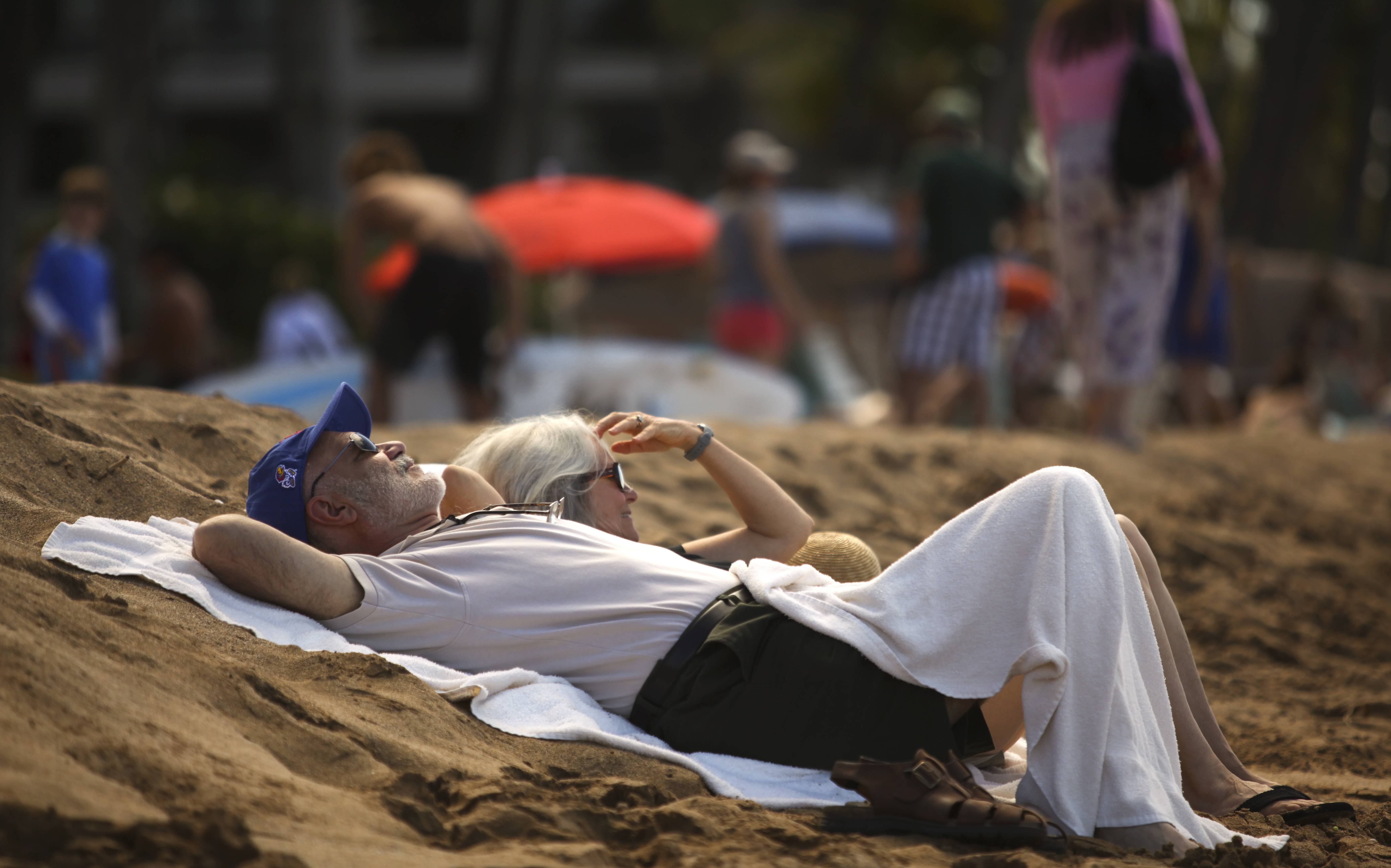 Jayhawk fans and Lawrence residents John and Muff Kelly relax on Kaanapali Beach before the Jayhawks' tipoff against UCLA, Tuesday, Nov. 22, 2011.