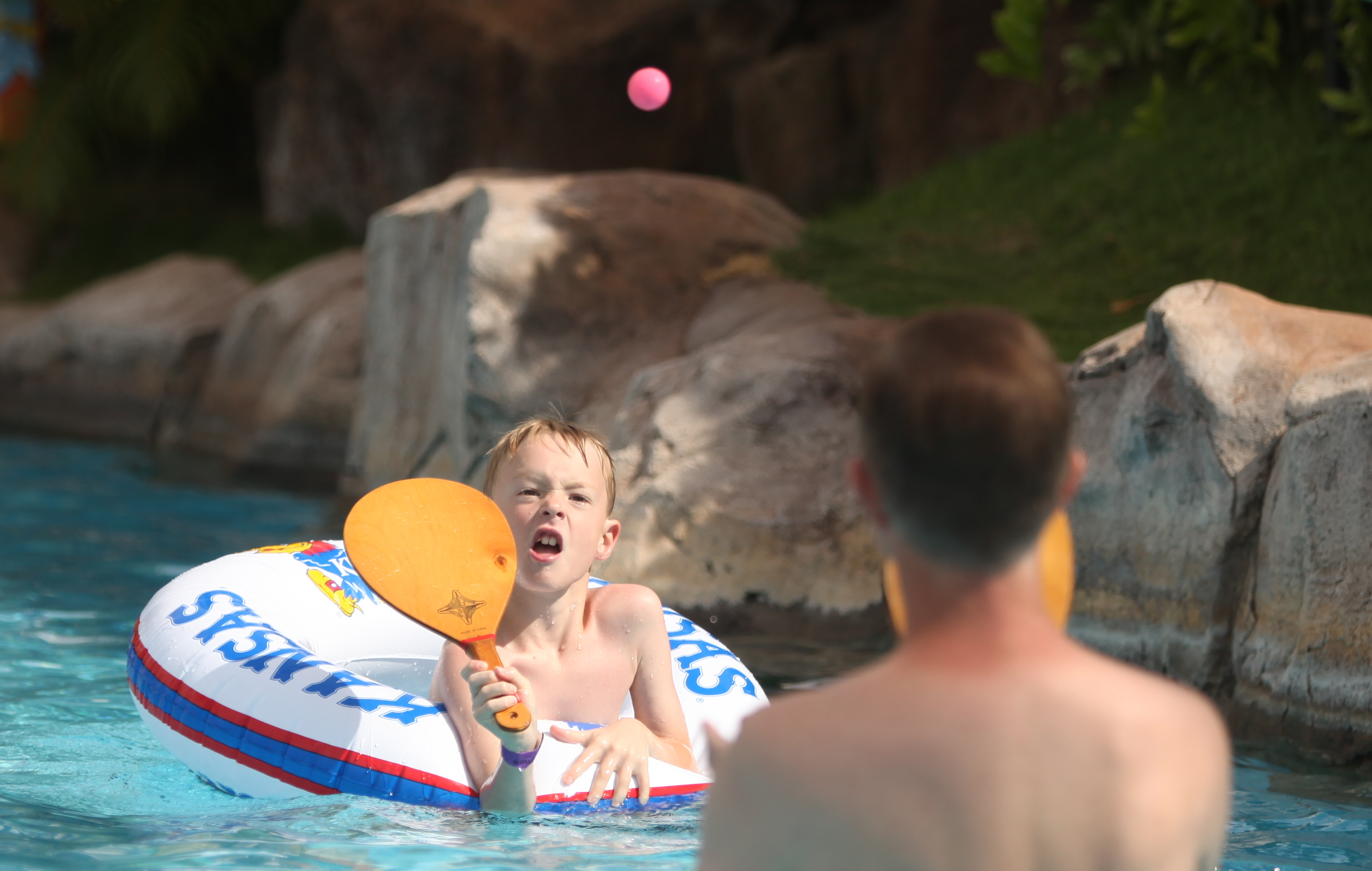Kansas fan Jack Hulst, 8, Denver, waits for a serve as he plays paddle ball with his dad Doug Hulst in the pool of the Westin Maui on Monday, Nov. 21, 2011 in Lahaina.