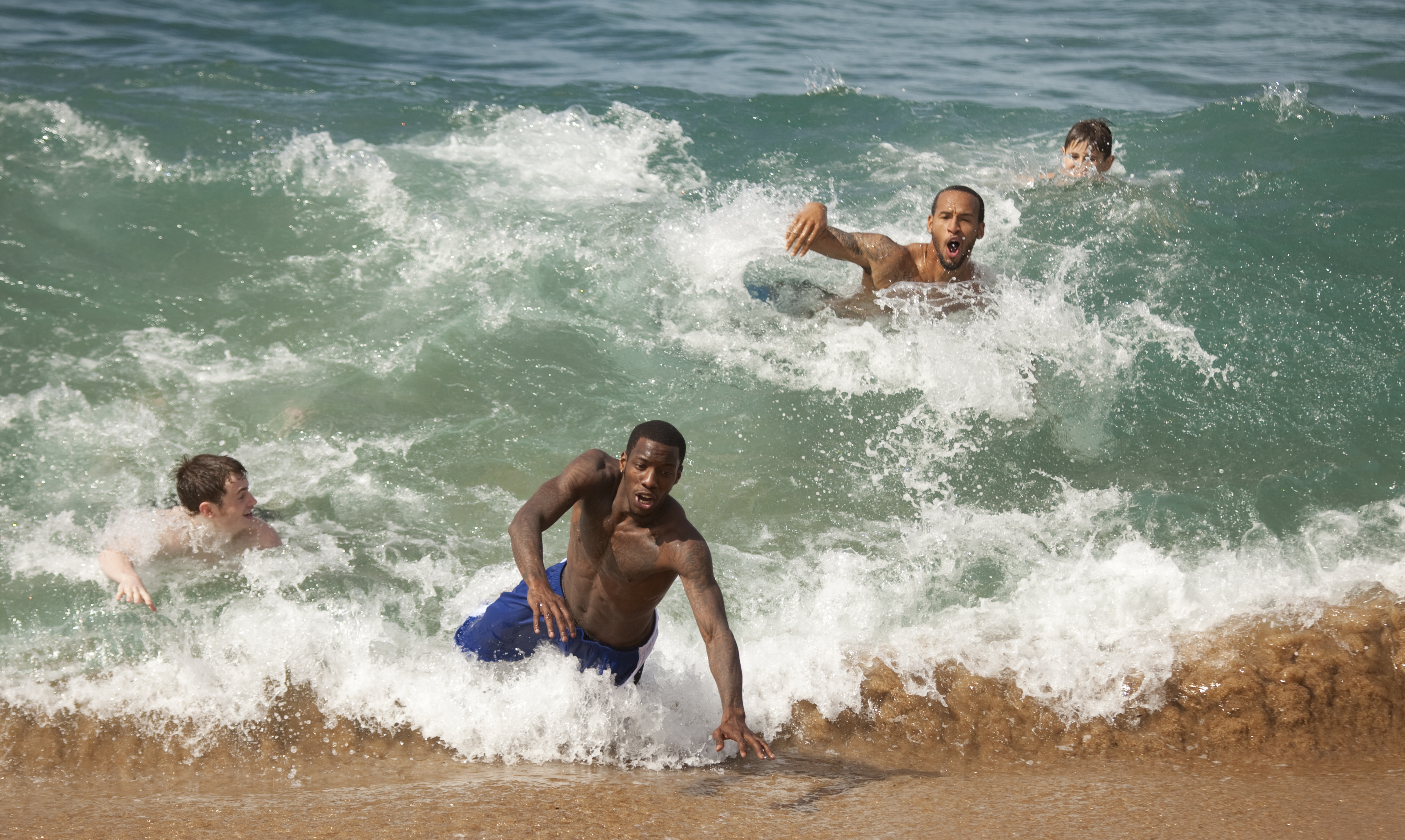 Kansas guards Tyshawn Taylor, left of center, Travis Releford and team video coordinator Doug Compton Jr., catch a wave during some free time before practice on Sunday, Nov. 20, 2011 on Kaanapali Beach in Lahaina. The Jayhawks take on Georgetown Monday night during the Maui Invitational.