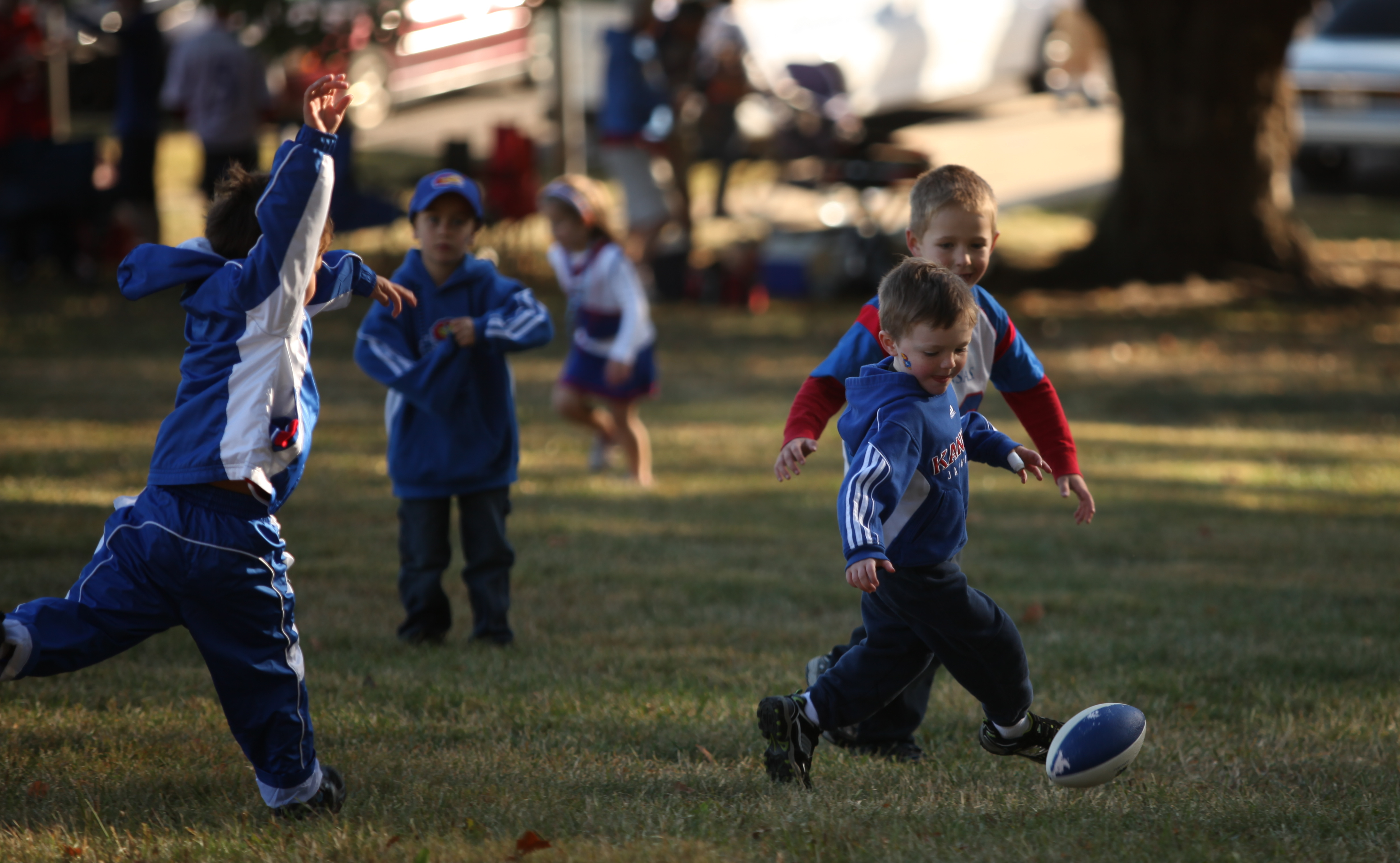 Jesse Gamblin, 5, Lawrence, front, is chased by Jacob Poteete, 6, Lawrence, as the young football fans play around on the hill before kickoff against Texas Tech outside Memorial Stadium on Saturday, Oct. 1, 2011.