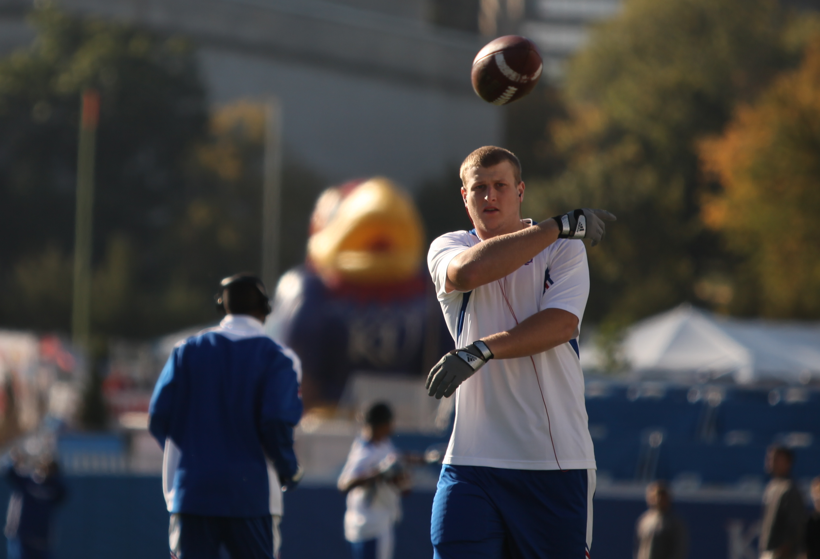 Kansas tight end Tim Biere tosses back a pass during warmups before taking on Texas Tech outside at Kivisto Field on Saturday, Oct. 1, 2011.