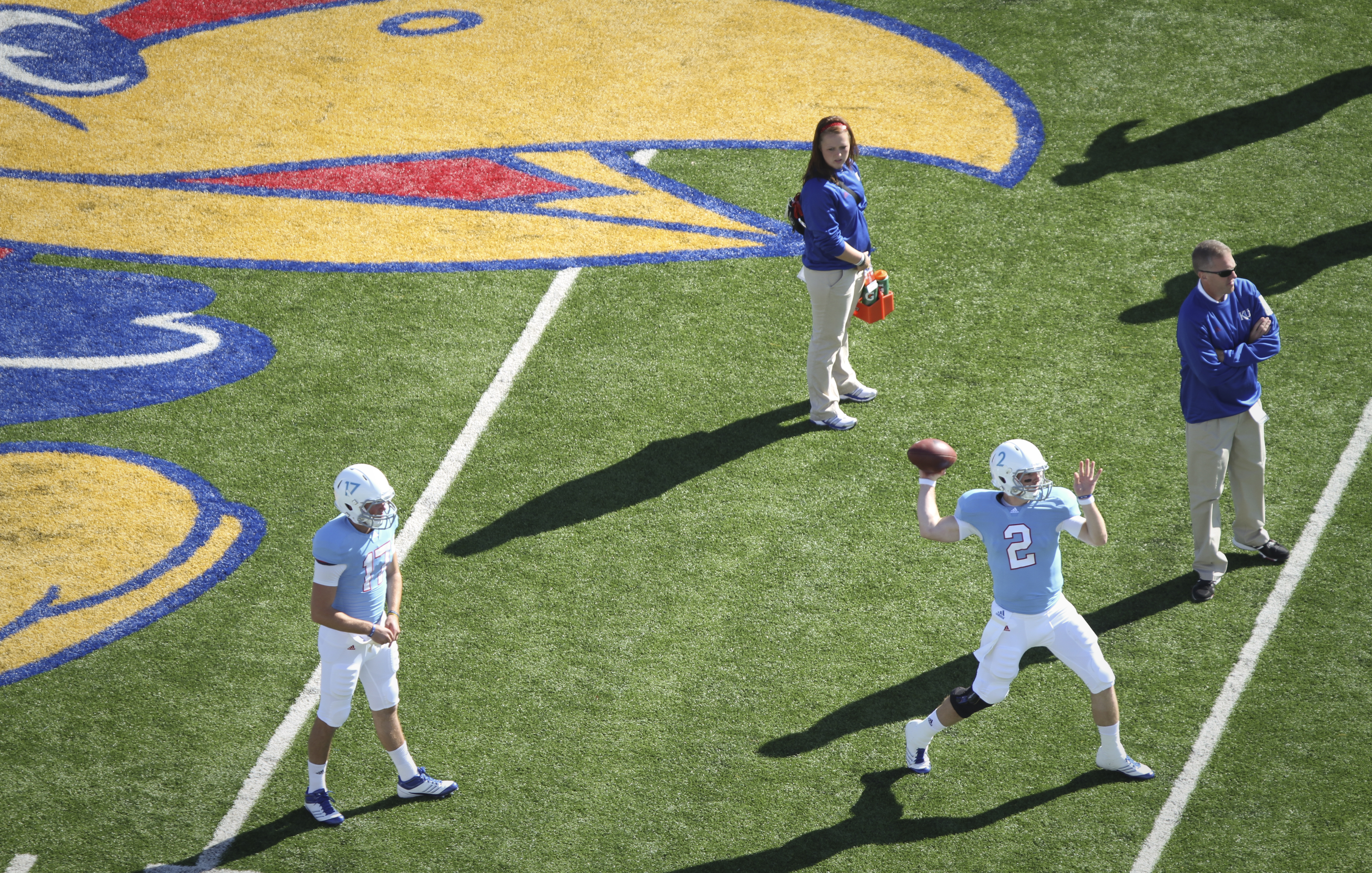 Kansas quarterback Jordan Webb throws during warmups before kickoff against Texas Tech on Saturday, Oct. 1, 2011 at Kivisto Field. The team is wearing throwback uniforms from the 1961 season.