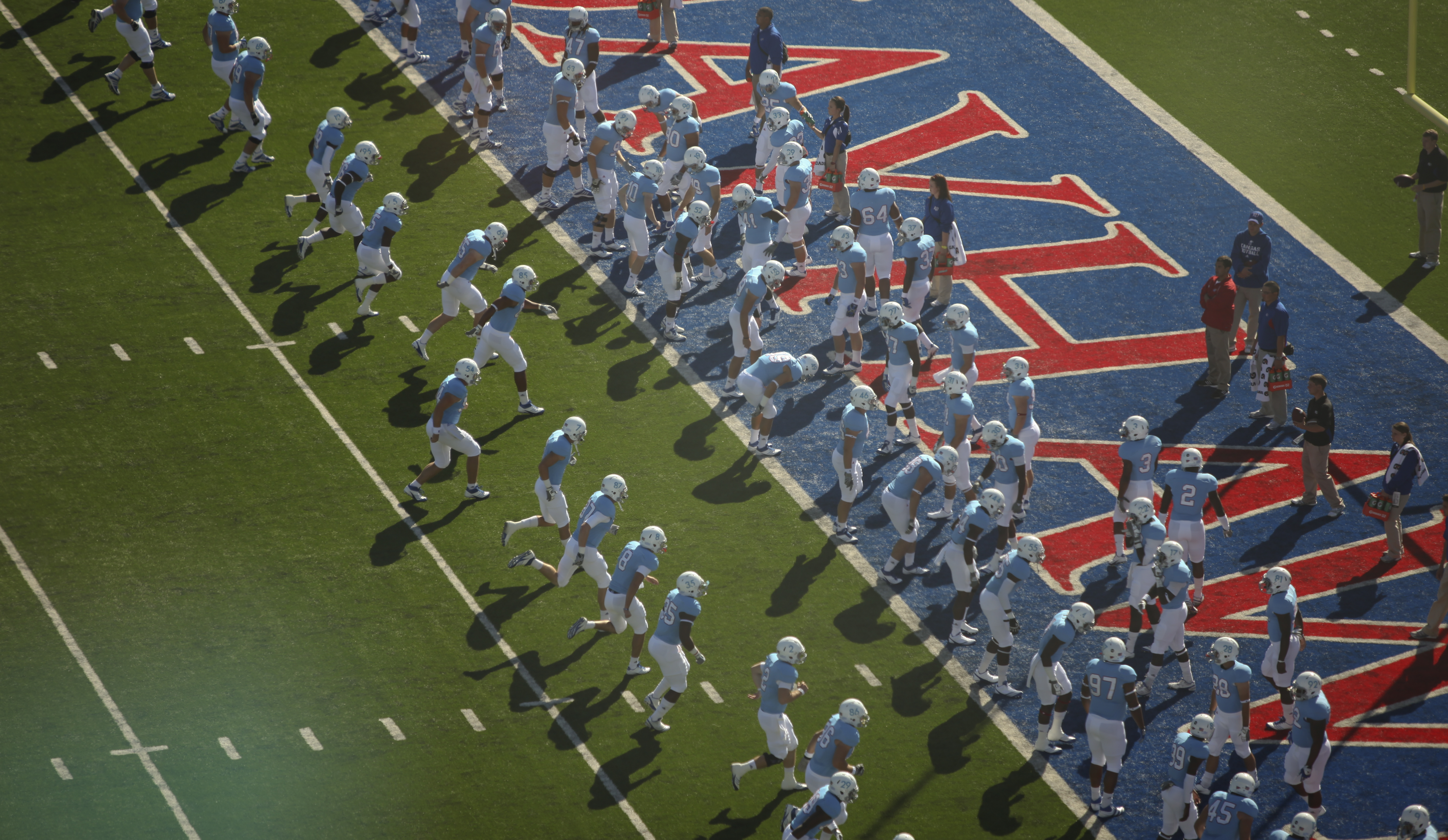 The Kansas Jayhawks warm up in their 1961 throwback uniforms before kicking off against Texas Tech on Saturday, Oct. 1, 2011.